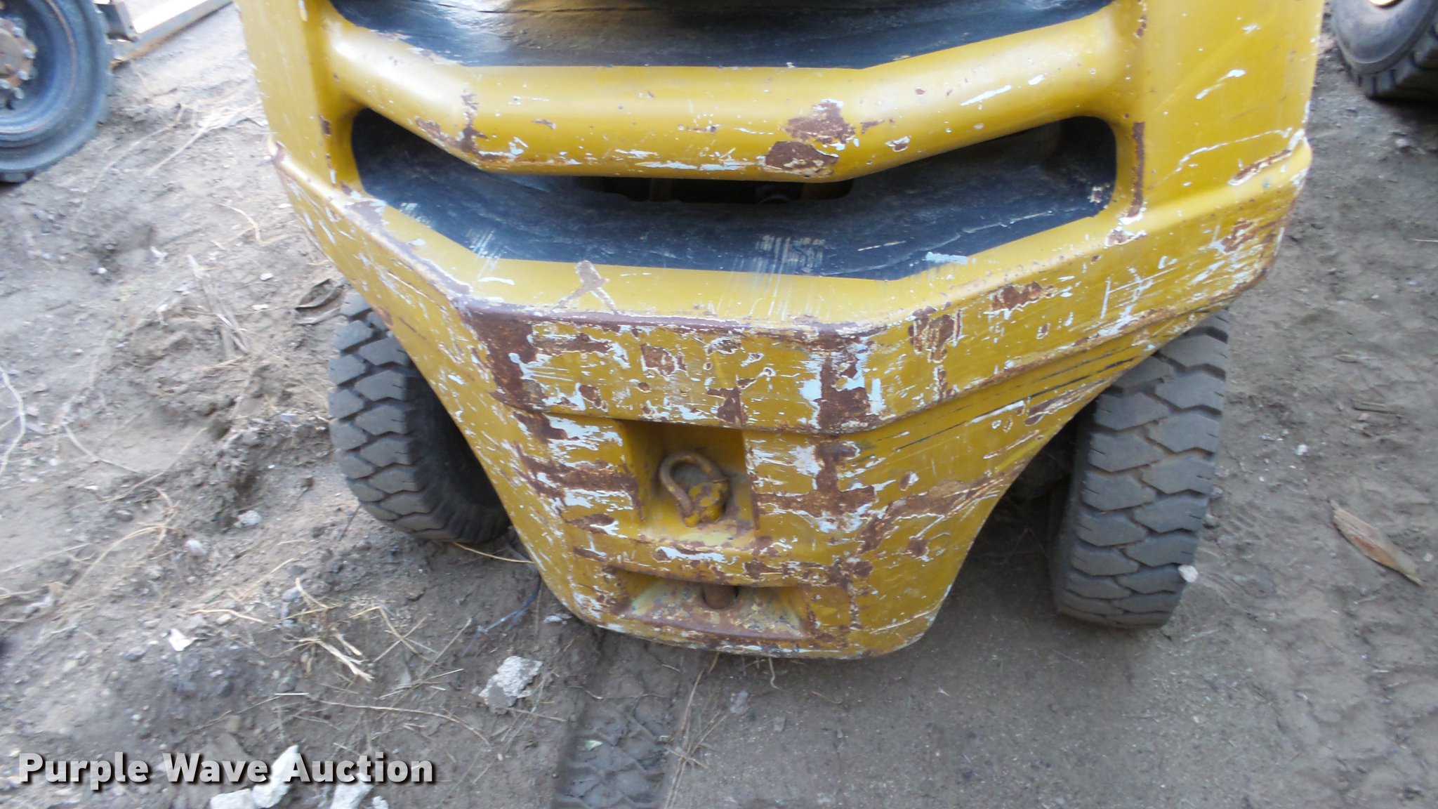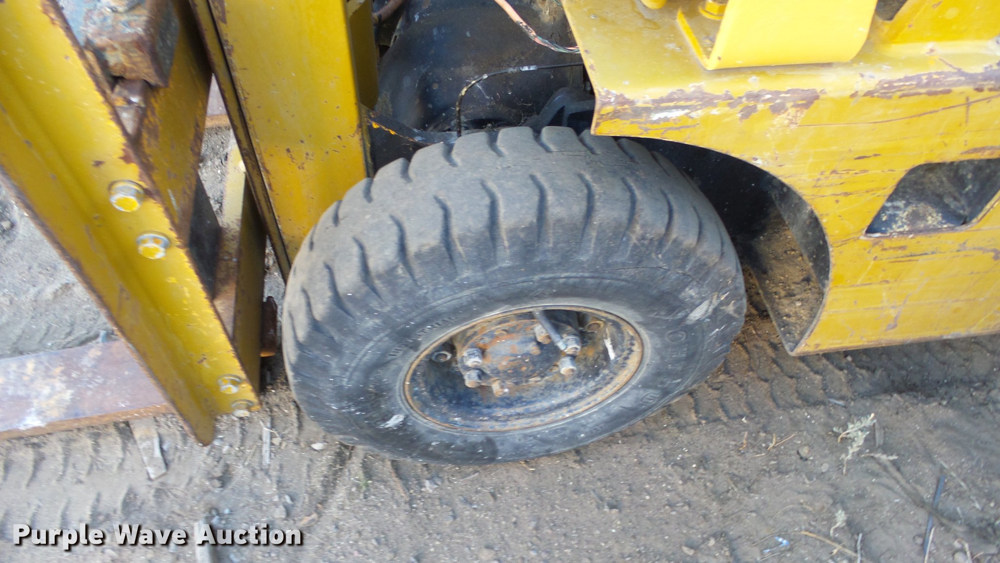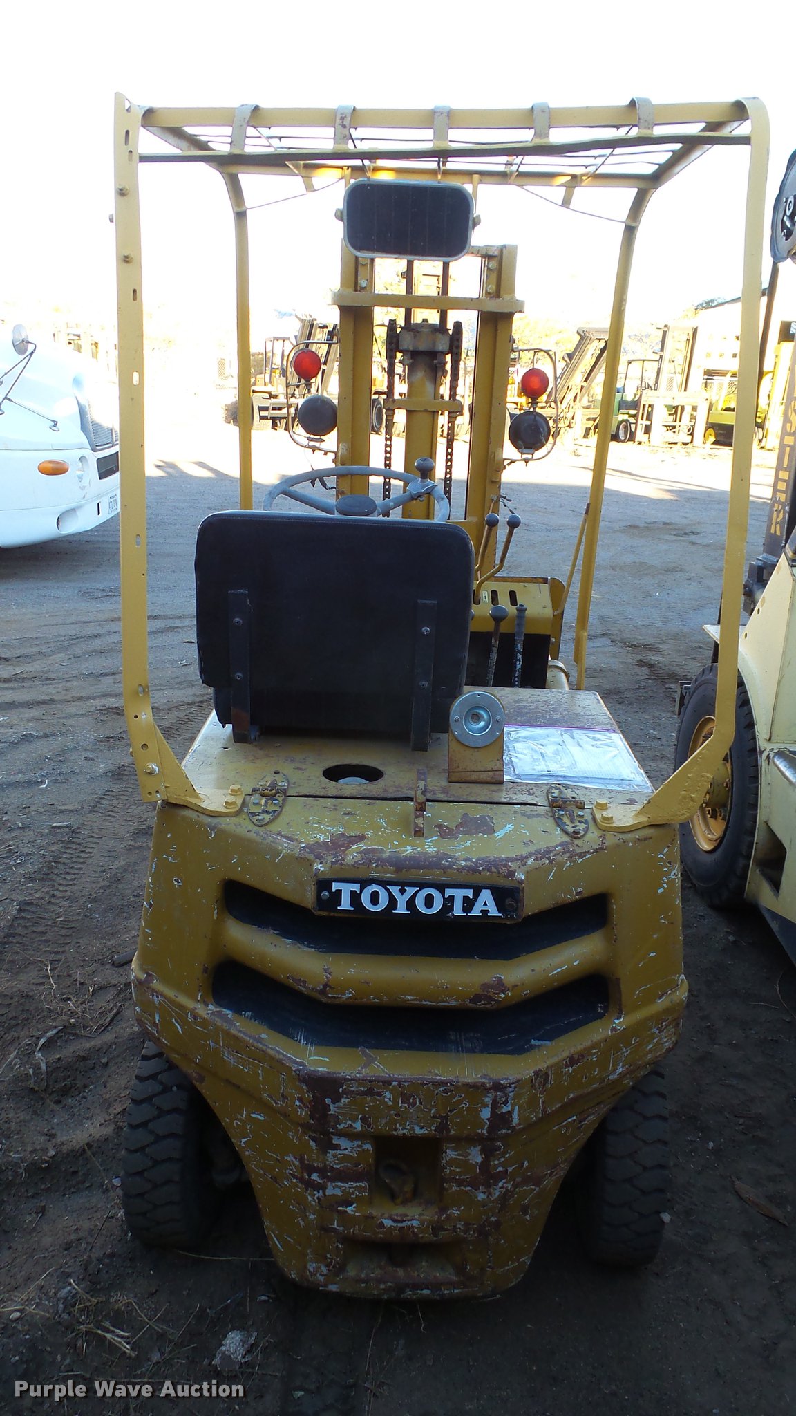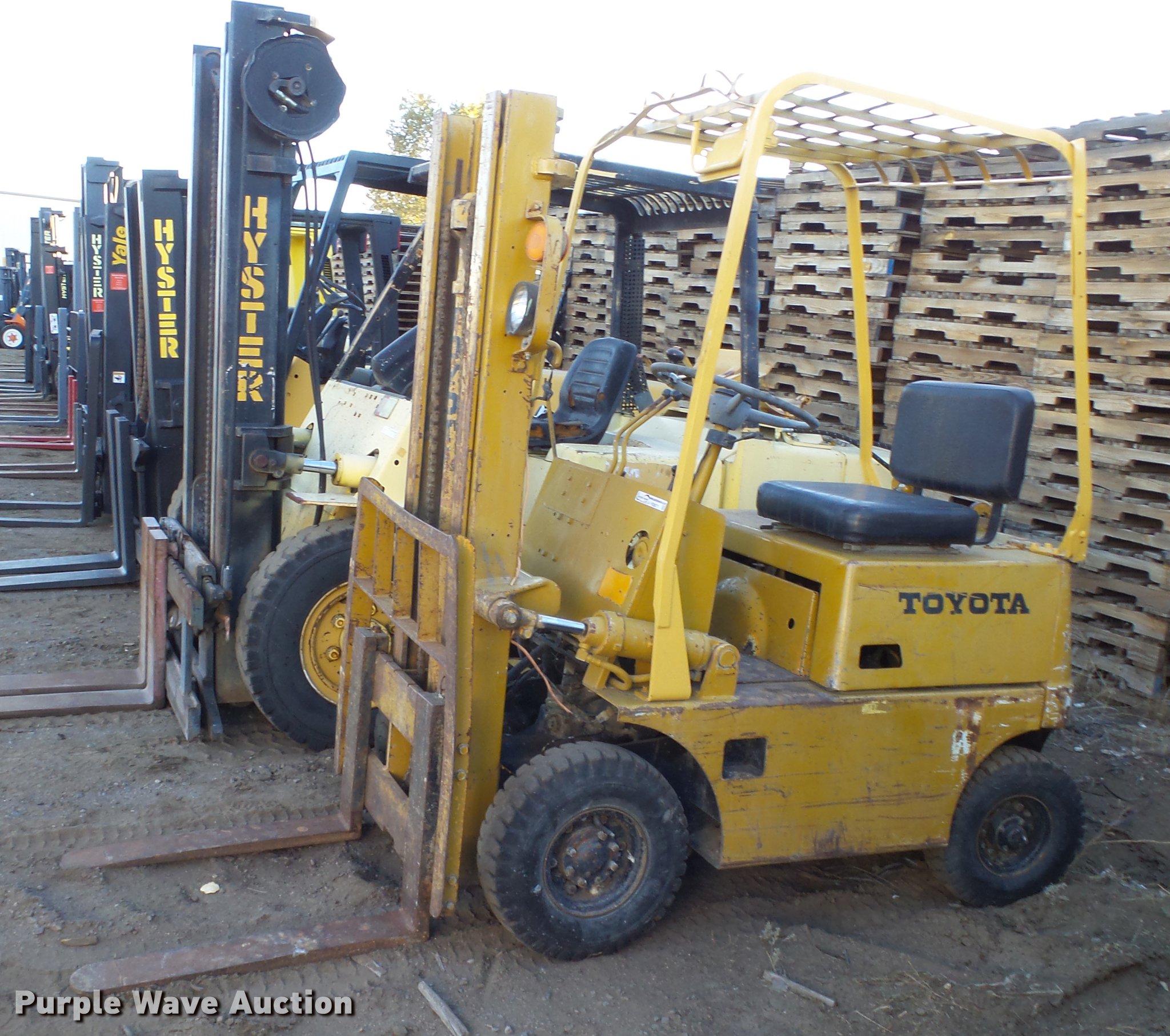 Purple Wave is selling a used Cushion Tire or Pneumatic Forklift in Nevada. This item is a Toyota forklift with the following: Unknown hours on meter, Four cylinder gas engine, Manual transmission, 2F-2R gears, OROPS, Two stage mast, Mast tilt, 30" fork length, 6.00-9 front tires, 5.00-8 rear tires, Serial 2FQ10-21112