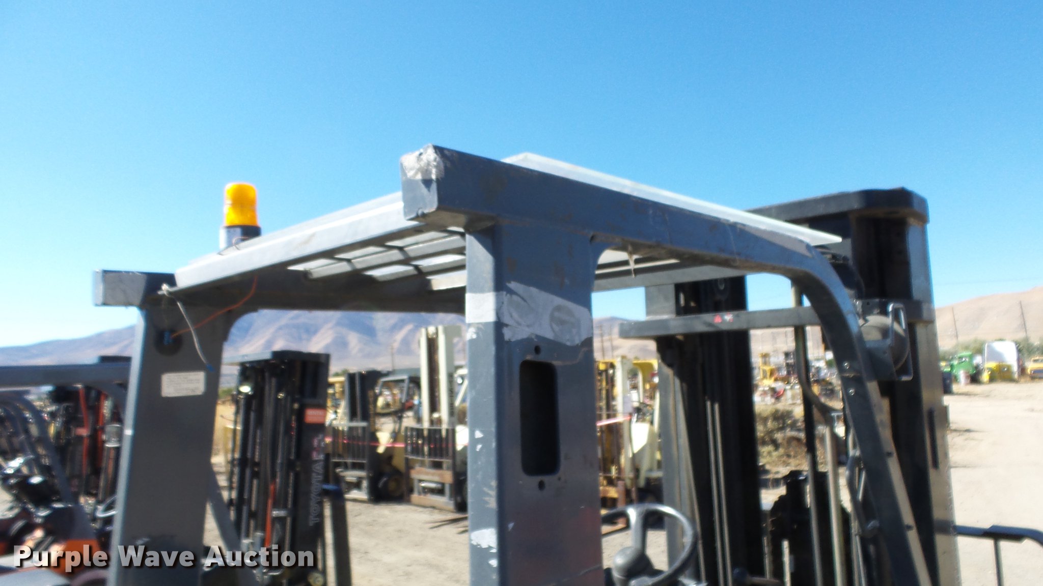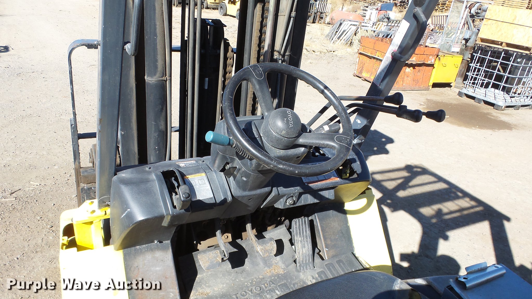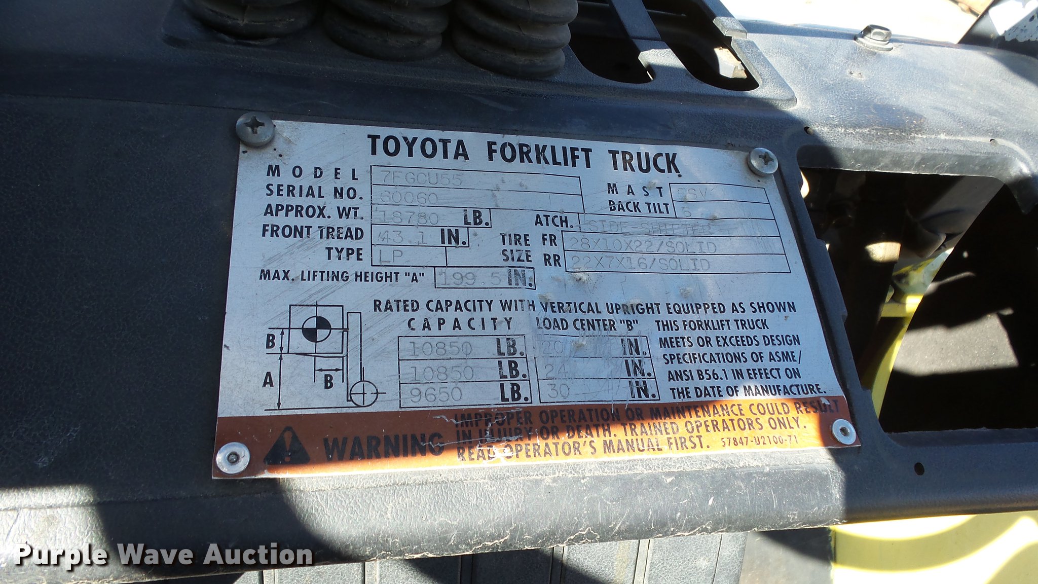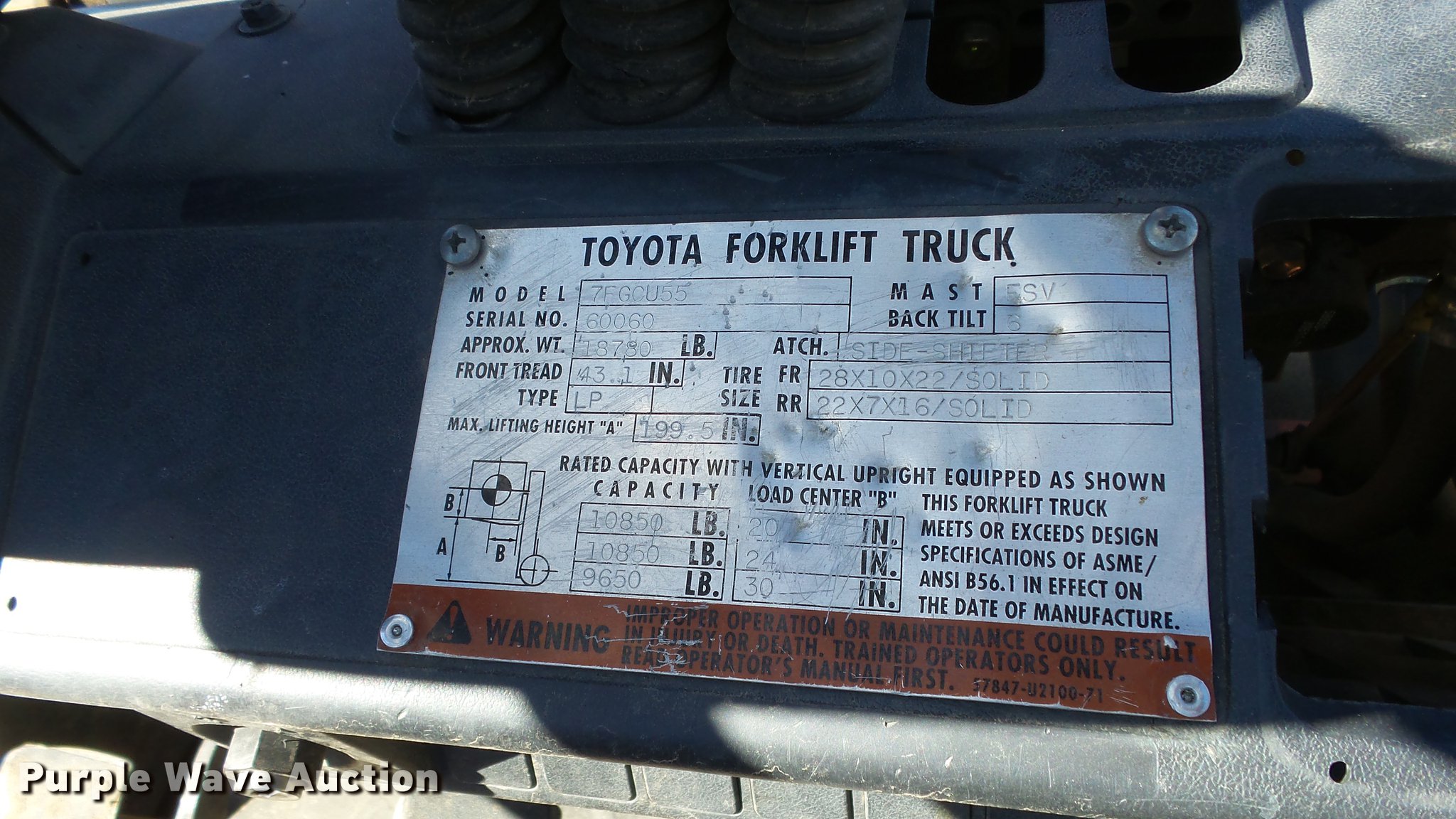 Purple Wave is selling a used Cushion Tire or Pneumatic Forklift in Nevada. This item is a Toyota 7FGCU55 forklift with the following: 18,994 hours on meter, GM Vortec six cylinder propane engine, Powershift transmission, 1F-1R gears, OROPS, Tilt, Work lights, 10,850 lbs max lift capacity, 199.5" max lift height, Three stage mast, Side shift, Mast tilt, 28x10x11 solid front tires, 22x7x16 solid rear tires, Approx. 18,780 lbs. base operating weight, Propane tank not included, Serial 60060