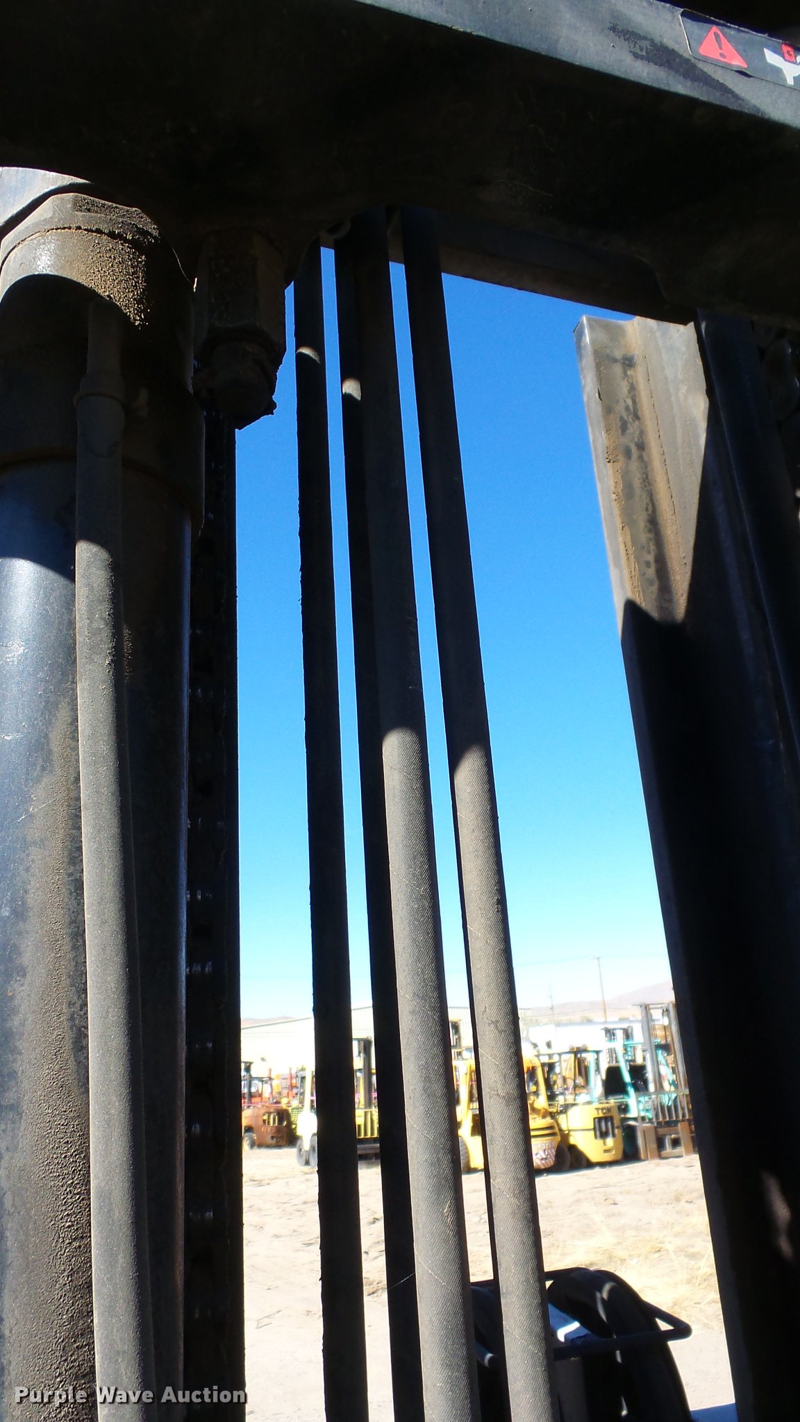 Toyota 7FGCU55 forklift. 18,994 hours on meter, GM Vortec six cylinder propane engine, Powershift transmission 1F-1R gears, OROPS, Tilt, Work lights, 10,850 lbs max lift capacity, 199.5" max lift height, Three stage mast Side shift, Mast tilt, 28x10x11 solid front tires, 22x7x16 solid rear tires, Approx. 18,780 lbs. base operating weight, Propane tank not included, Serial 60060. Nevada Forklift Sales - Open inspection Nov. 16 and Dec. 5. 13951 Mt Bismark St. Reno, NV 89506