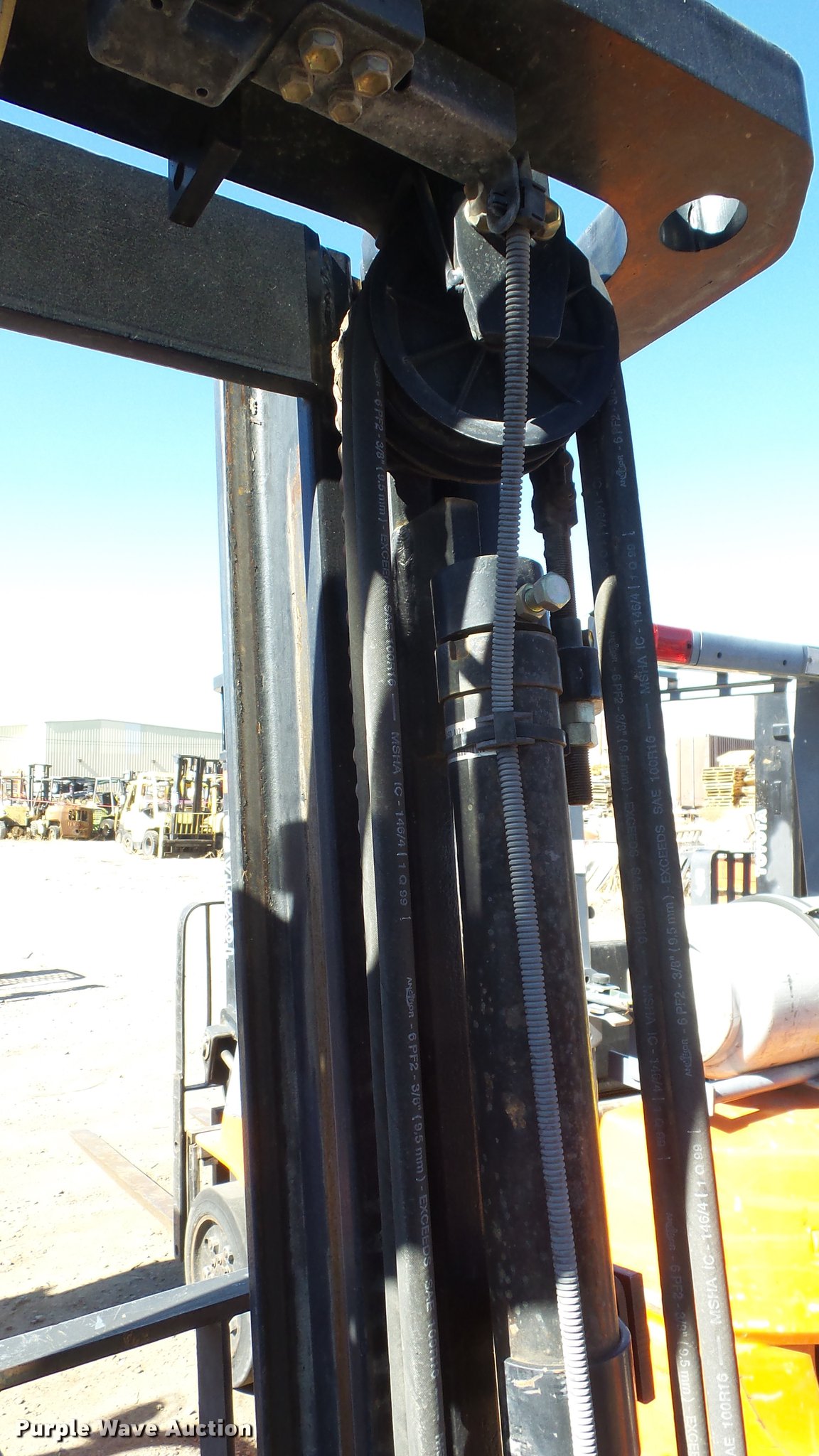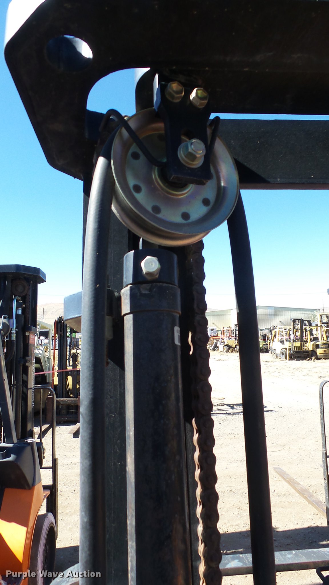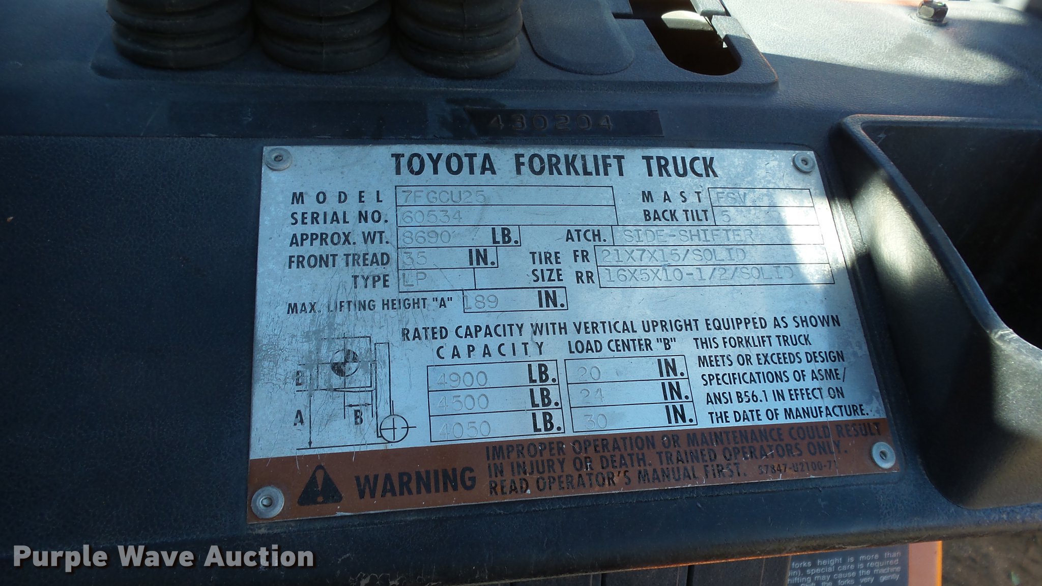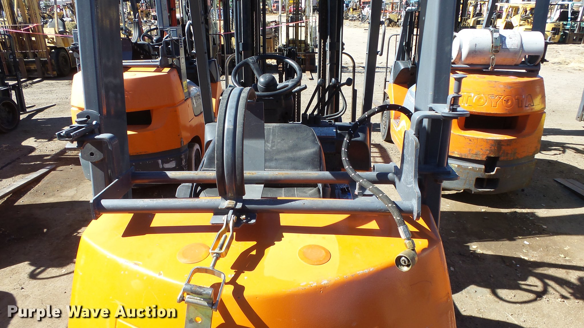 Purple Wave is selling a used Cushion Tire or Pneumatic Forklift in Nevada. This item is a Toyota 7FGCU25 forklift with the following: 14,532 hours on meter, Four cylinder propane engine, Powershift transmission, 1F-1R gears, OROPS, Tilt, Work lights, 4,900 lbs max lift capacity, 189" max lift height, Three stage mast, Side shift, Mast tilt, 42" fork length, Hole in one fork, 21x7x15 solid front tires, 16x5x10 1/2 solid rear tires, Approx. 8,690 lbs. base operating weight, Propane tank not included, Serial 60534