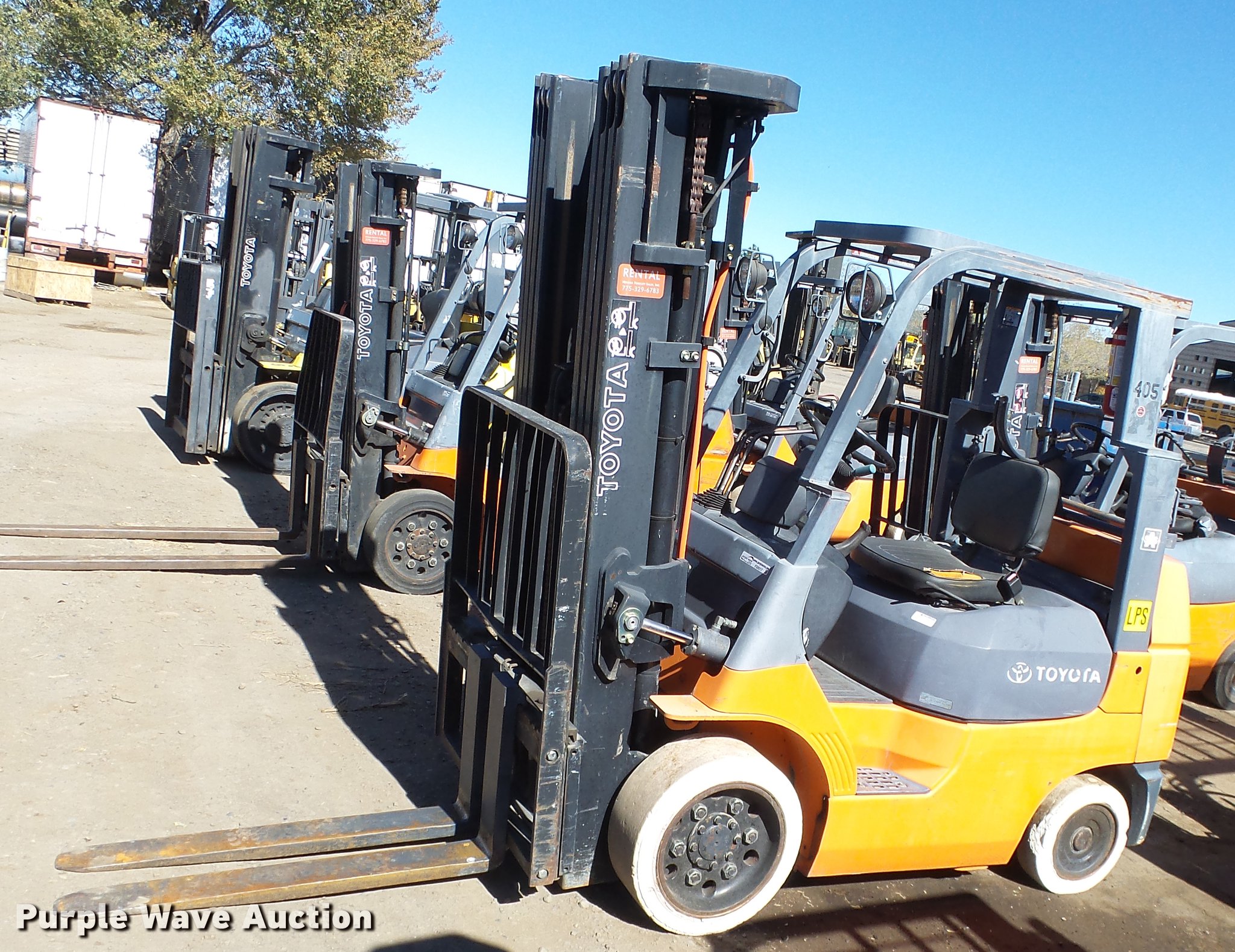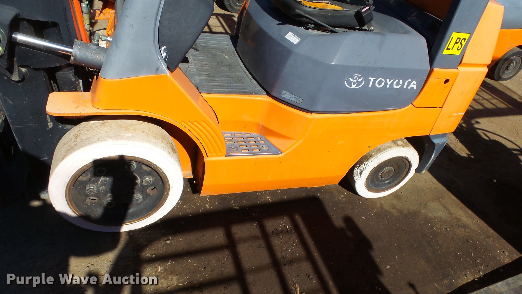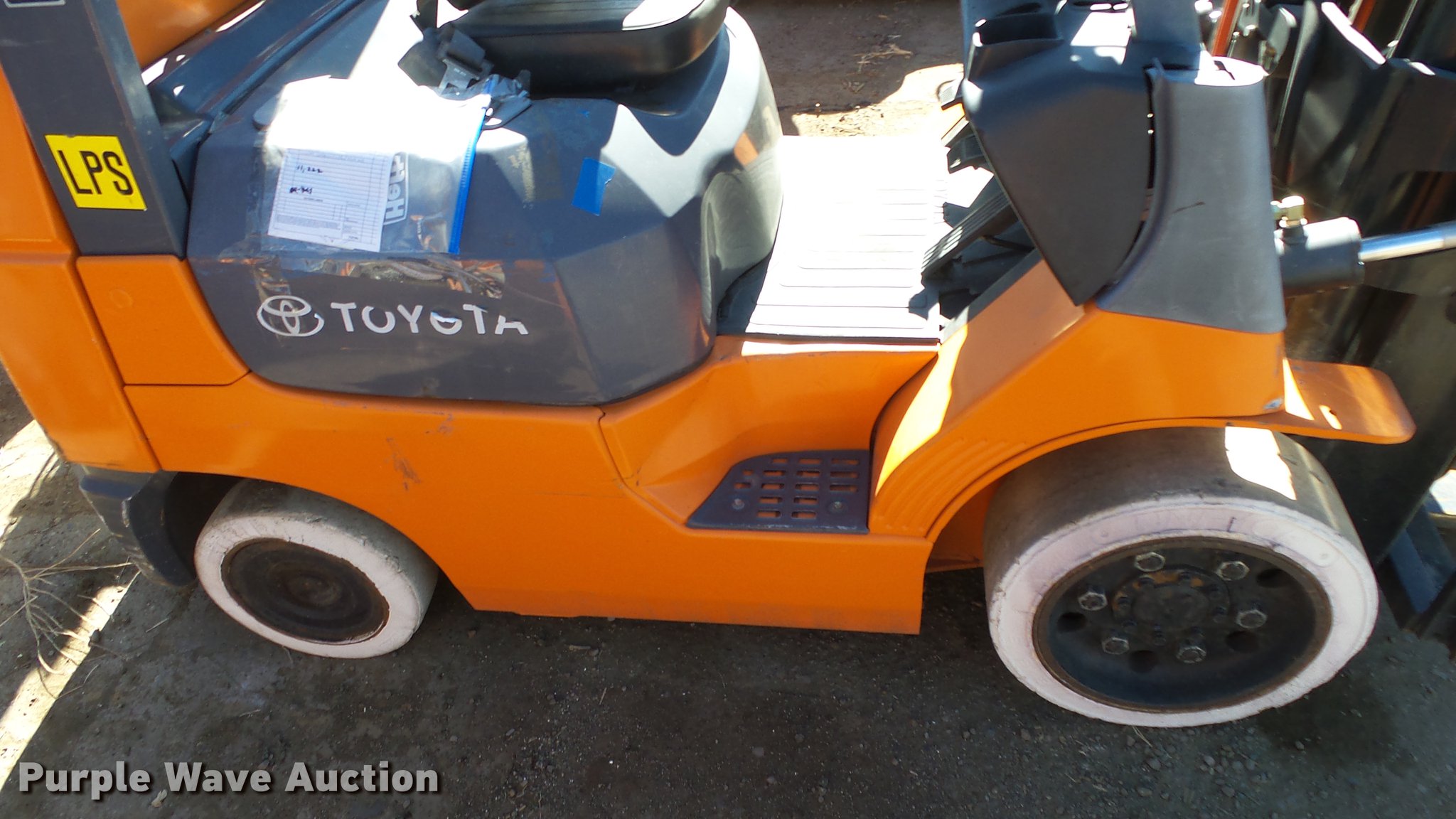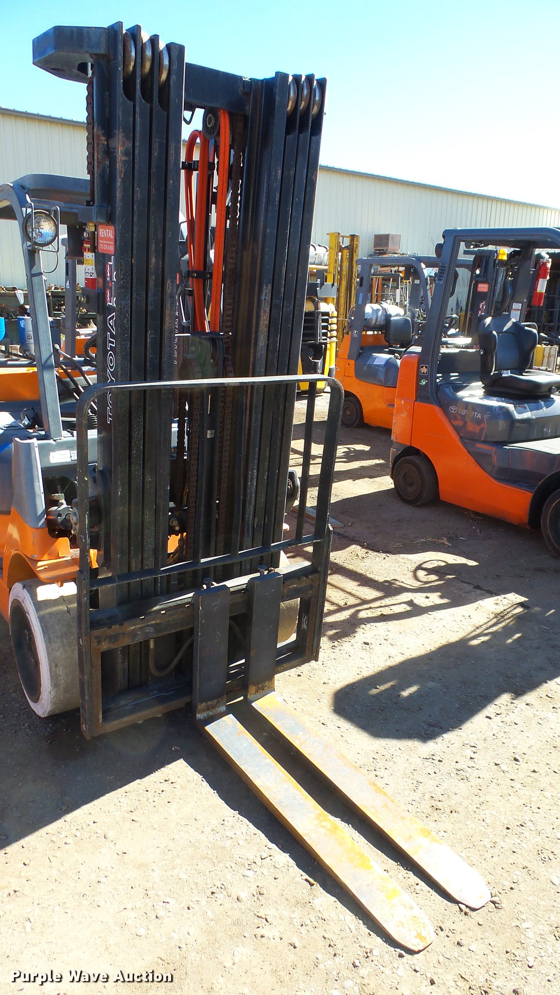Purple Wave is selling a used Cushion Tire or Pneumatic Forklift in Nevada. This item is a Toyota forklift with the following: 11,222 hours on meter, Four cylinder propane engine, Powershift transmission, 1F-1R gears, OROPS, Tilt, Work lights, 5,500 lbs max lift capacity, Four stage mast, Mast tilt, 42" fork length, 21x8x15 solid non-marking front tires, 16x5x10 1/2 solid rear tires, Propane bottle not included
