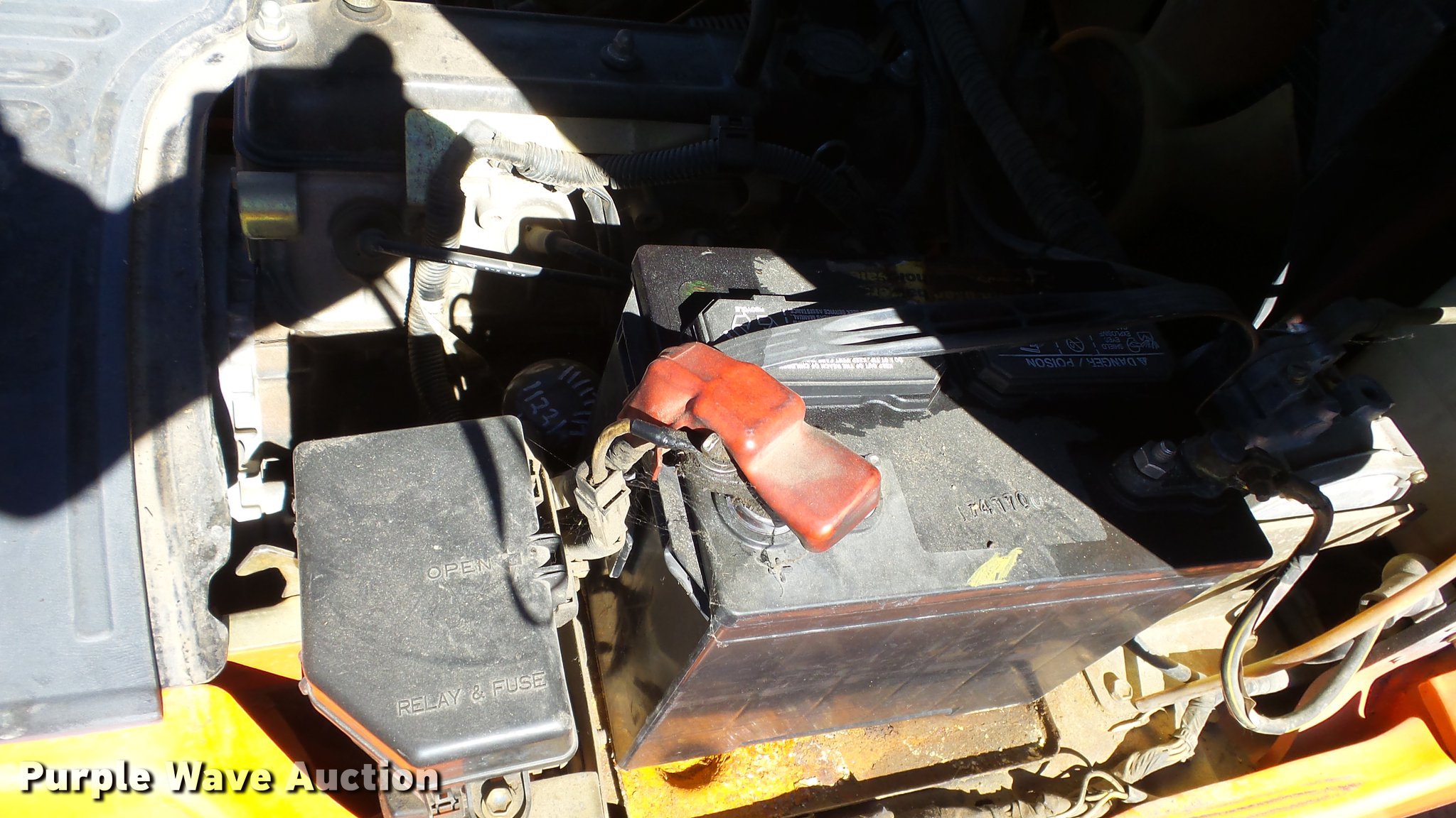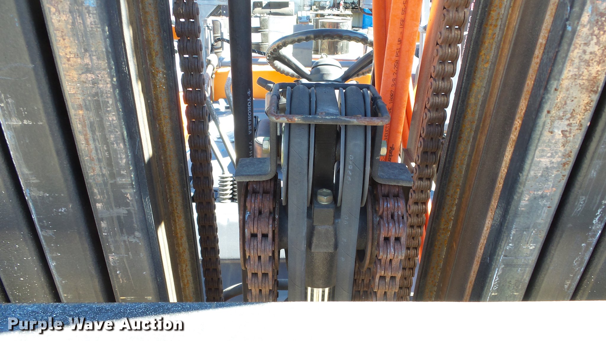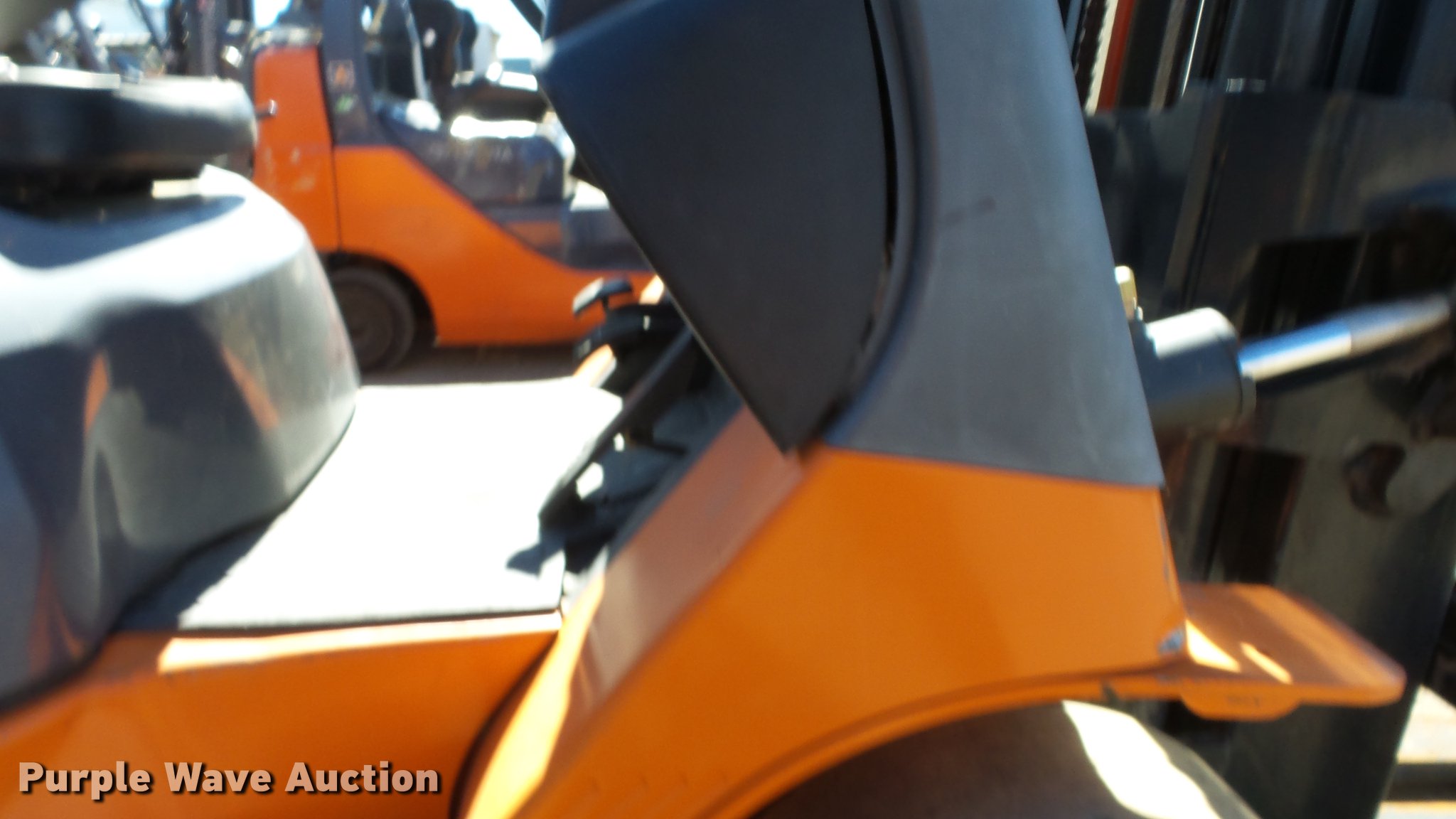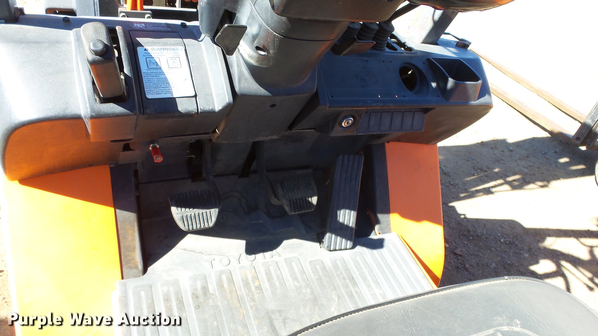 Purple Wave is selling a used Cushion Tire or Pneumatic Forklift in Nevada. This item is a Toyota forklift with the following: 11,222 hours on meter, Four cylinder propane engine, Powershift transmission, 1F-1R gears, OROPS, Tilt, Work lights, 5,500 lbs max lift capacity, Four stage mast, Mast tilt, 42" fork length, 21x8x15 solid non-marking front tires, 16x5x10 1/2 solid rear tires, Propane bottle not included