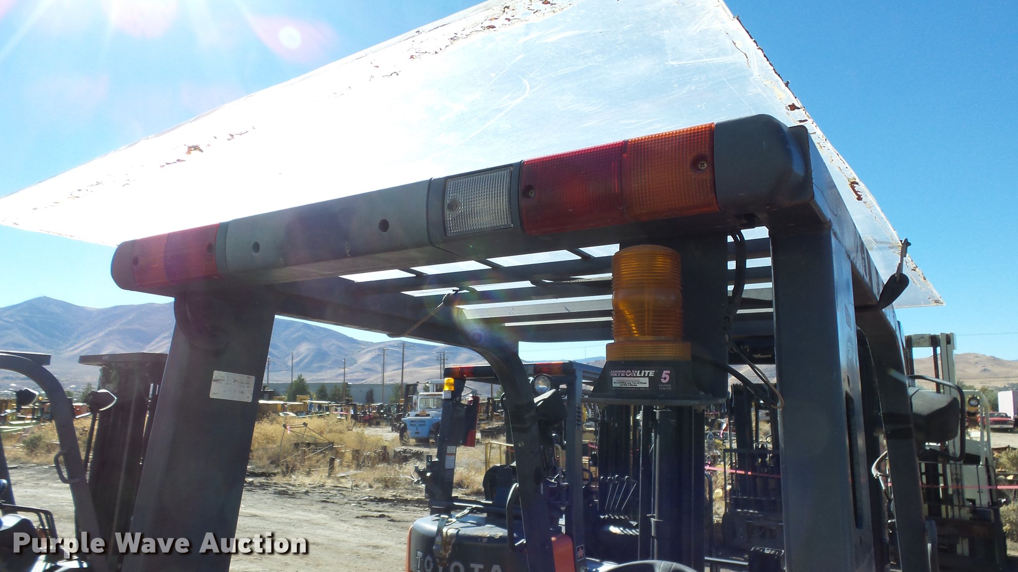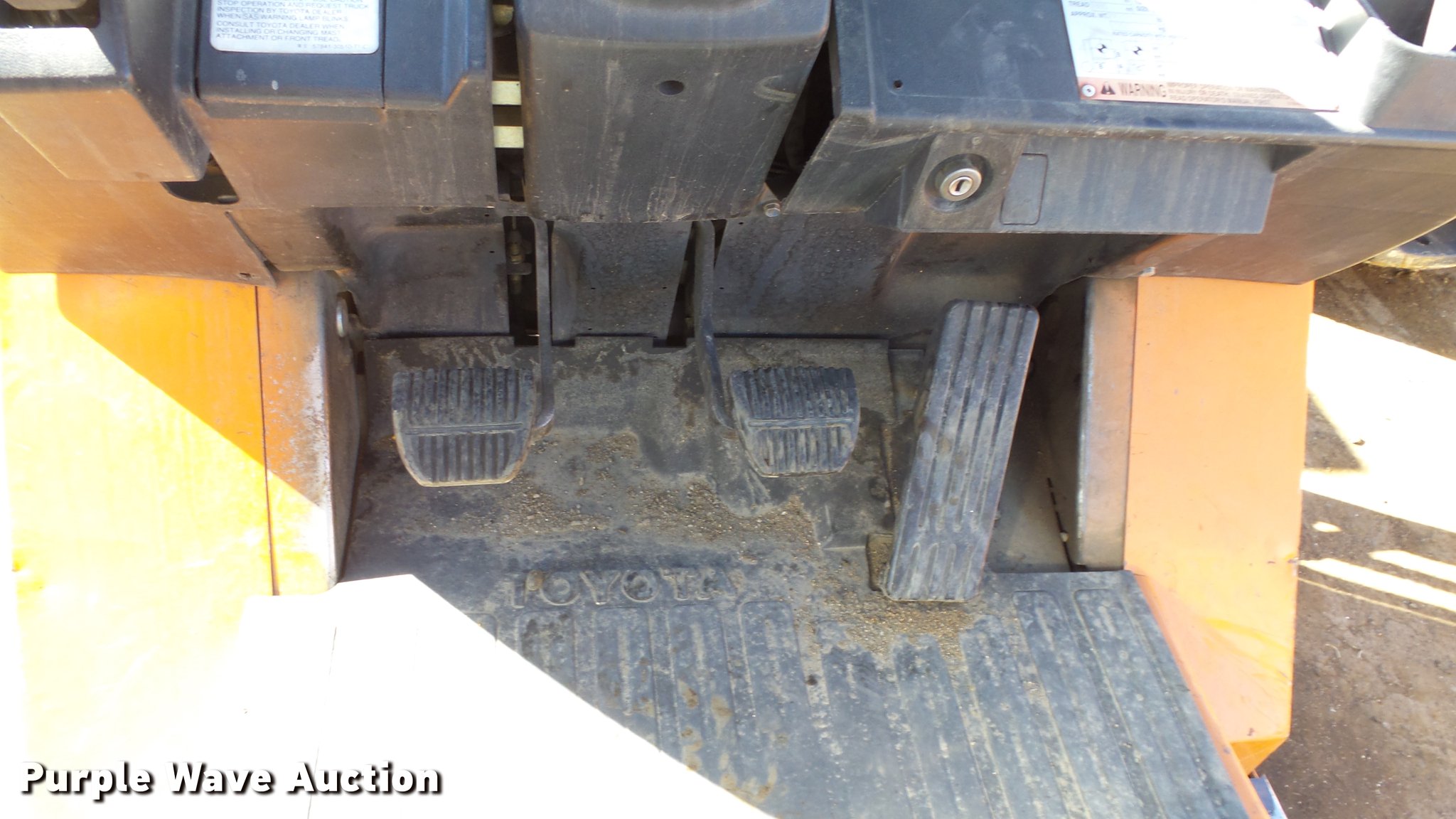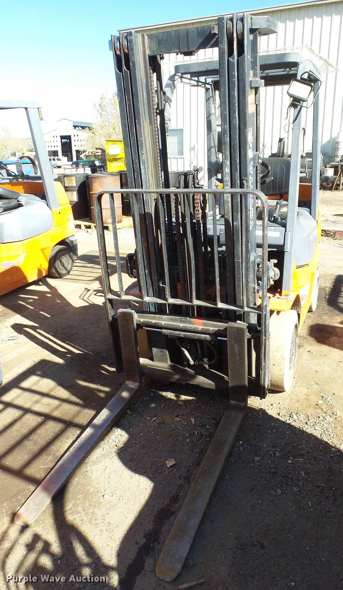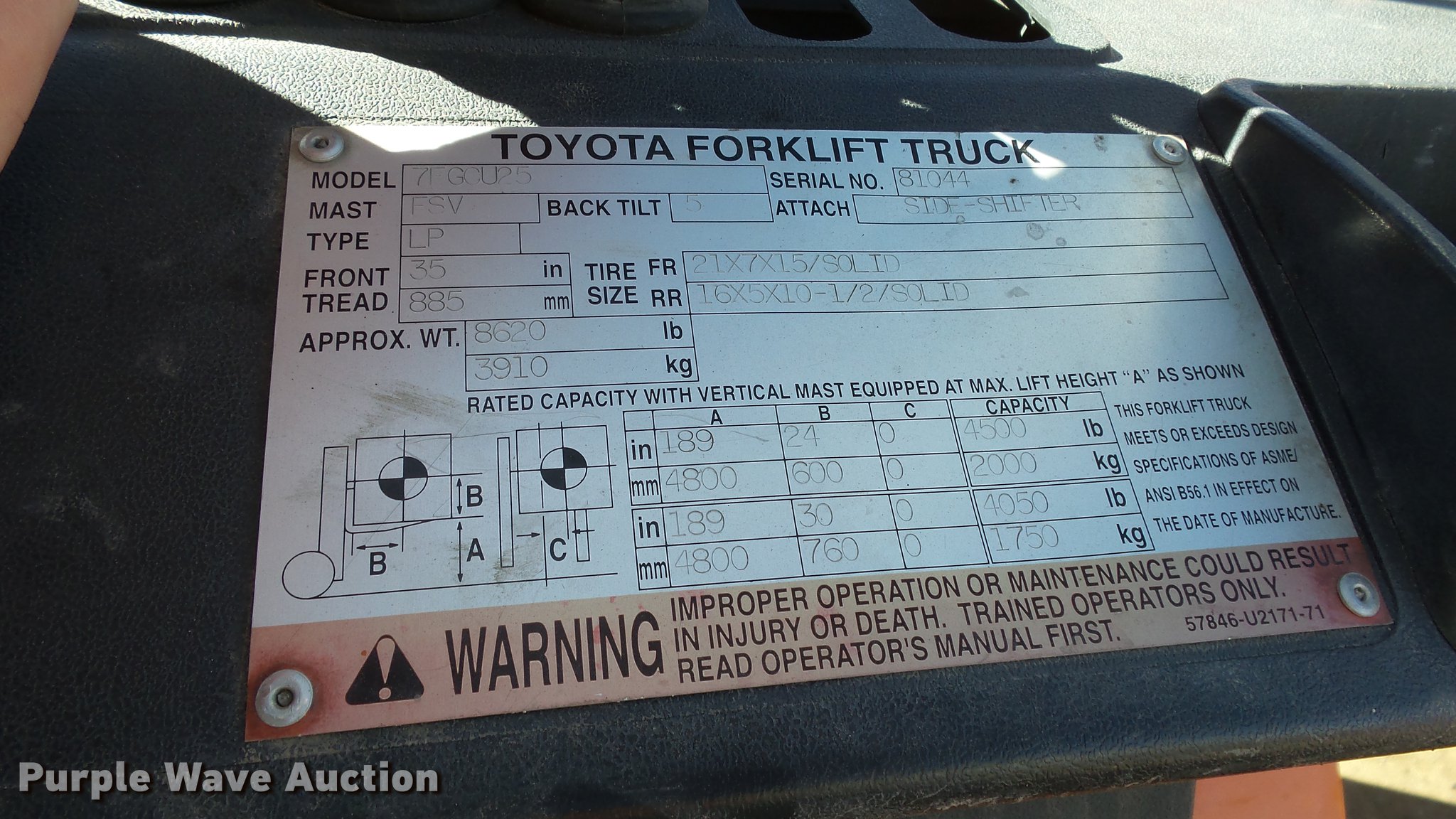Purple Wave is selling a used Cushion Tire or Pneumatic Forklift in Nevada. This item is a Toyota 7FGCU25 forklift with the following: 11,235 hours on meter, Toyota 2.237L four cylinder propane engine, Powershift transmission, 1F-1R gears, OROPS, Tilt, Work lights, 4,800 lbs max lift capacity, 189" max lift height, Three stage mast, Side shift, Mast tilt, 42" fork length, 21x7x15 solid non-marking front tires, 16x5x10 1/2 solid non-marking rear tires, Approx. 8,620 lbs. base operating weight, Propane bottle not included, Serial 81044