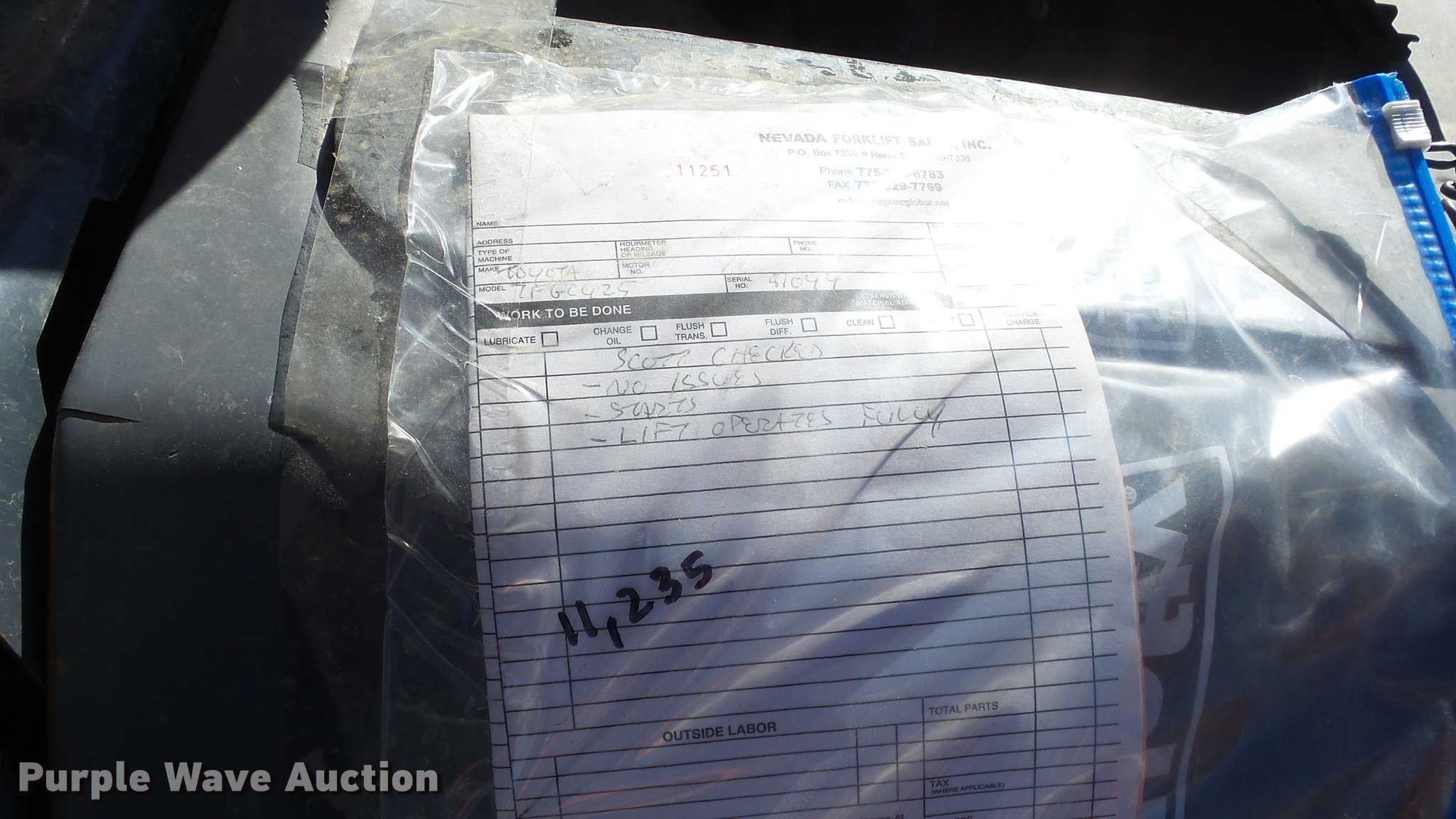 Toyota 7FGCU25 forklift. 11,235 hours on meter, Toyota 2.237L four cylinder propane engine, Powershift transmission 1F-1R gears, OROPS, Tilt, Work lights, 4,800 lbs max lift capacity, 189" max lift height, Three stage mast Side shift, Mast tilt, 42" fork length, 21x7x15 solid non-marking front tires, 16x5x10 1/2 solid non-marking rear tires, Approx. 8,620 lbs. base operating weight, Propane bottle not included, Serial 81044. Nevada Forklift Sales - Open inspection Nov. 16 and Dec. 5. 13951 Mt Bismark St. Reno, NV 89506