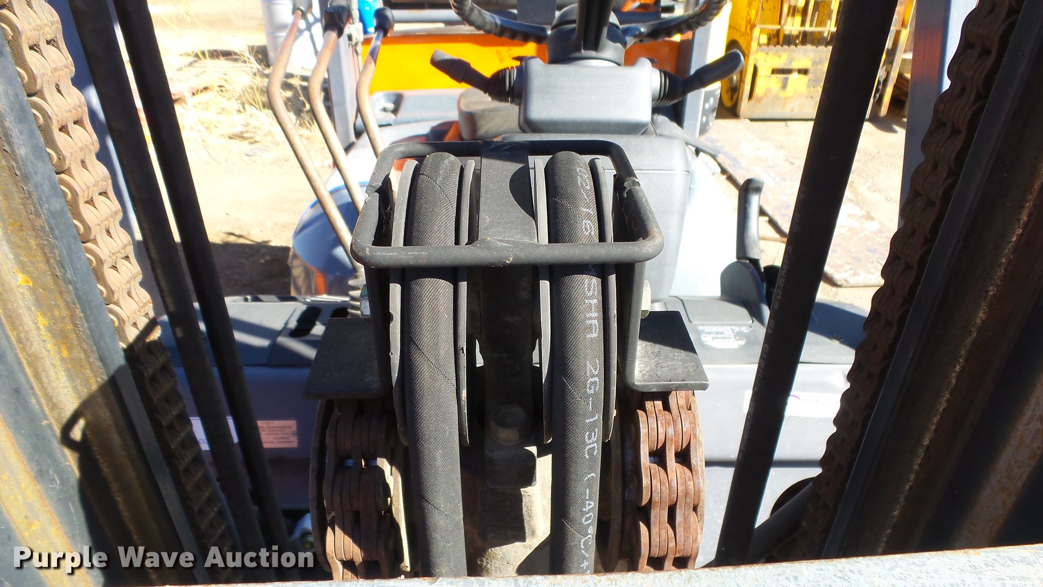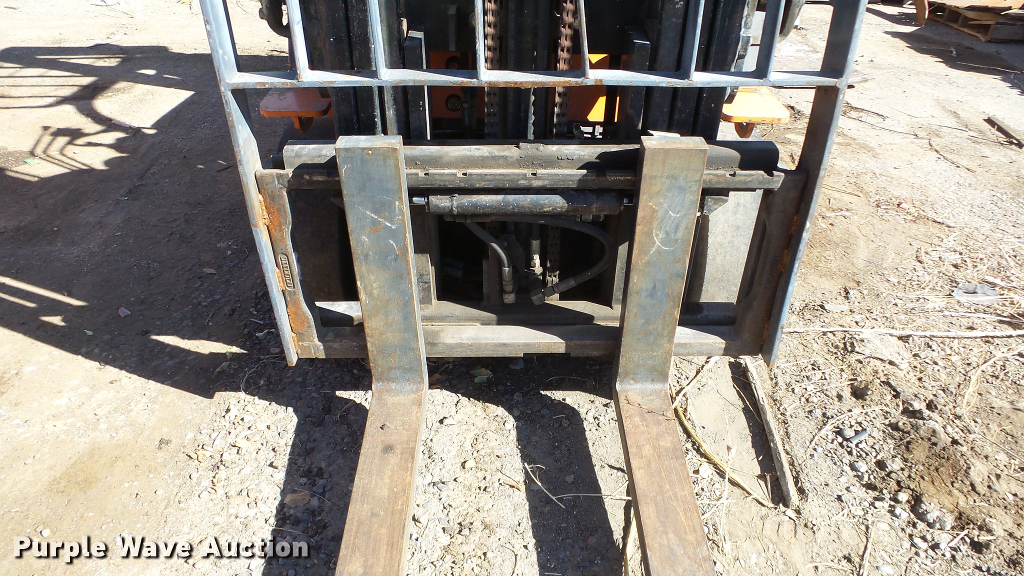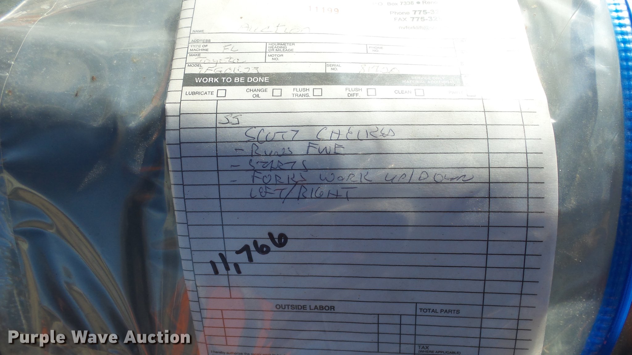 Purple Wave is selling a used Cushion Tire or Pneumatic Forklift in Nevada. This item is a Toyota 7FGCU25 forklift with the following: 11,766 hours on meter, Toyota 2.237L four cylinder propane engine, Powershift transmission, 1F-1R gears, OROPS, Tilt, Work lights, 4,800 lbs max lift capacity, 189" max lift height, Three stage mast, Side shift, Mast tilt, 72" fork length, 21x7x15 solid front tires, 16x5x10 1/2 solid rear tires, Approx. 8,560 lbs. base operating weight, Propane bottle not included, Serial 81720