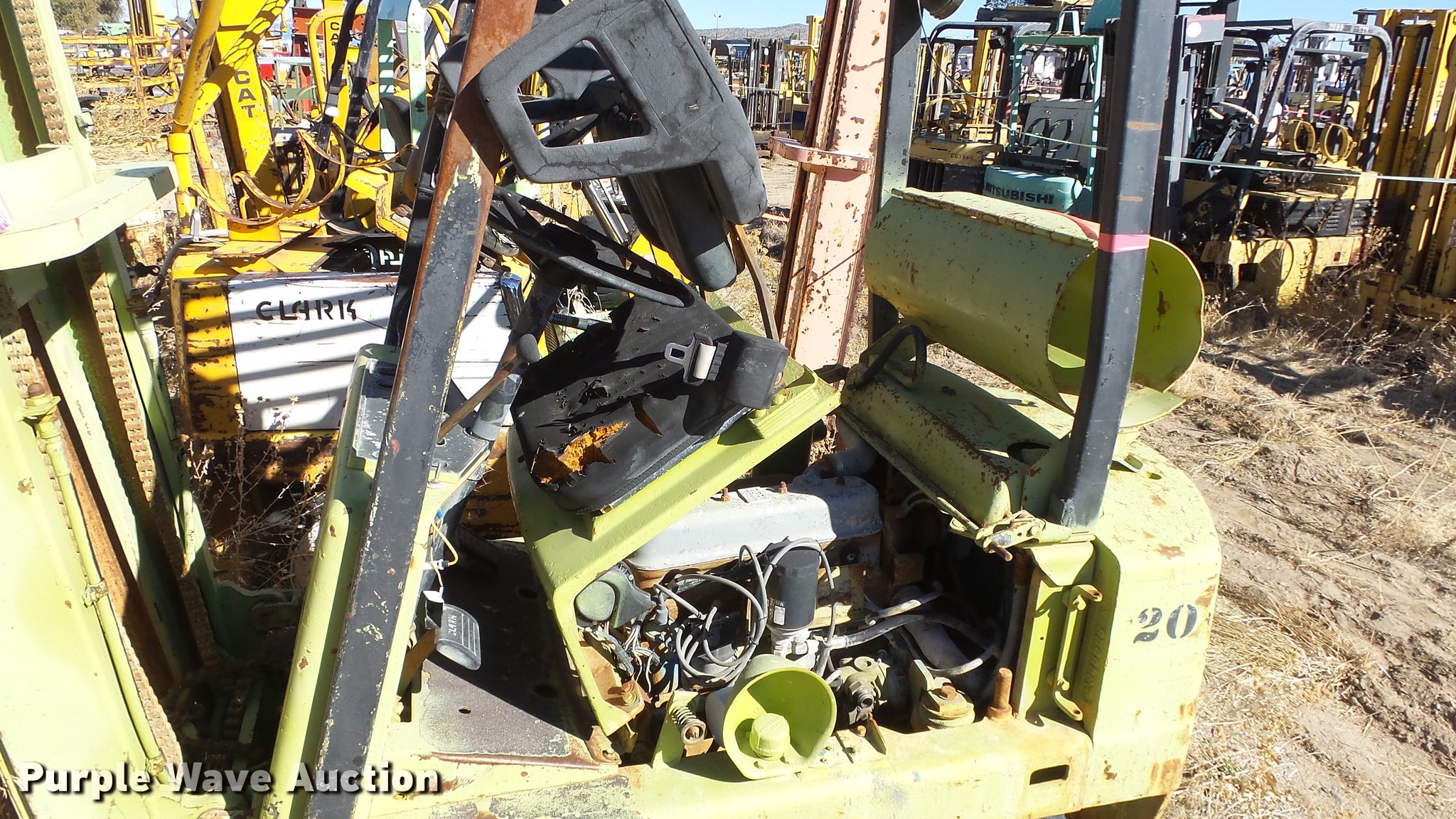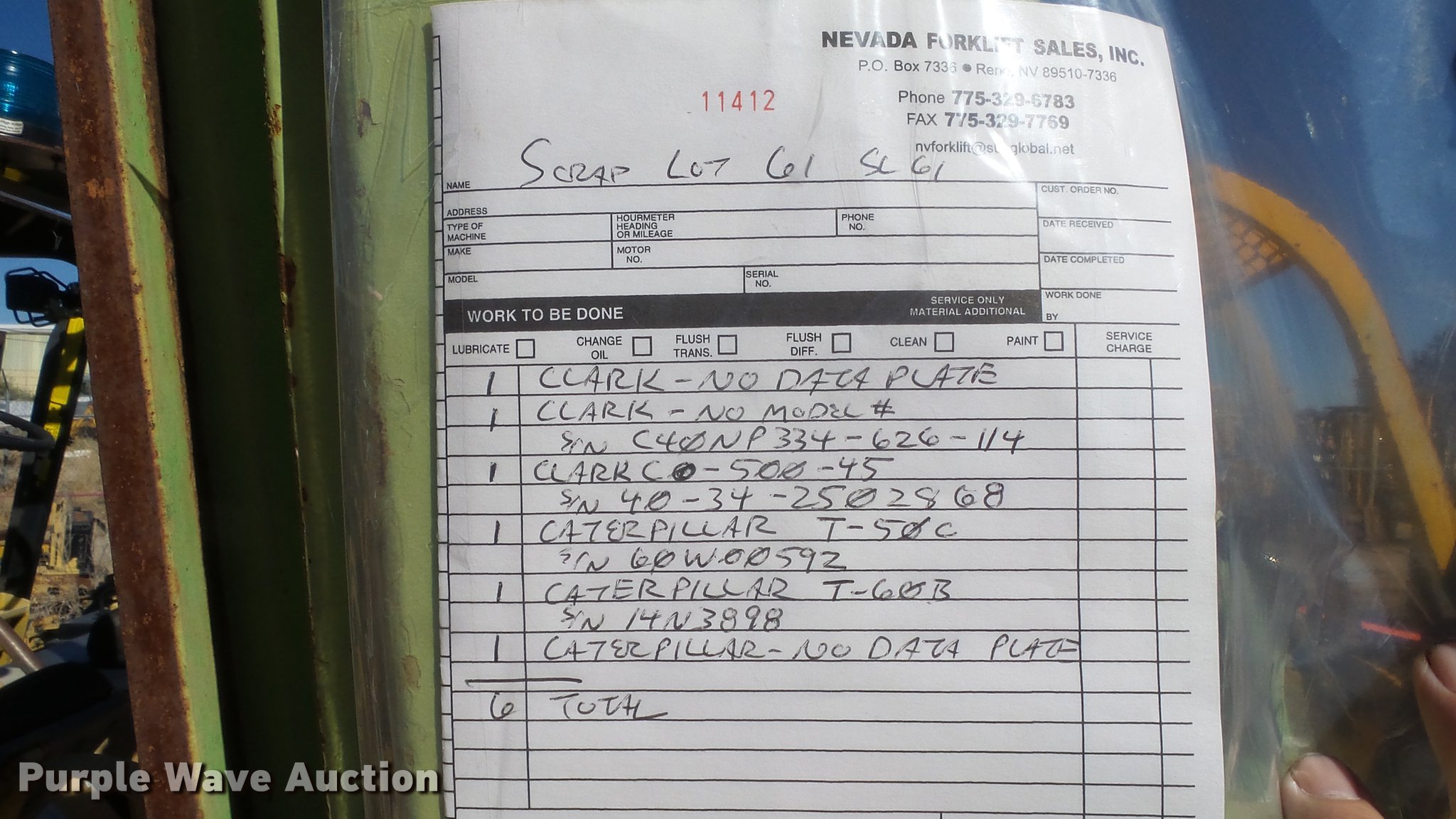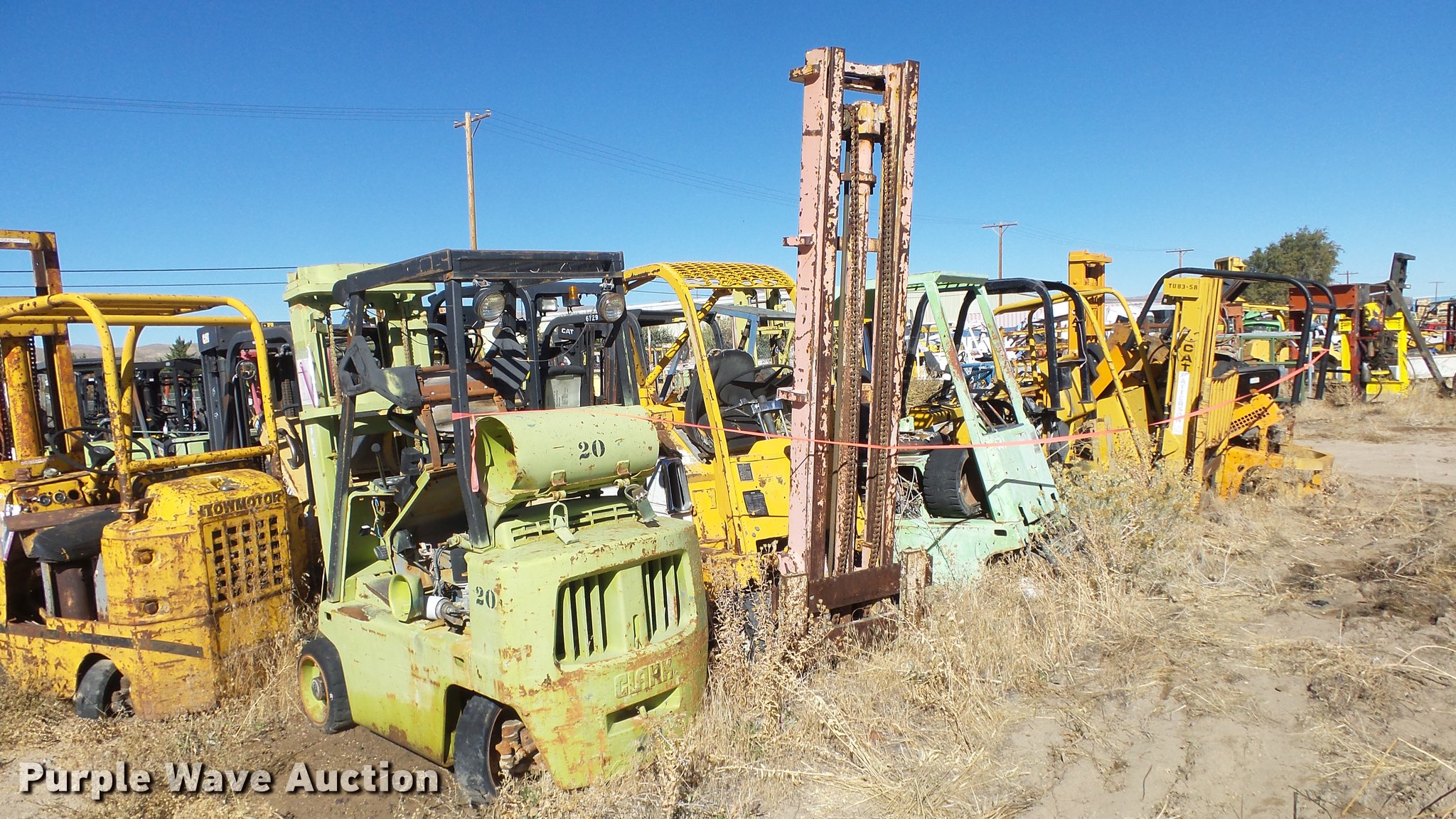 Purple Wave is selling a used Cushion Tire or Pneumatic Forklift in Nevada. This item is a (6) salvage forklifts with the following: Clark, Clark, Serial C40NP334-626-114, Clark C0-500-45, Serial 40-34-2502868, Caterpillar T-50C, Serial 60W00592, Caterpillar T-60B, Serial 14N3898, Caterpillar, Non-operational units, parts missing