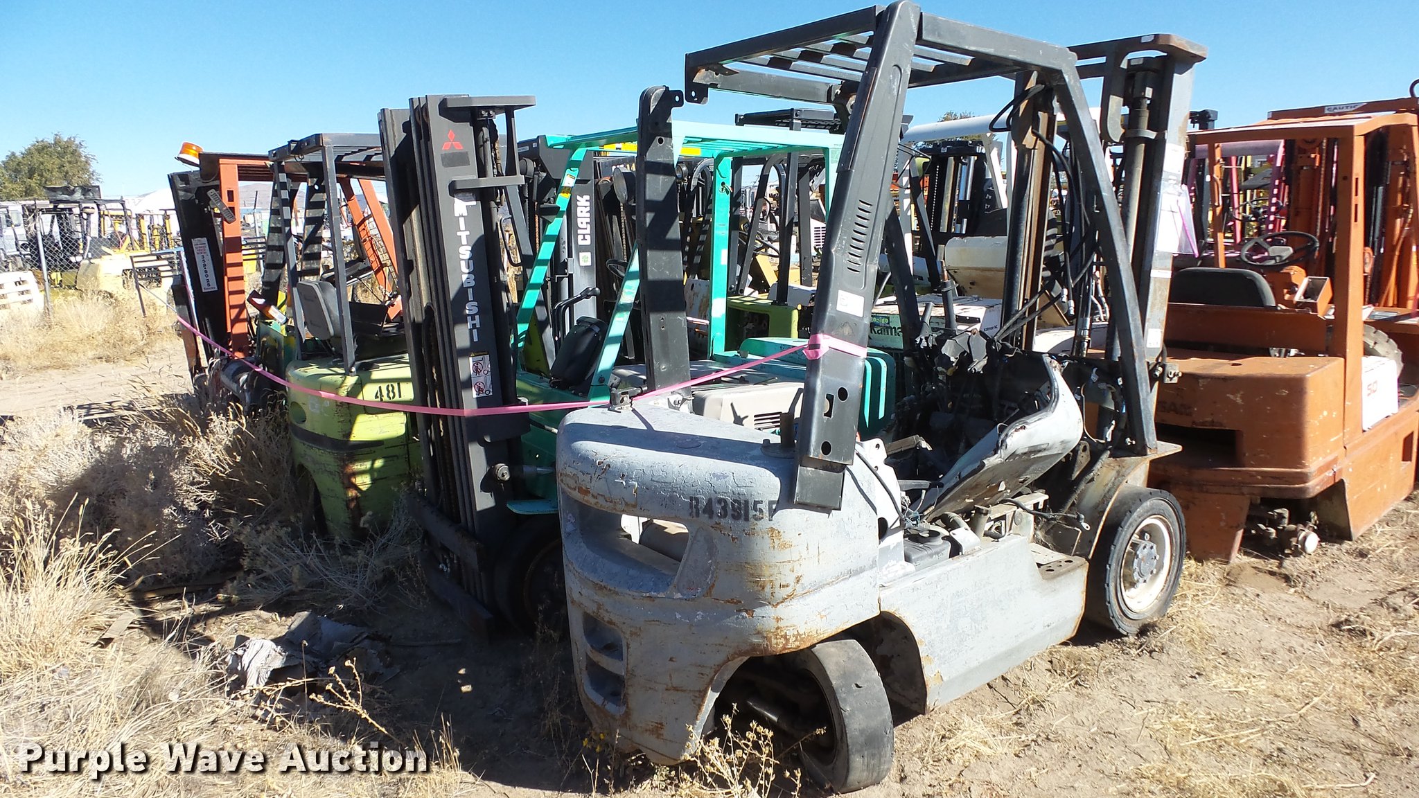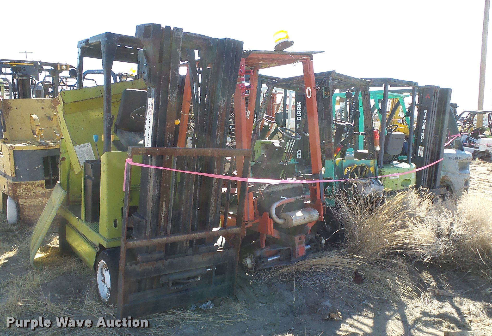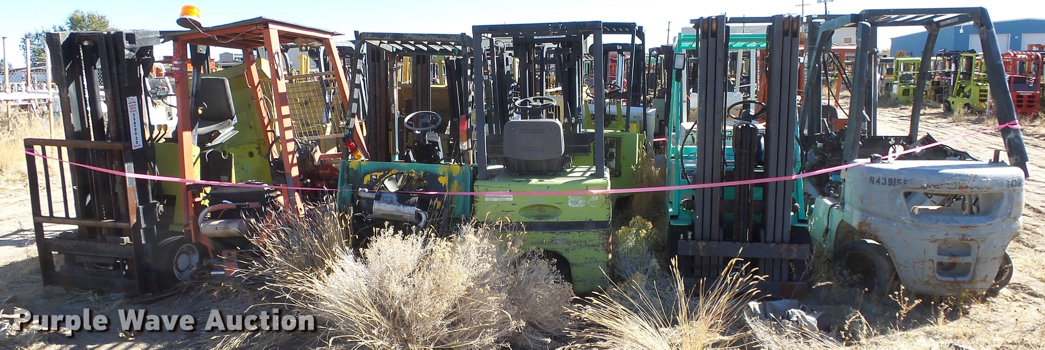 Purple Wave is selling a used Cushion Tire or Pneumatic Forklift in Nevada. This item is a (6) salvage forklifts with the following: Nissan, Mitsubishi FGC25, Serial AF82B-04764, Clark TMG15S, Serial TMG248-0200-7489FB, Clark ECA-25, Serial E138-0017-5381FA, (2) unknown, Non-operational units, parts missing