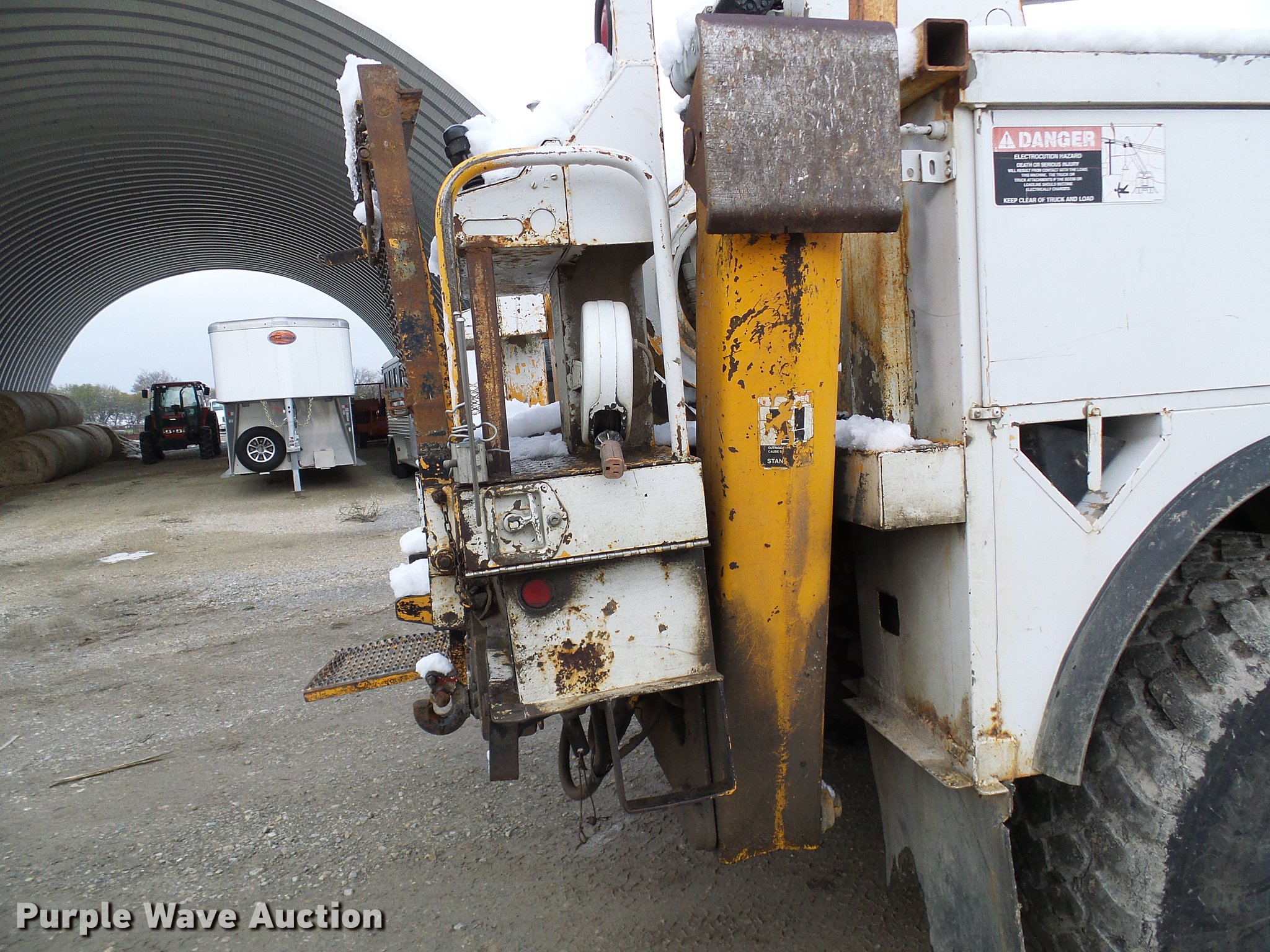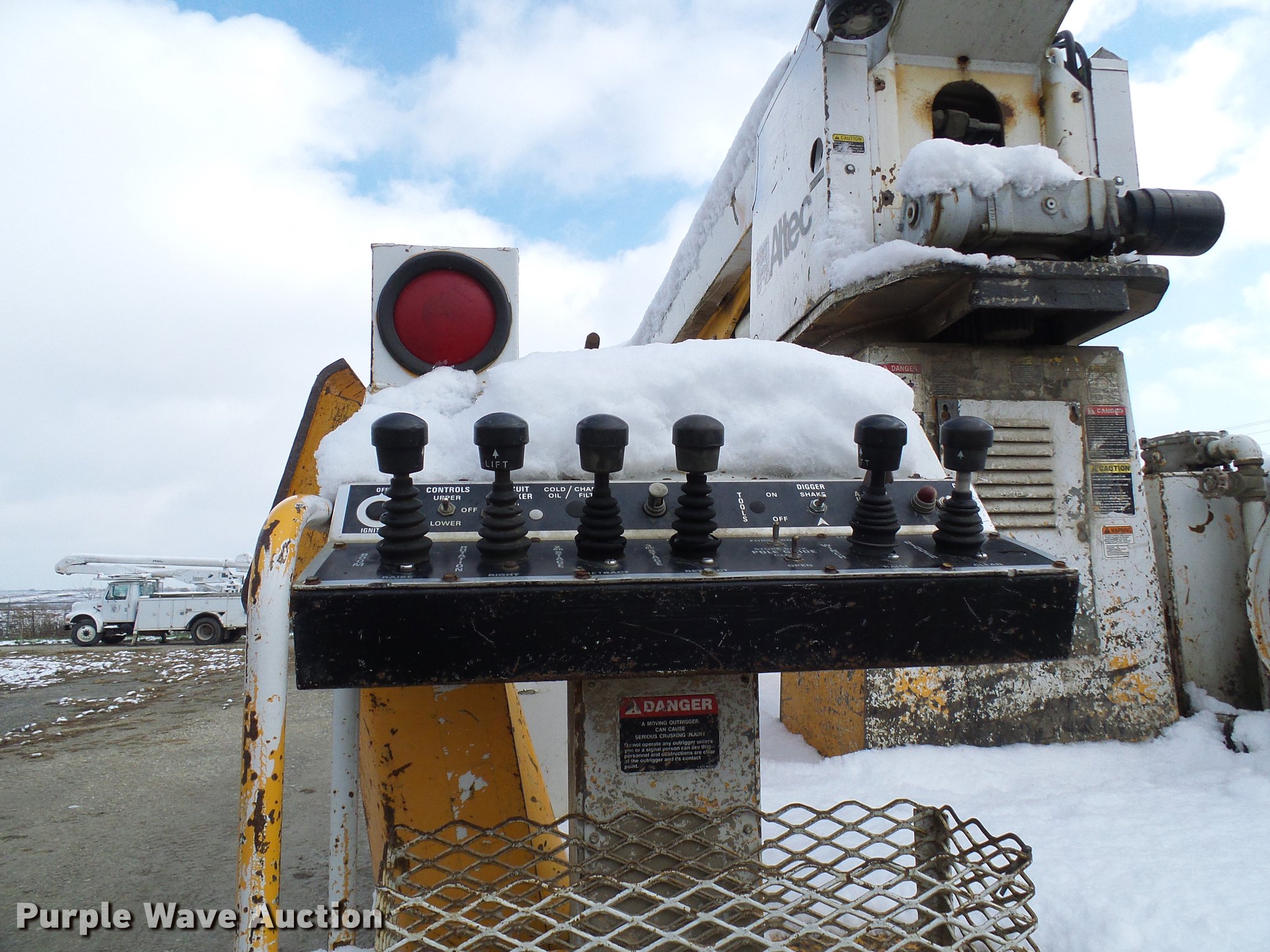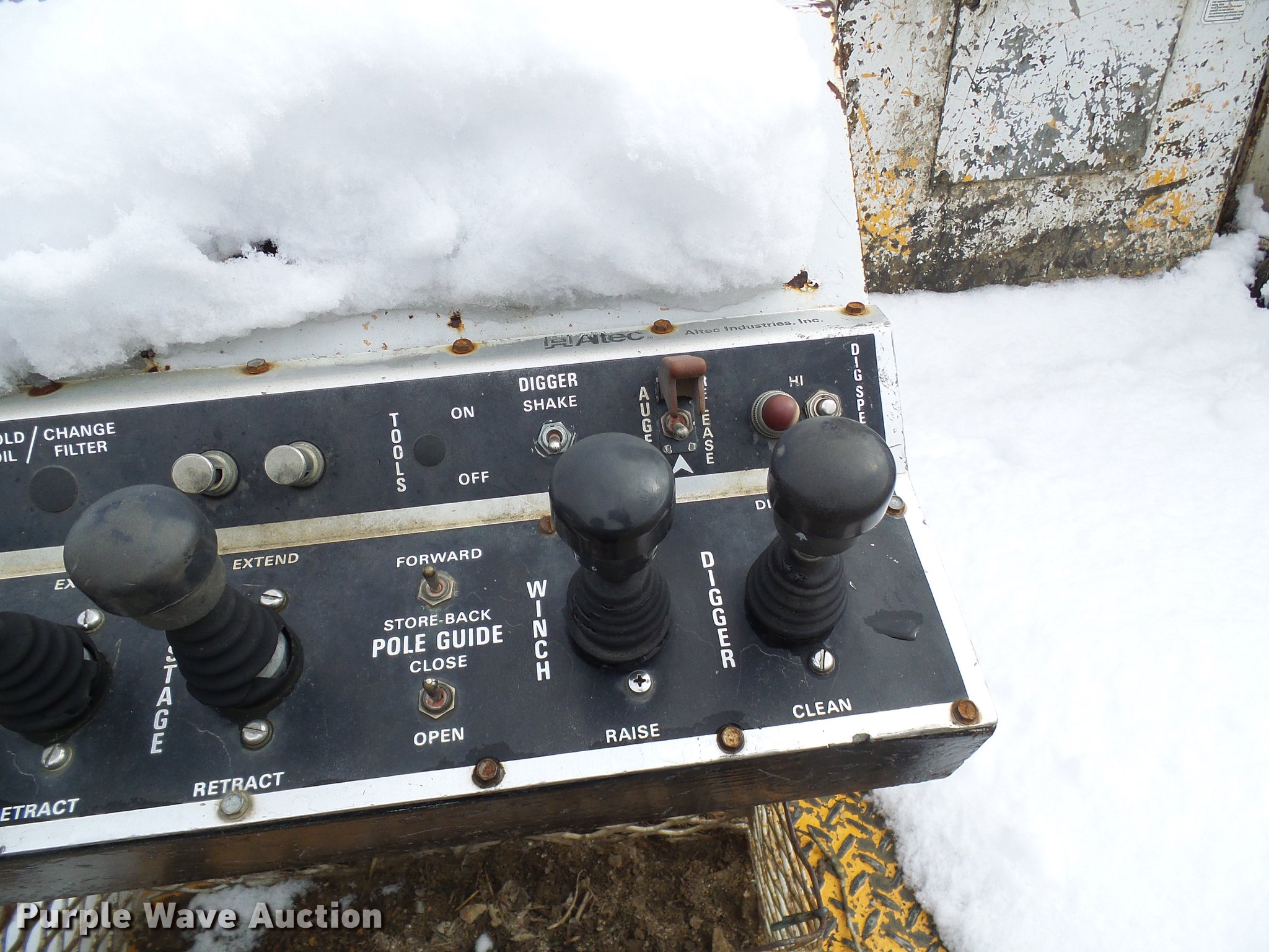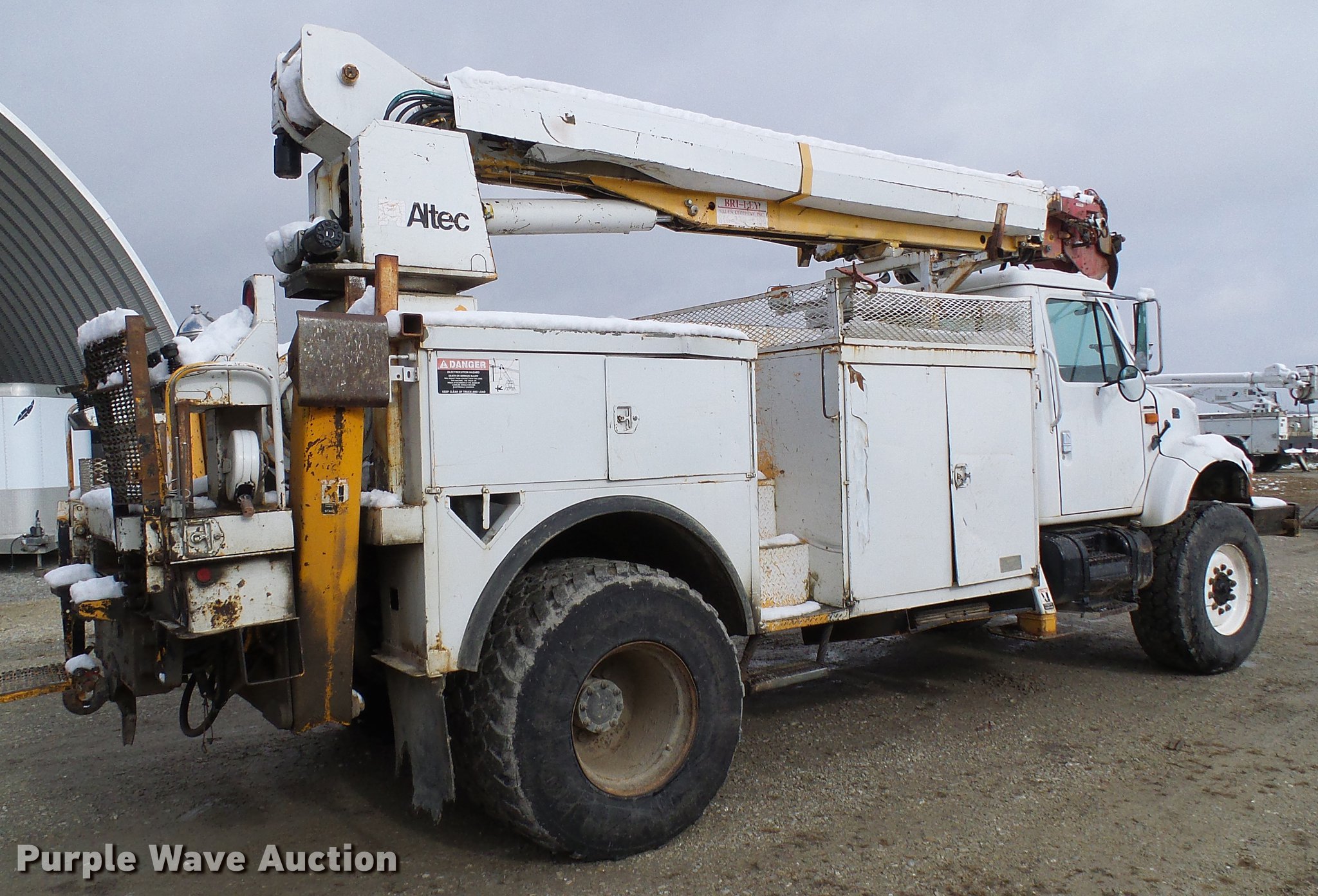 Purple Wave is selling a used Digger Derrick Truck in Missouri. This item is a 1995 International 4800 digger derrick truck with the following: 127,037 miles on odometer, 16,098 hours on meter, International DT466 7.6L L6 turbo diesel engine, Automatic transmission, Four wheel drive, Single axle, Heat, AM/FM, Suspension seat, PTO, Front mounted winch, Altec utility bed, 12'L, Shelving, Slide-out drawers, Shelving, Serial 8764094, Altec D845 boom, 45' maximum lift height, Ground boom controls, Pole guide, Telescopic boom, Rope material handler, (4) outriggers, Serial 1093BE0547, Single fuel tank, Spring suspension, Air brakes, 445/65R22.5 front tires, 600/50R22.5 rear tires