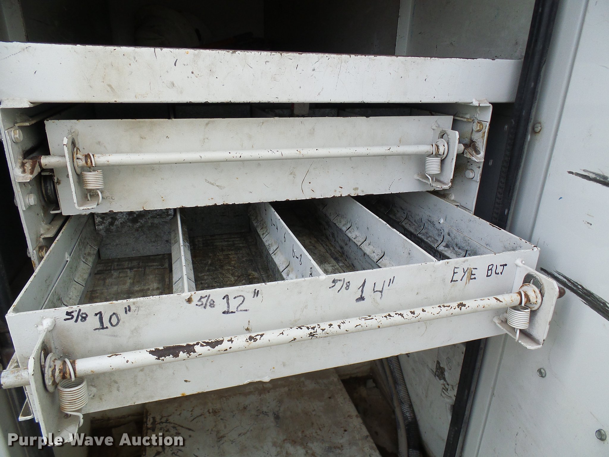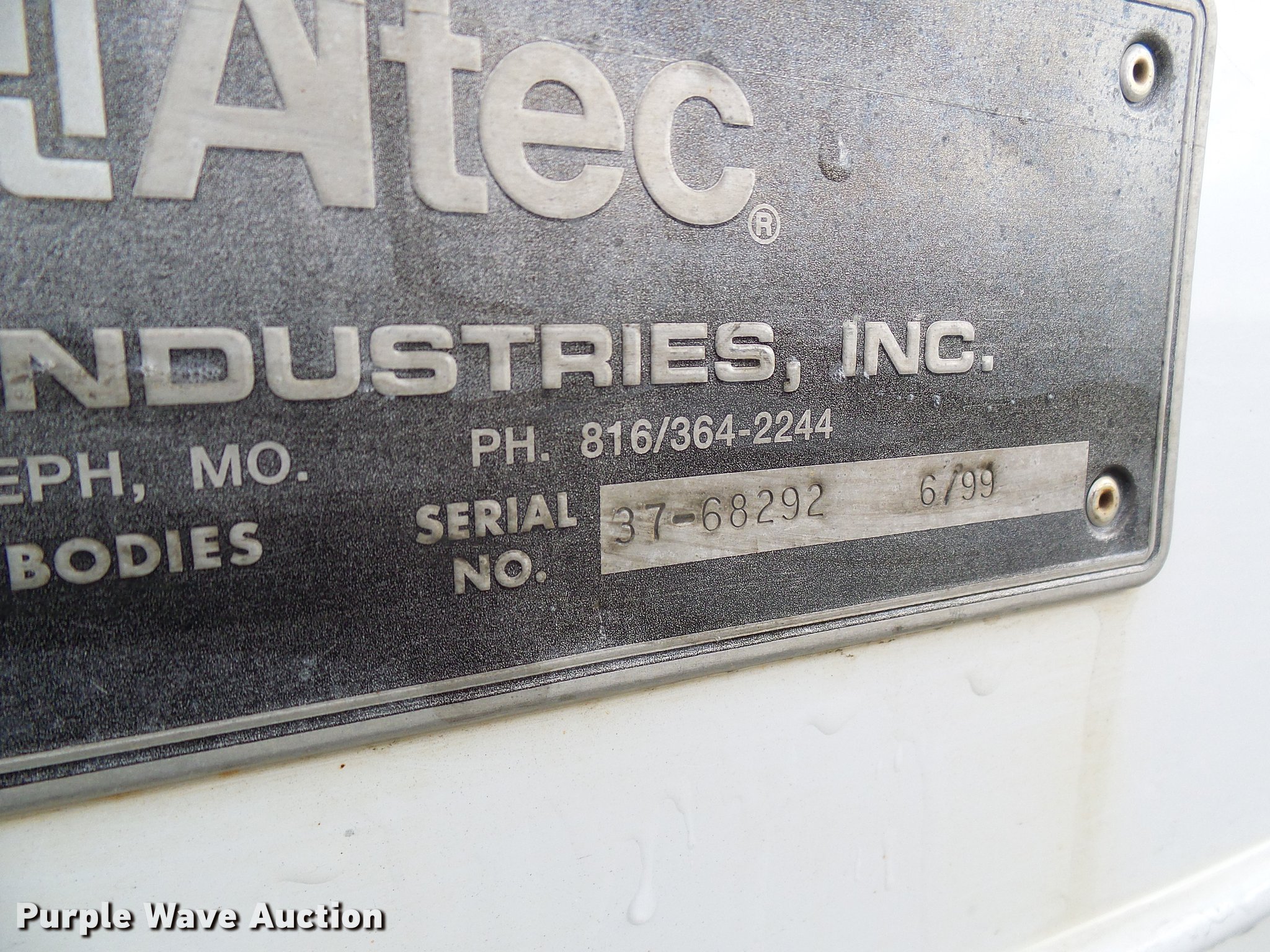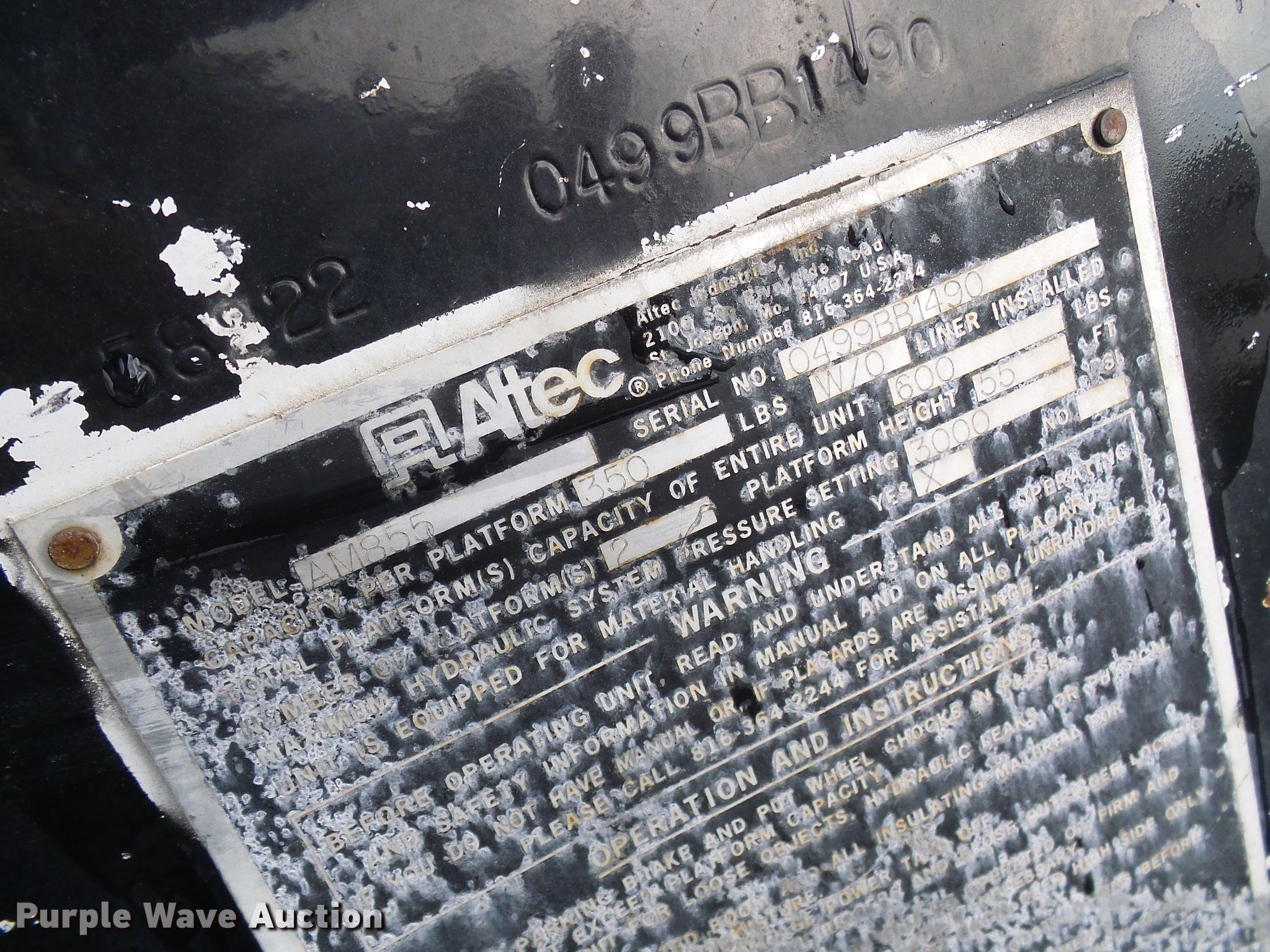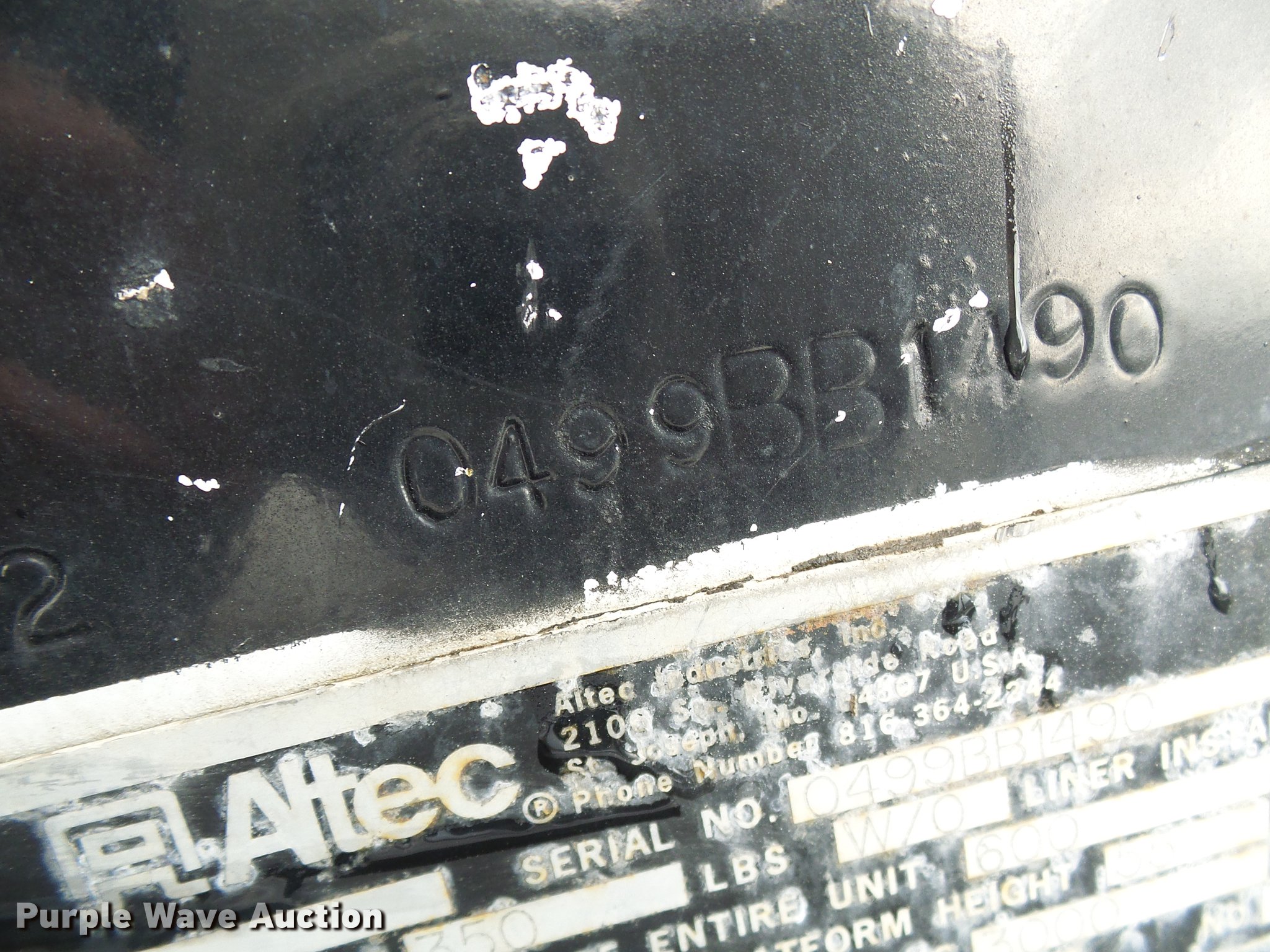 Purple Wave is selling a used Bucket Truck in Missouri. This item is a 1999 Freightliner FL70 bucket truck with the following: 144,363 miles on odometer, 19,001 hours on meter, Caterpillar 3126 7.2L L6 turbo diesel engine, Automatic transmission, Single axle, AC and heat, AM/FM, Suspension seat, Front tow hooks, PTO, Altec service bed, 13'L, Shelving, Serial 37-68292, Altec AM855 boom, 350 lbs max lift capacity, Man basket, 55' max lift height, Ground and platform boom controls, Articulating insulated boom, (4) outriggers, Serial 0499BB1490, Single fuel tank, Spring suspension, Air brakes, 11R22.5 tires, Oil leak