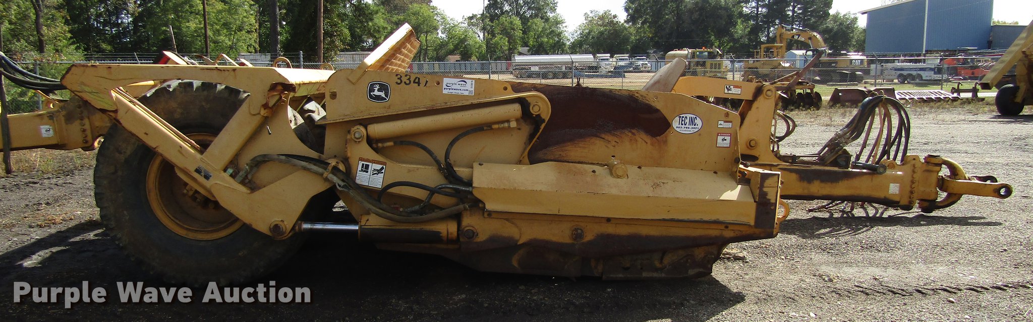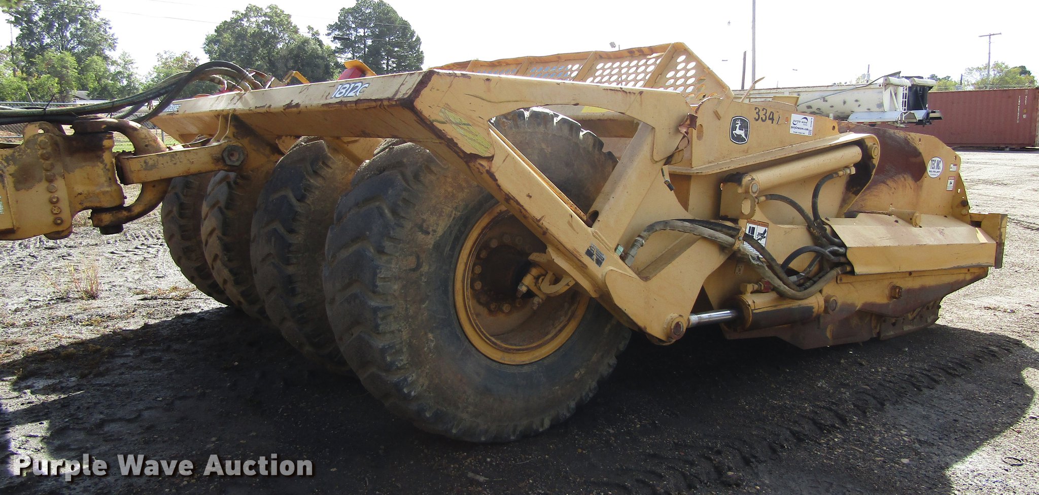 Purple Wave is selling a used Pull Type Scraper in Texas. This item is a 2005 John Deere 1812C scraper with the following: 18 cu.yd. capacity, Hydraulic lift, Pin hitch, Rear hitch, Constellation 20.5-25 tires, Serial T81812C050233