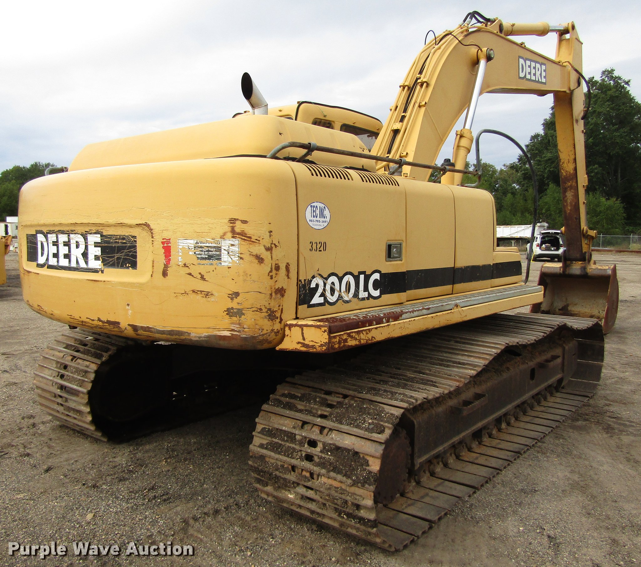 2001 John Deere 200LC excavator. 14,331 hours on meter, John Deere 6068T six cylinder turbo diesel engine, Hydrostatic transmission Straight travel, EROPS, AC and heat, AM/FM, Front work lights, Travel alarm, Standard boom, 9'7" stick length, WB 49"W bucket (5) bolt-on teeth, 31.5"W steel triple grouser track pads, Serial FF0200X501966. Tatum Excavating Company. 2416 South Lake Drive. Texarkana, TX 75501