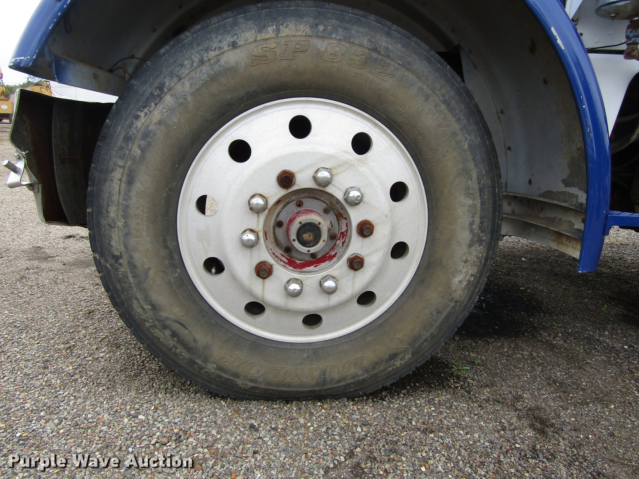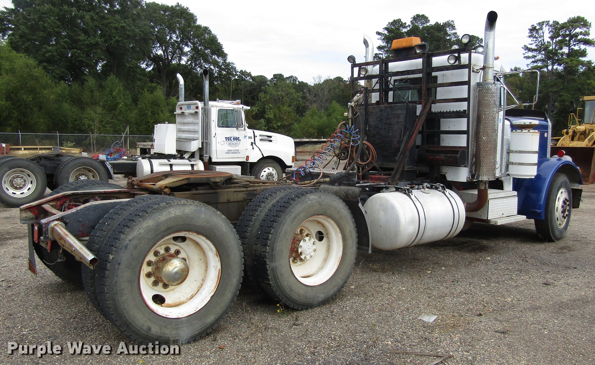 Purple Wave is selling a used Truck Tractor in Texas. This item is a 1983 Peterbilt 369 semi truck with the following: 670,595 miles on odometer, Caterpillar 3406 14.6L L6 turbo diesel engine, Eaton Fuller 10 speed manual transmission, Tandem axle, Inter-axle differential lock, AC and heat, Heated mirrors, Air suspension seat, Beacon light, Front tow hooks, Exterior visor, PTO, Headache rack, Chain hanger, Single rear exhaust stack, Air operated sliding fifth wheel plate, Single fuel tank, Aluminum quarter fenders, 230" wheelbase, Air suspension, Air brakes, 11R24.5 tires, GVWR 39,500 lbs, FAWR 11,560 lbs, IAWR 19,000 lbs, RAWR 19,000 lbs, Frame issues, left side frame broken