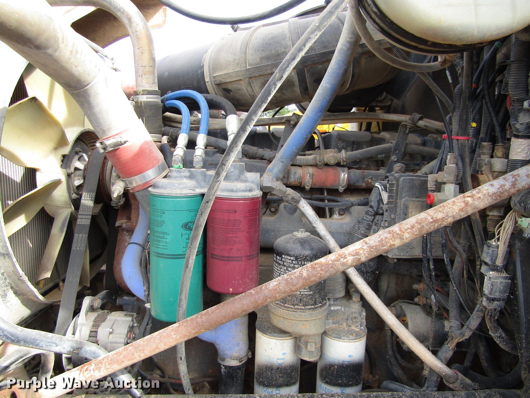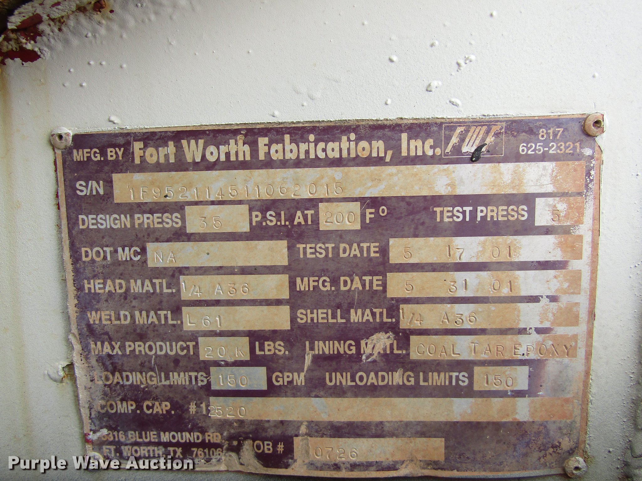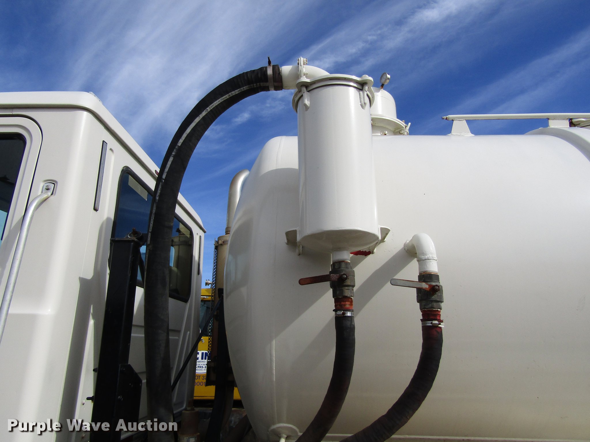 Purple Wave is selling a used Vacuum Truck in Texas. This item is a 2001 Mack CH613 vacuum truck with the following: 662,364 miles on odometer, 335,398 hours on meter, Mack E7 12.0L L6 turbo diesel engine, 460 HP, Serial 0F0328, Mack T2180B 18 speed manual transmission, Tandem axle, AC and heat, Air suspension seat, PTO, Beacon light, Backup alarm, Front tow hooks, Fort Worth 0726 tank, (3) 16" top hatches, 4" rear outlet, Coal tar epoxy lining, Serial 1F952114511062015, Dual fuel tanks, Single exhaust stack, 216" wheelbase, Spring suspension, Air brakes, Continental 11R24.5 tires, GVWR 22,679 lbs, Vacuum pump removed, but included, Pump needs rebuilt