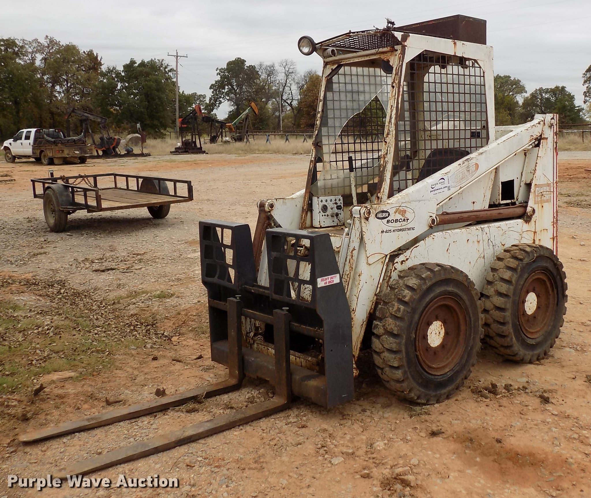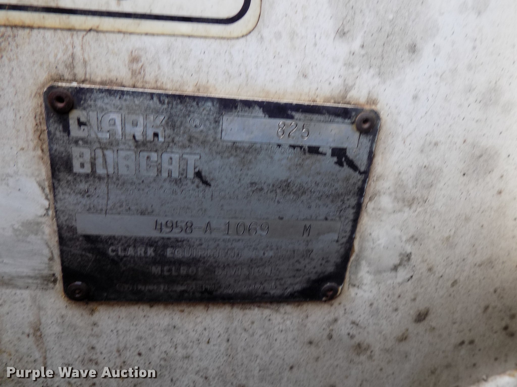 Purple Wave is selling a used Skid Steer Loader in Oklahoma. This item is a 1975 Bobcat M-825 skid steer with the following: 1,638 hours on meter, Perkins four cylinder turbo diesel engine, 38 HP, Hydrostatic transmission, Open station/canopy, Hand and foot controls, Spring suspension seat, 67"W bucket, 48"L pallet forks, Manual quick coupler, 8.25-15 solid tires, Serial 4958A1069