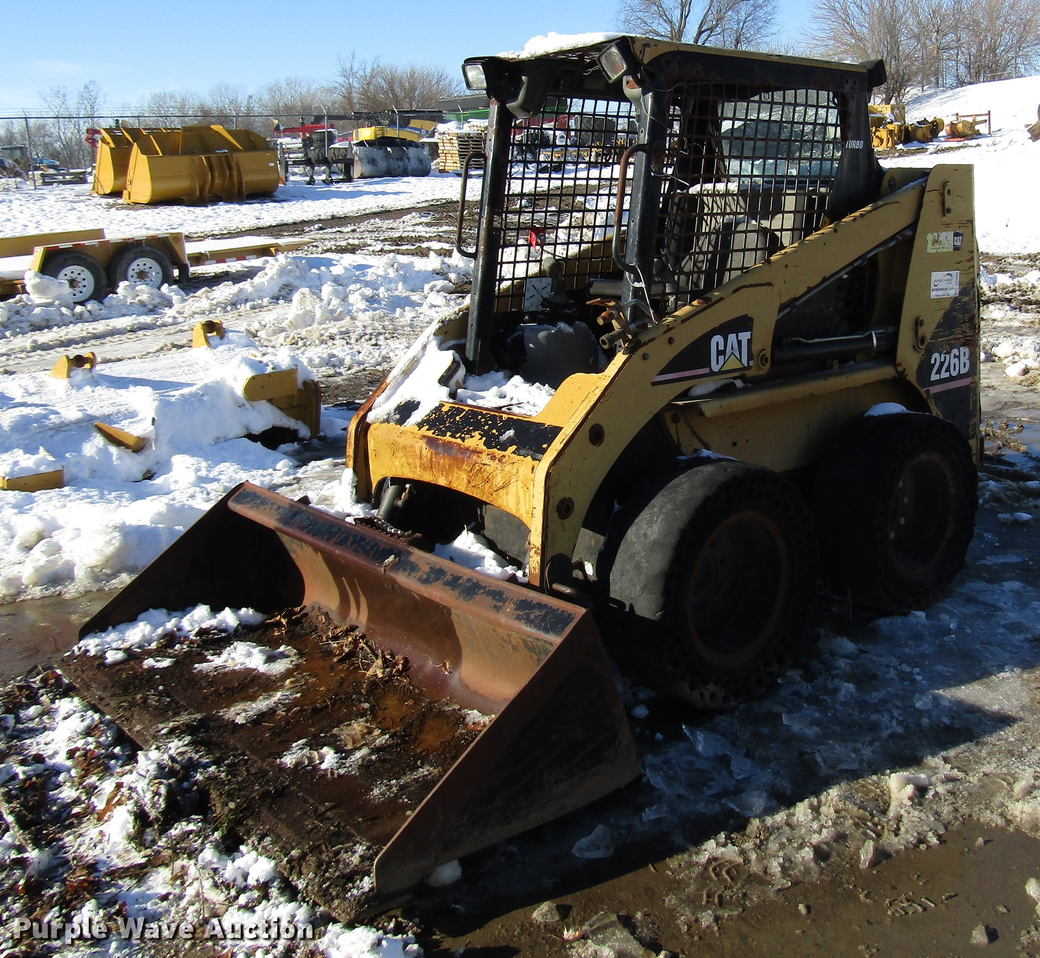 Purple Wave is selling a used Skid Steer Loader in Missouri. This item is a Caterpillar 226B skid steer with the following: Unknown hours on meter, Caterpillar four cylinder turbo diesel engine, Hydrostatic transmission, Open station/canopy, Joystick controls, Spring suspension seat, Front and rear work lights, Backup alarm, Block heater, Caterpillar 72"W bucket, Bolt-on cutting edge, Manual quick coupler, Auxiliary hydraulics, Counter weights, Solid tires, Non-operational unit, Engine issues, Serial CAT0226BCMJH04714