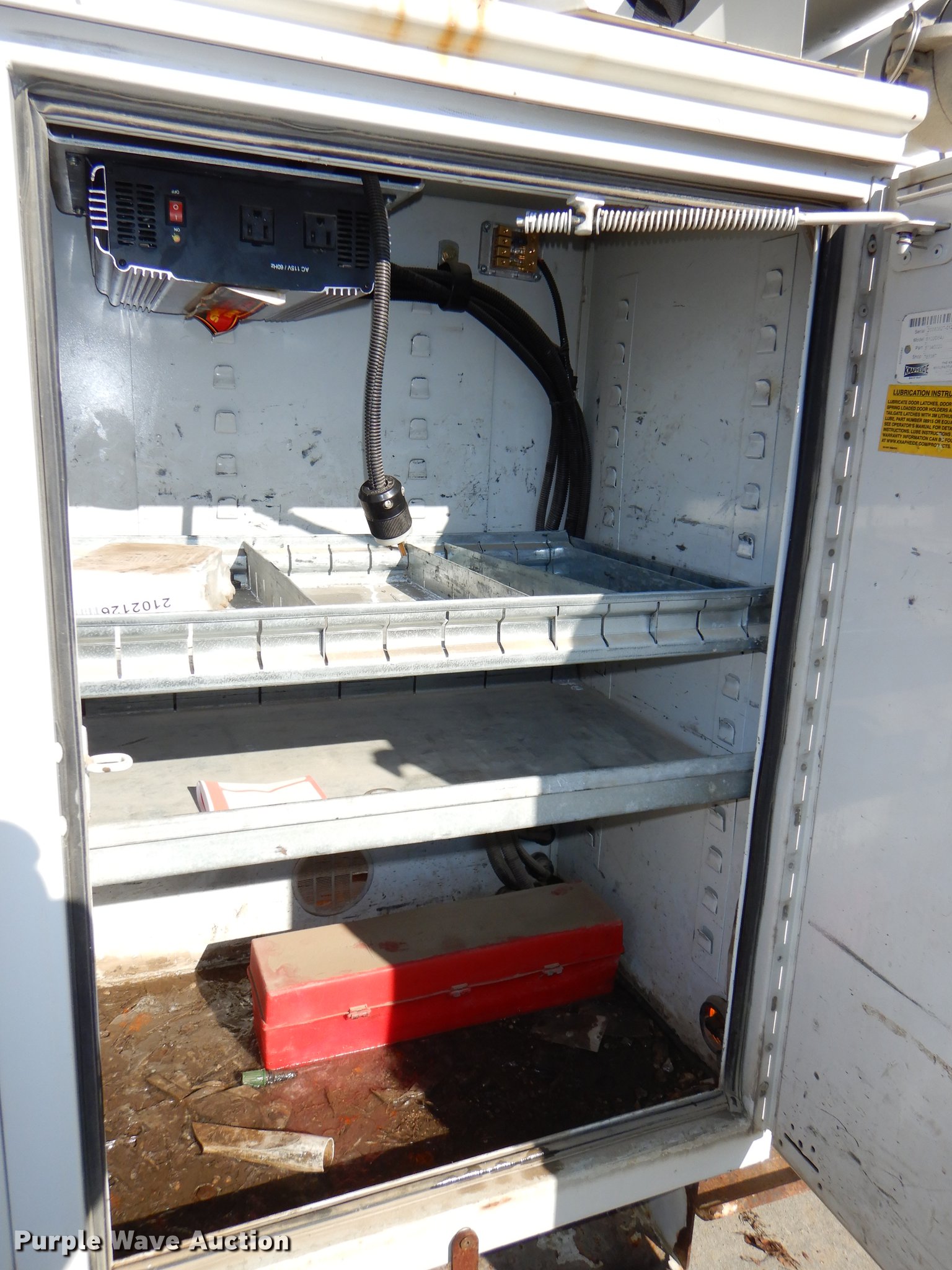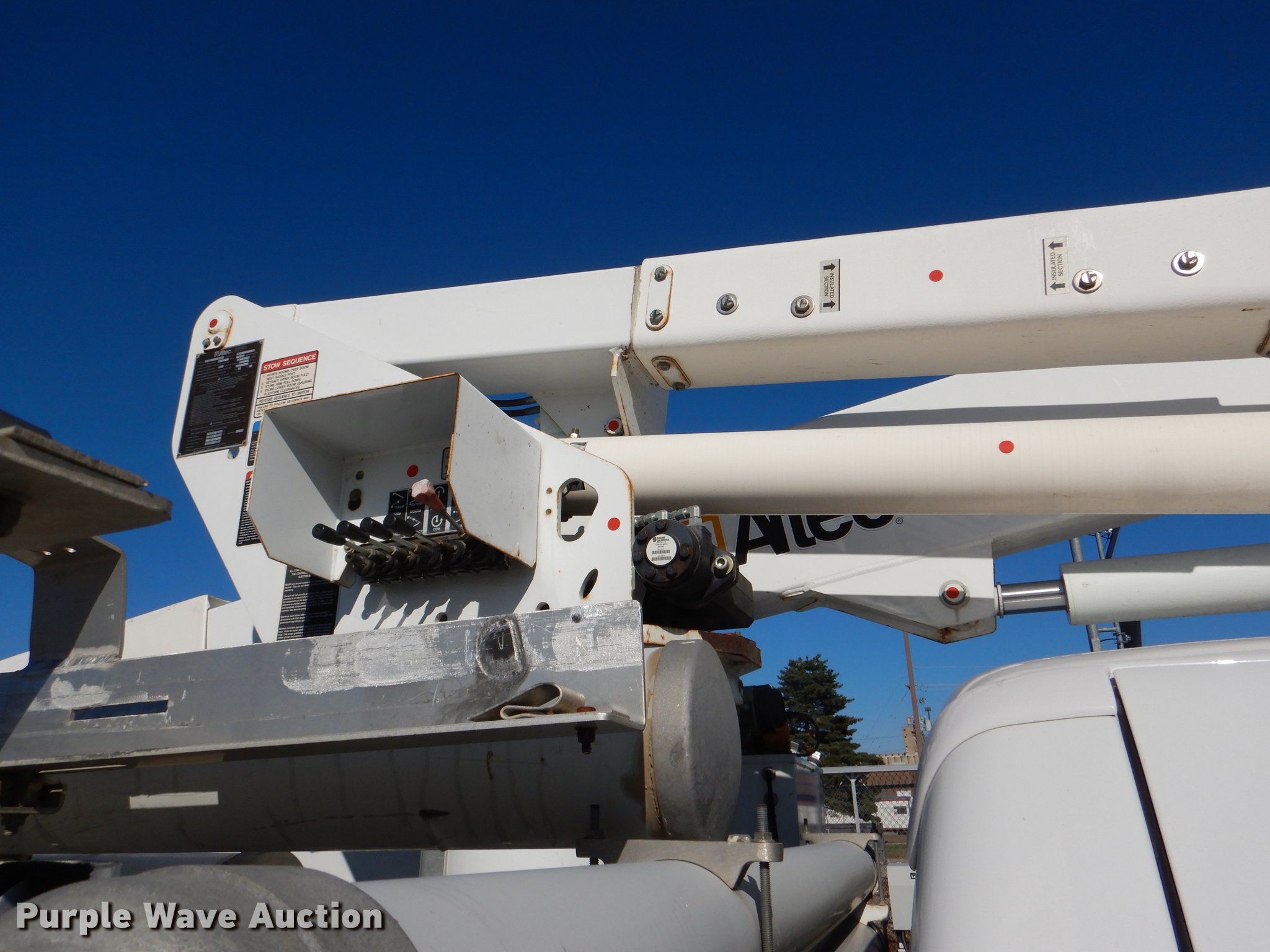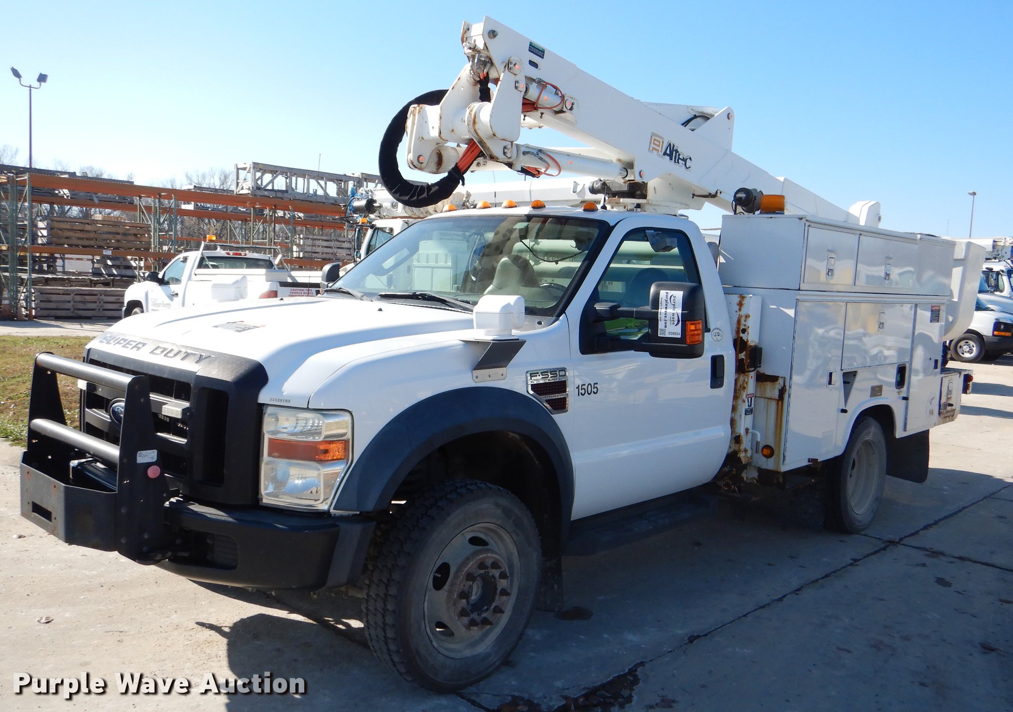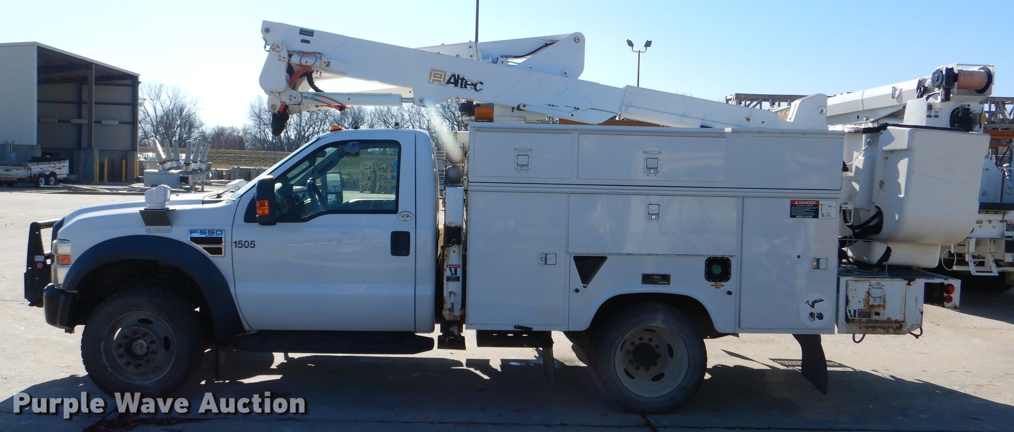 Purple Wave is selling a used Bucket Truck in Kansas. This item is a 2008 Ford F550 Super Duty XL bucket truck with the following: 116,722 miles on odometer, 1,108 hours on meter, 6.4L V8 OHV 32V turbo diesel engine, Automatic transmission, Four wheel drive, Single axle, AC And heat, AM/FM, Power windows, locks, and mirrors, Heated mirrors, Vinyl interior, Backup alarm, Beacon light, Front tow hooks, Block heater, Signal master controls, Grill guard, Altec 6102D54J utility bed, 102"L, Shelving, Work lights, Power inverter, Serial 20080627-0123907, Altec AT37G boom, 400 lbs maximum lift capacity, 37.5' maximum lift height, 9'8" travel height, Man basket, Platform controls, Boom rotation, Telescopic, insulated boom, Outriggers, Serial 0708DE9754, Single fuel tank, Pintle hitch, Trailer wiring, 140" wheelbase, Spring suspension, Hydraulic brakes, michelin 225/70R19.5 tires, Unit# 1505