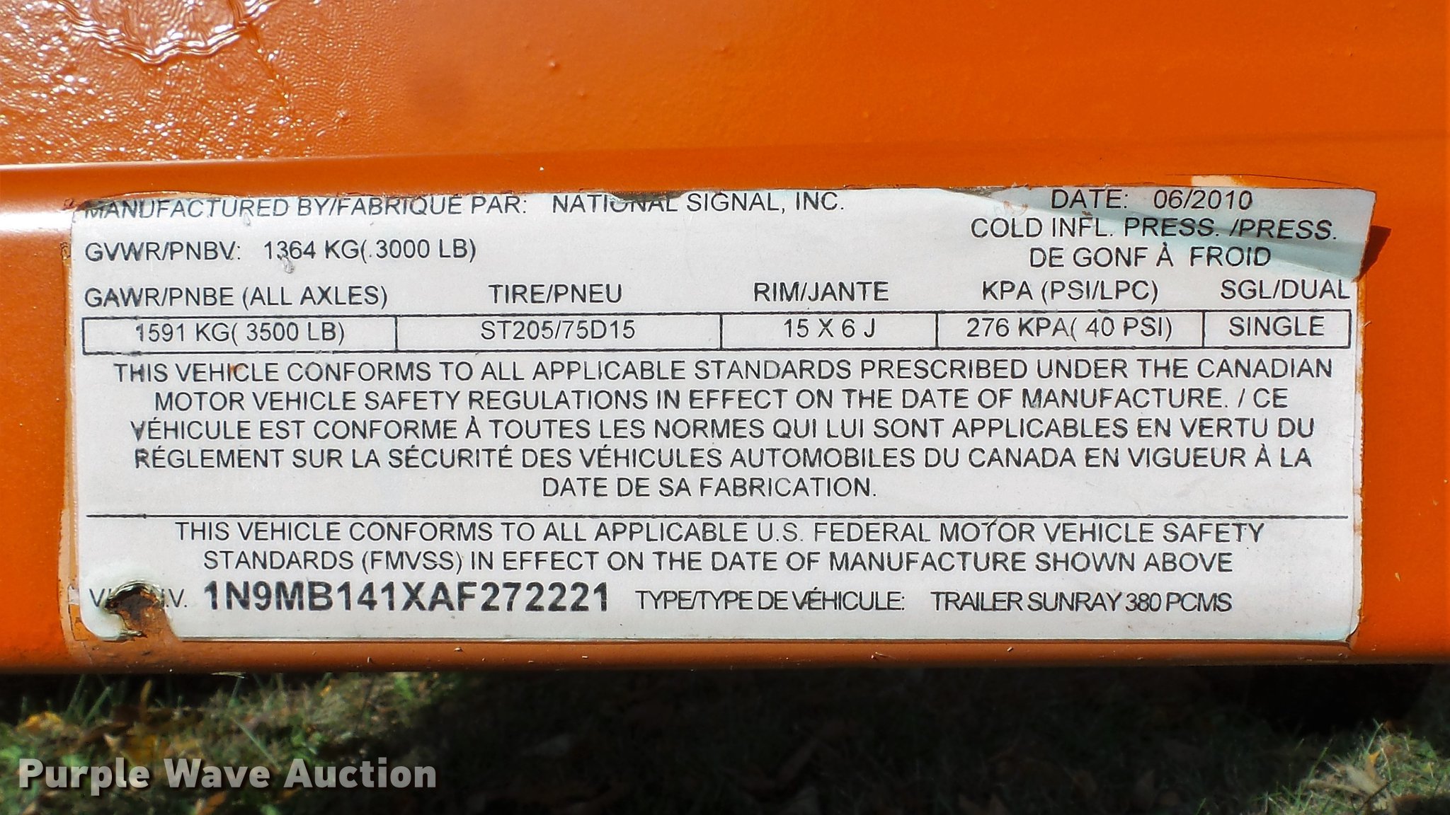 2010 National Signal Sunray 380 message board. Hydraulic message board hoist, Manual message board rotation, Control box Keyboard, (6) batteries, Solar charging system, (4) leveling jack stands, 2" ball hitch, Jack stand, ST205/75D15 tires, Manual. Missouri title. 1N9MB141XAF272221. Troy, MO 63379