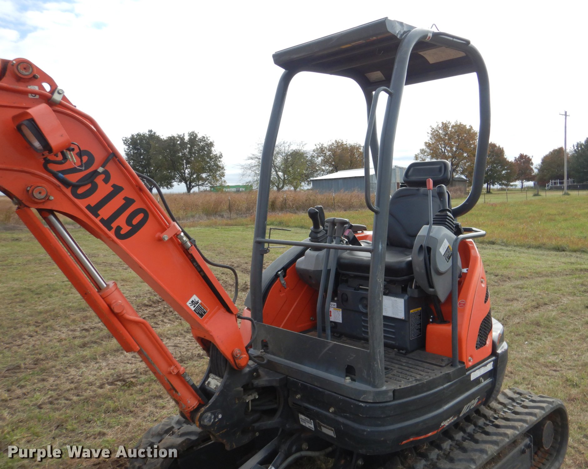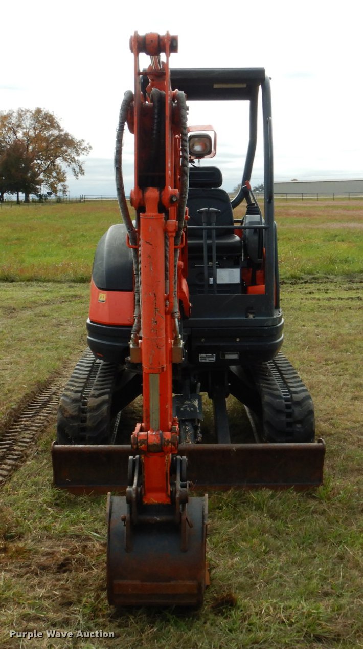 Purple Wave is selling a used Mini Excavator in Oklahoma. This item is a 2014 Kubota U25 mini excavator with the following: 779 hours on meter, Kubota D1105 1.1L three cylinder diesel engine, Serial 1EQ3496, Two speed hydrostatic transmission, EROPS, Pattern changer, Front and rear work lights, 58"W backfill blade, Standard boom, Auxiliary hydraulics, Hydraulic quick coupler, 16"W bucket, (3) weld-on teeth, 11"W rubber tracks, Serial 26119, 50559, Unit# 26119, 50559