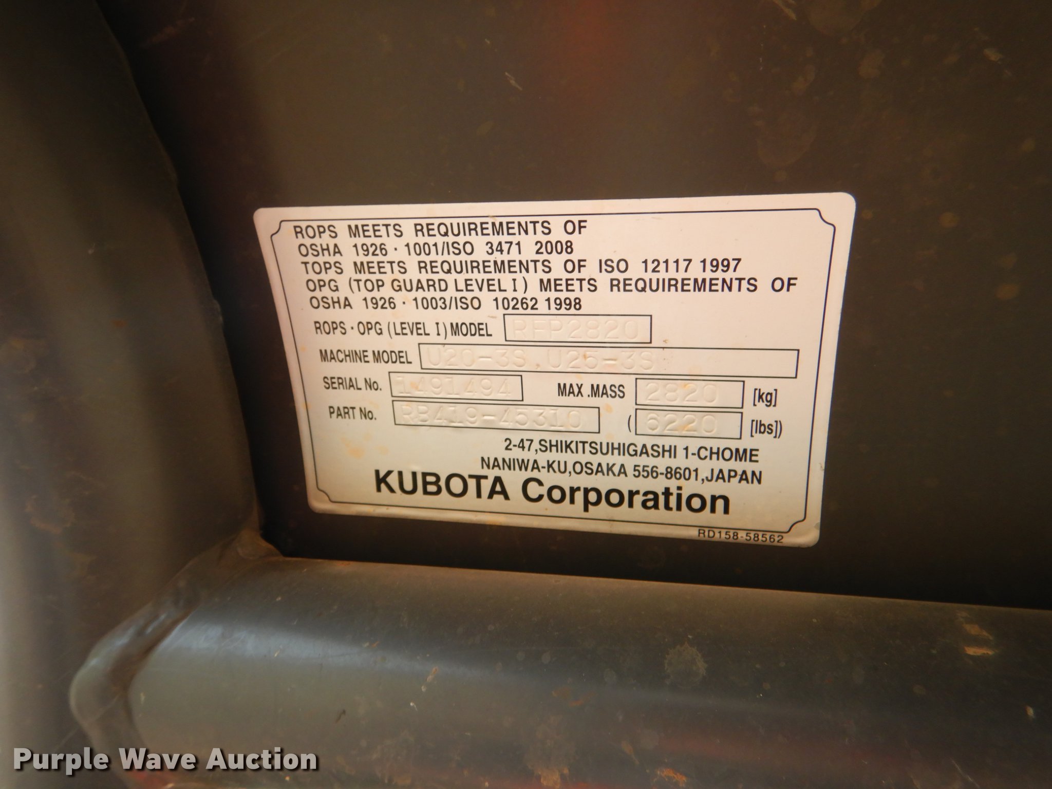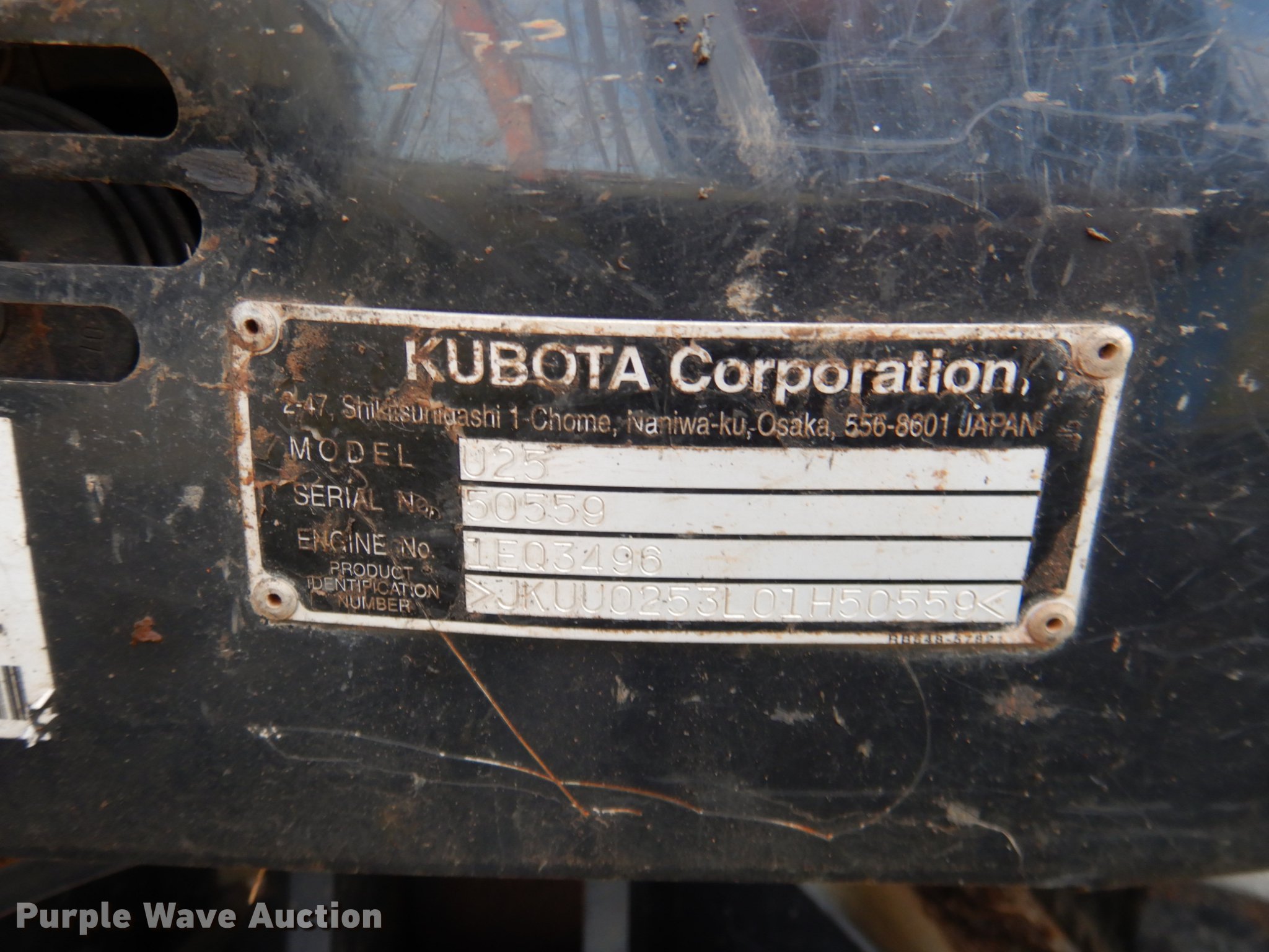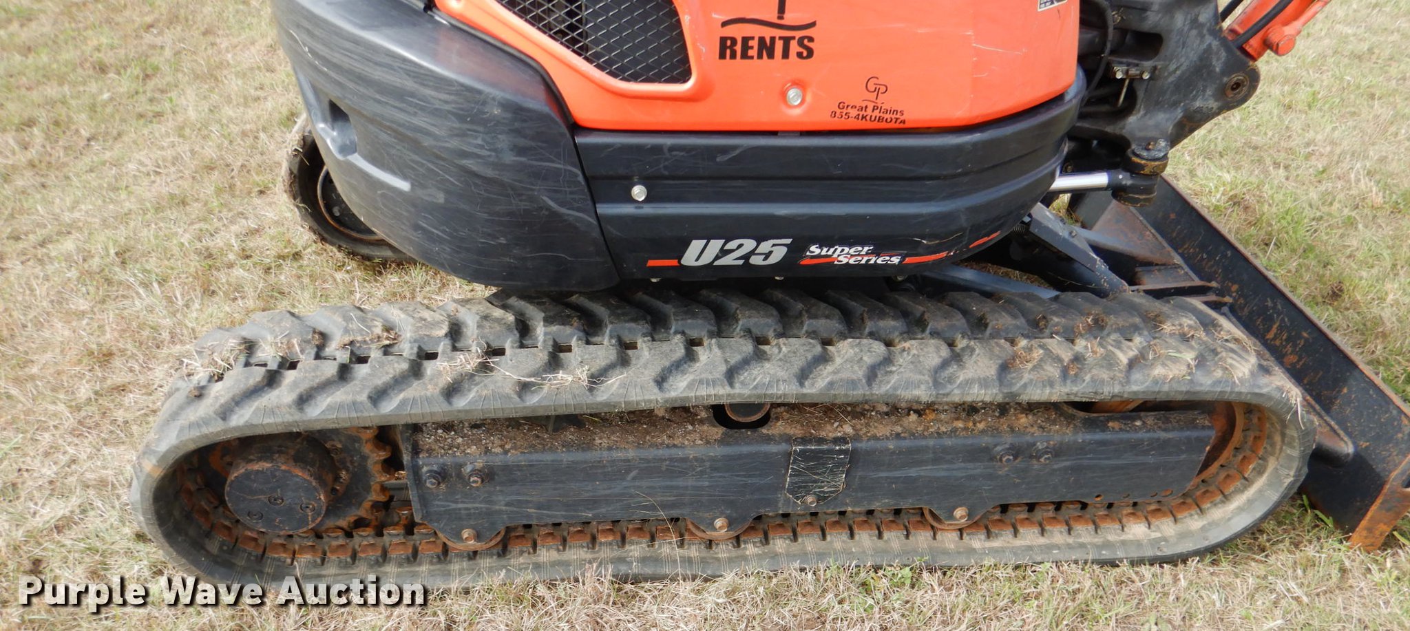 2014 Kubota U25 mini excavator. 779 hours on meter, Kubota D1105 1.1L three cylinder diesel engine Serial 1EQ3496, Two speed hydrostatic transmission, EROPS, Pattern changer, Front and rear work lights, 58"W backfill blade, Standard boom, Auxiliary hydraulics, Hydraulic quick coupler, 16"W bucket (3) weld-on teeth, 11"W rubber tracks, Serial 26119, 50559, Unit# 26119, 50559. Great Plains Kubota - Open inspection Dec. 12. 90 County Rd. Davis, OK 73030