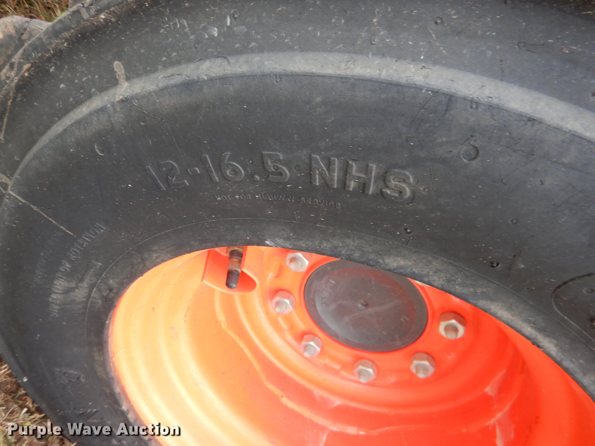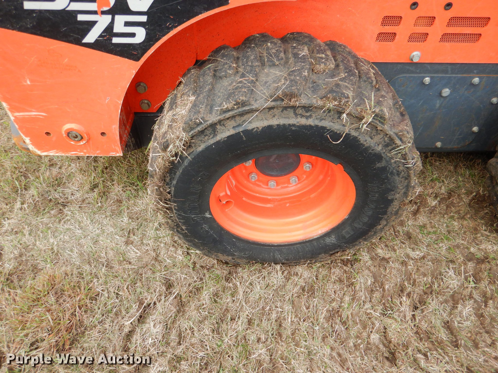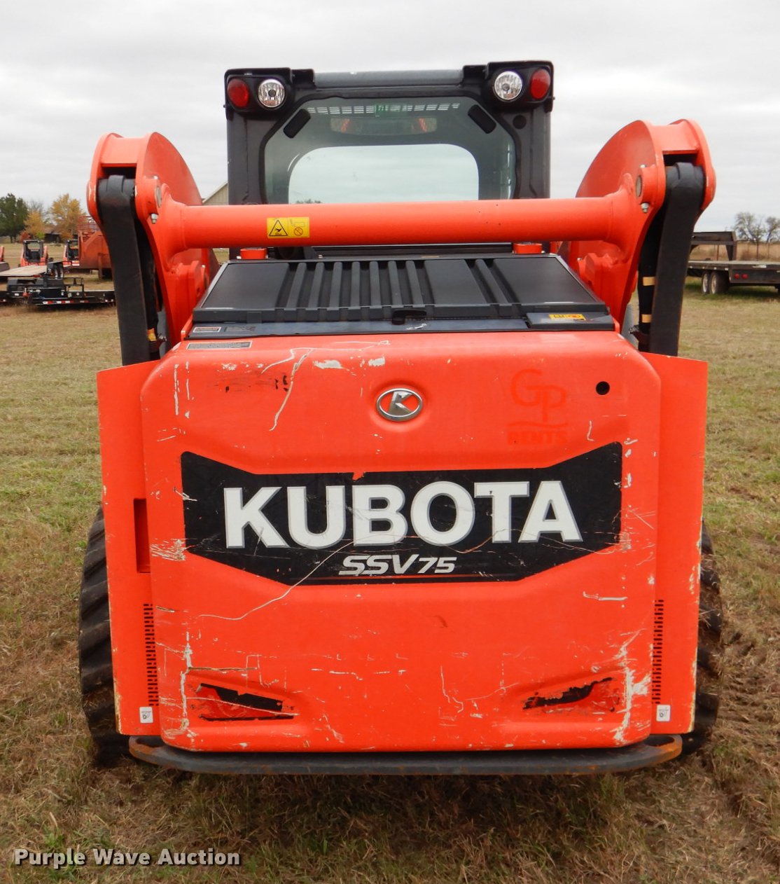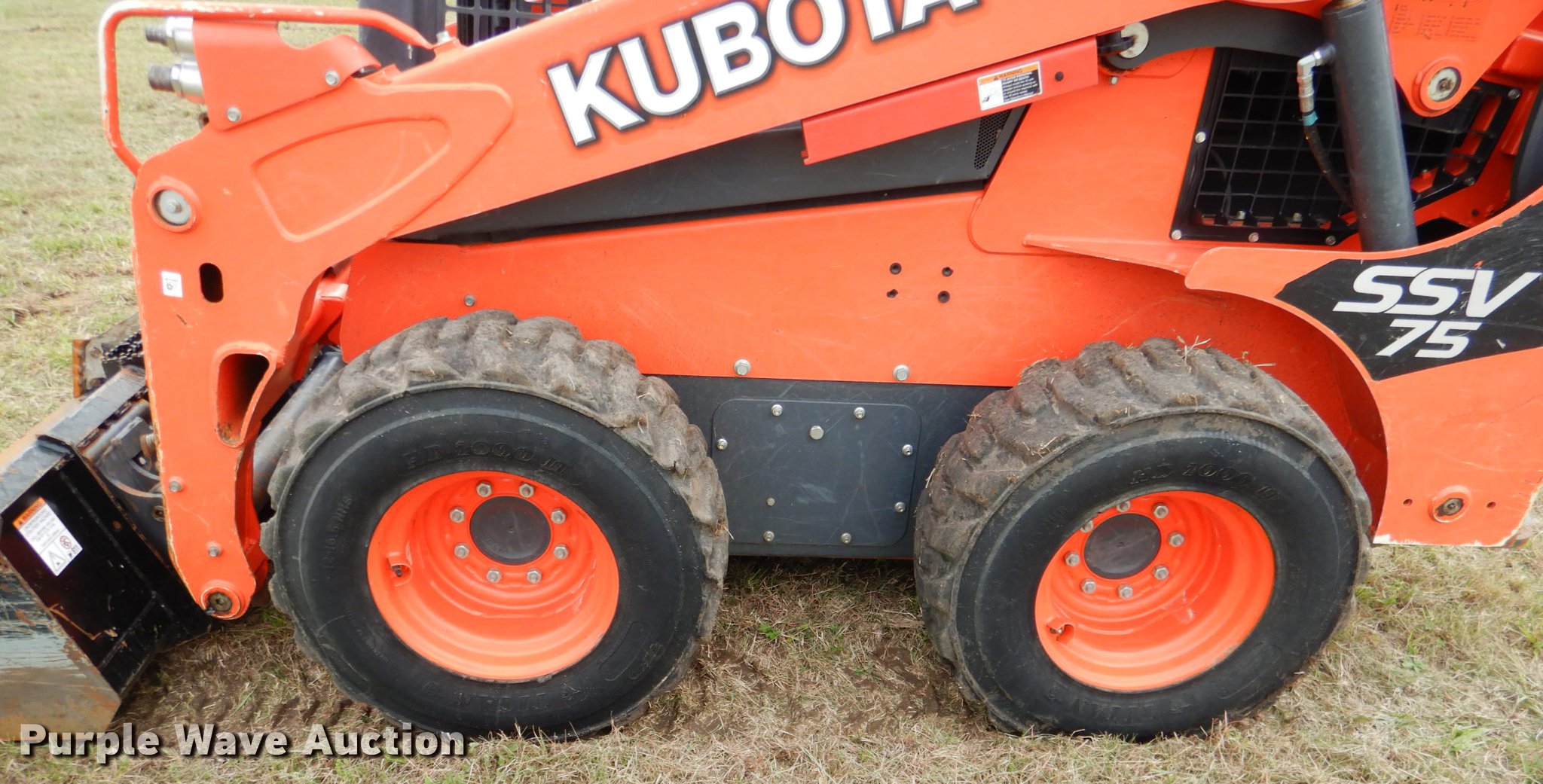 Purple Wave is selling a used Skid Steer Loader in Oklahoma. This item is a 2017 Kubota SSV75 skid steer with the following: 429 hours on meter, Kubota V3307 3.3L four cylinder turbo diesel engine, Two speed hydrostatic transmission, Open station/canopy, Hand and foot controls, Front and rear work lights, Auxiliary hydraulics, Hydraulic quick coupler, Kubota 69"W bucket, Bolt-on cutting edge, 12-16.5 NHS tires, Full warranty until 2/3/2019, Serial 10633, Unit# 10633