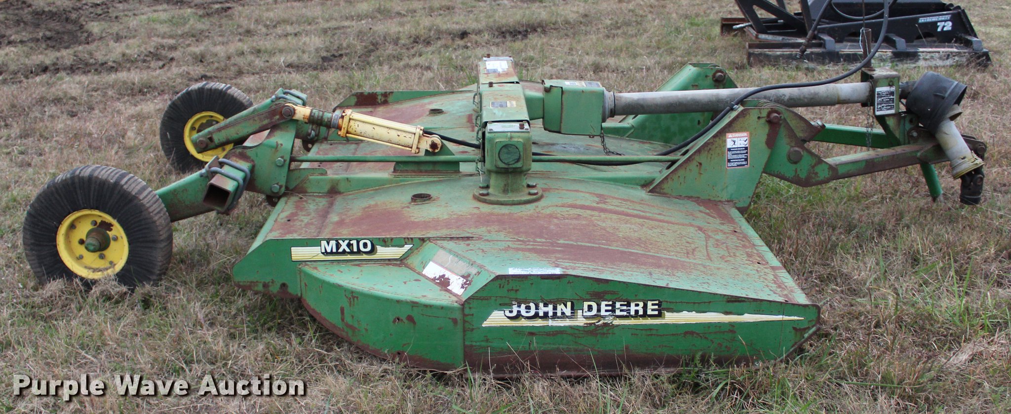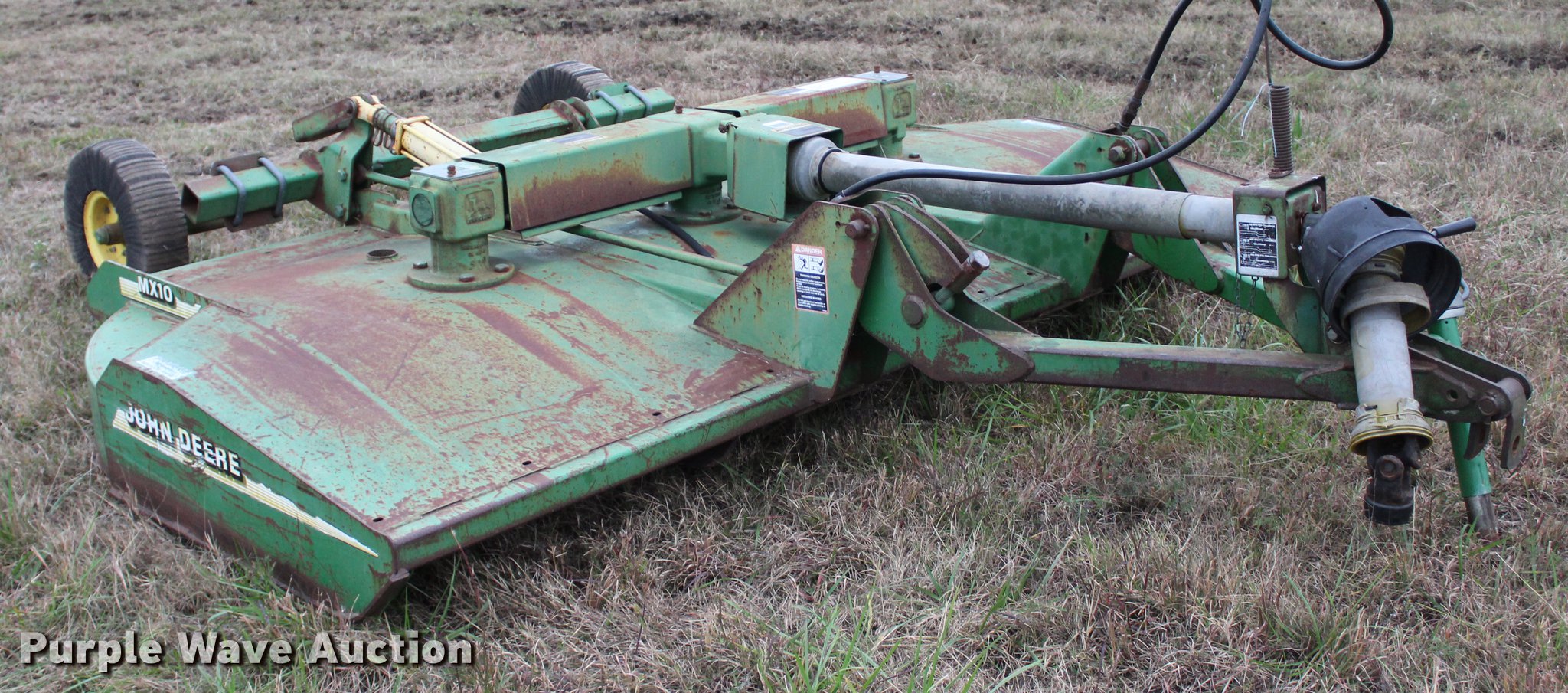 Purple Wave is selling a used Mower, Cutter, Shredder in Oklahoma. This item is a John Deere MX10 rotary mower with the following: 10'W, 540/1000 PTO, Pin hitch, Jack stand, Serial W0MX10E001262