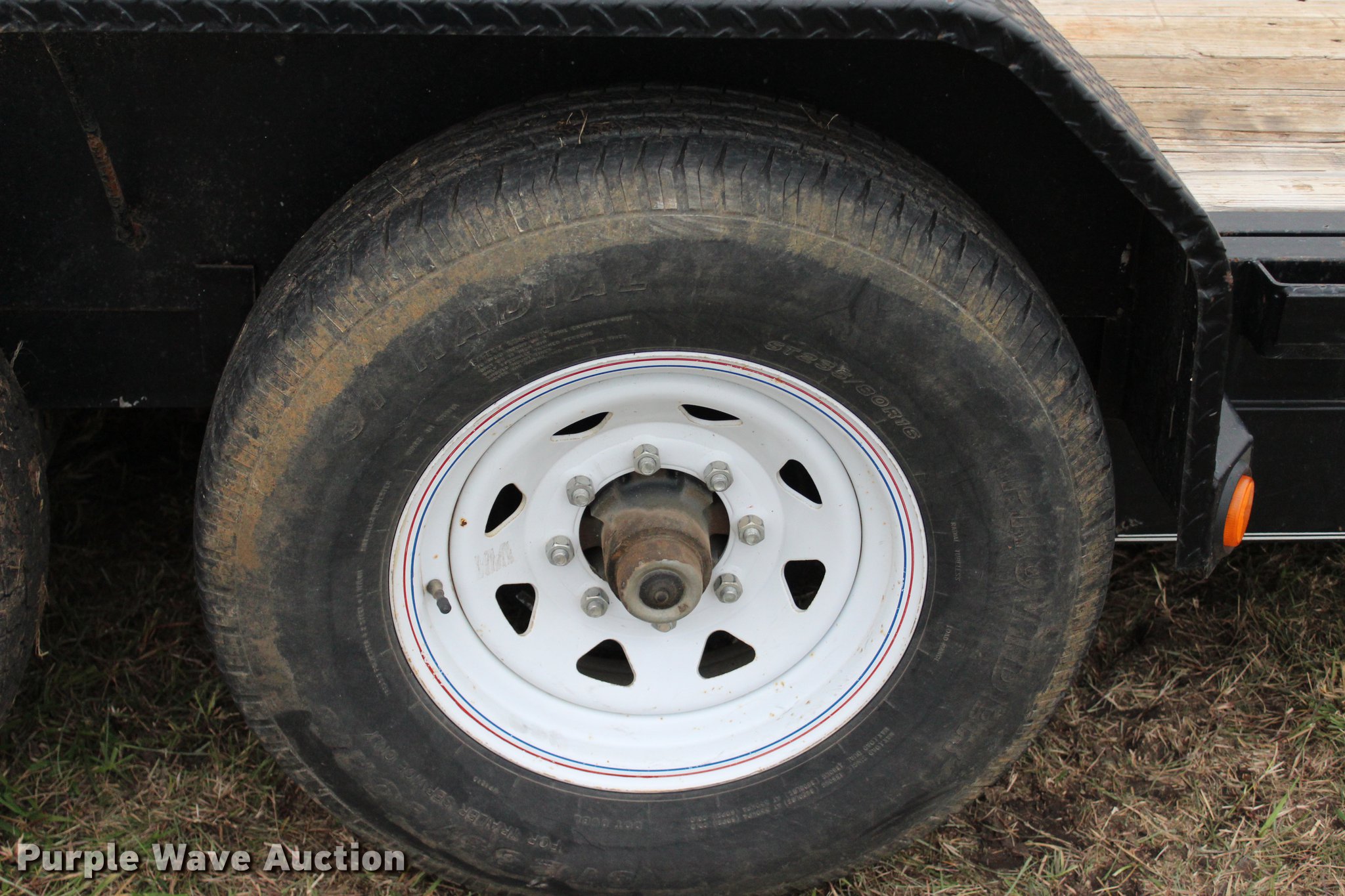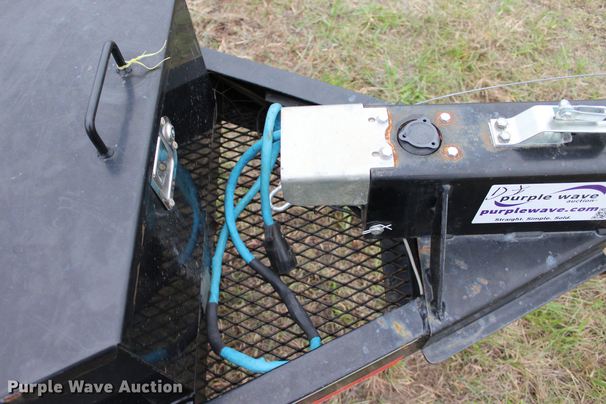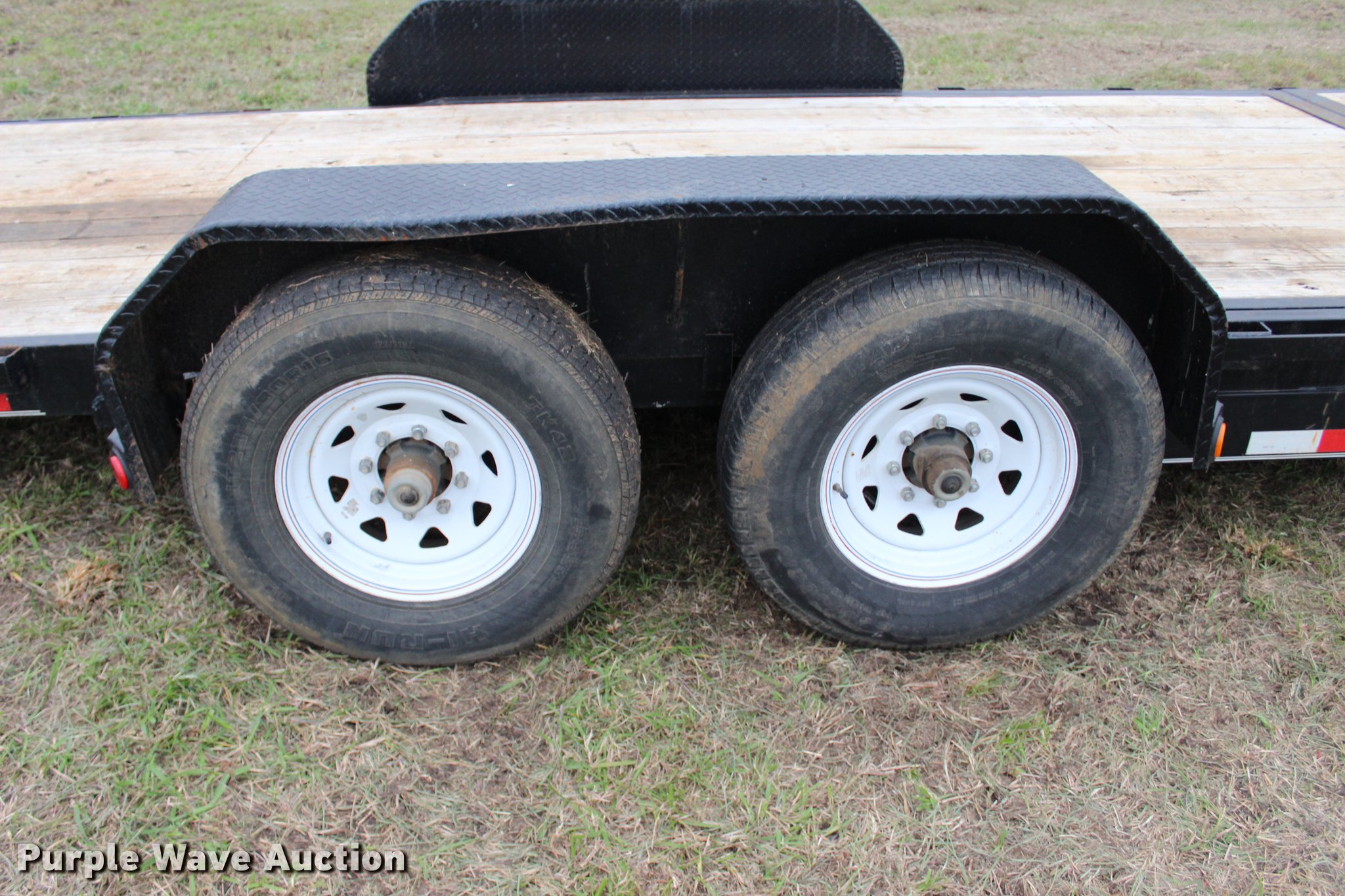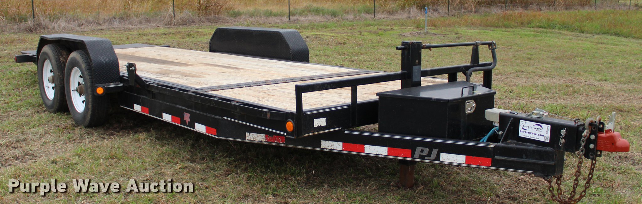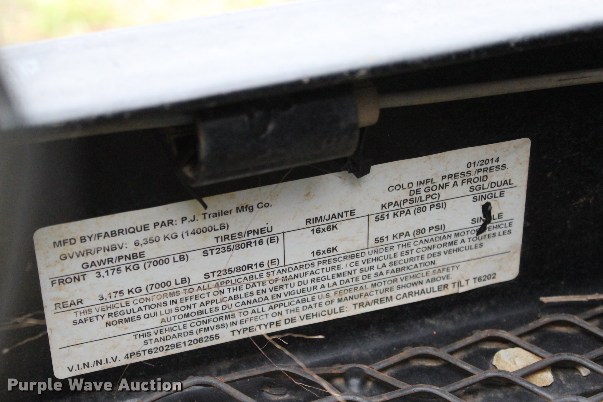 Purple Wave is selling a used Car or Utility Trailer in Oklahoma. This item is a 2014 PJ T6202 tilt deck utility trailer with the following: 27'L x 78"W overall, 21'4"L wood deck, Stake pockets, Toolbox, 68"L hitch, 2 5/16" ball hitch, Hydraulic brakes, Tandem axle, ST235/80R16 tires, GVWR 14,000 lbs, Unit# 206255