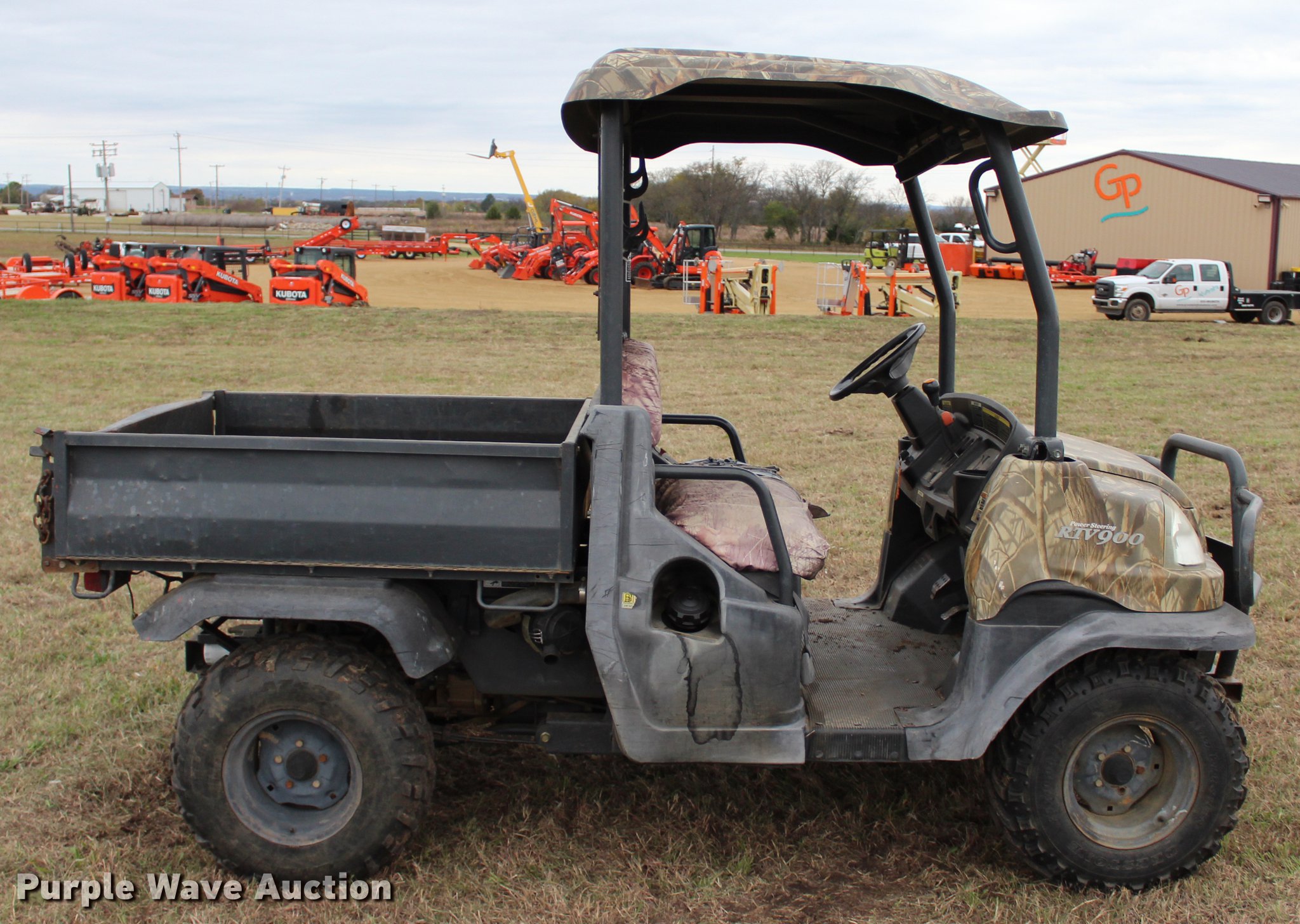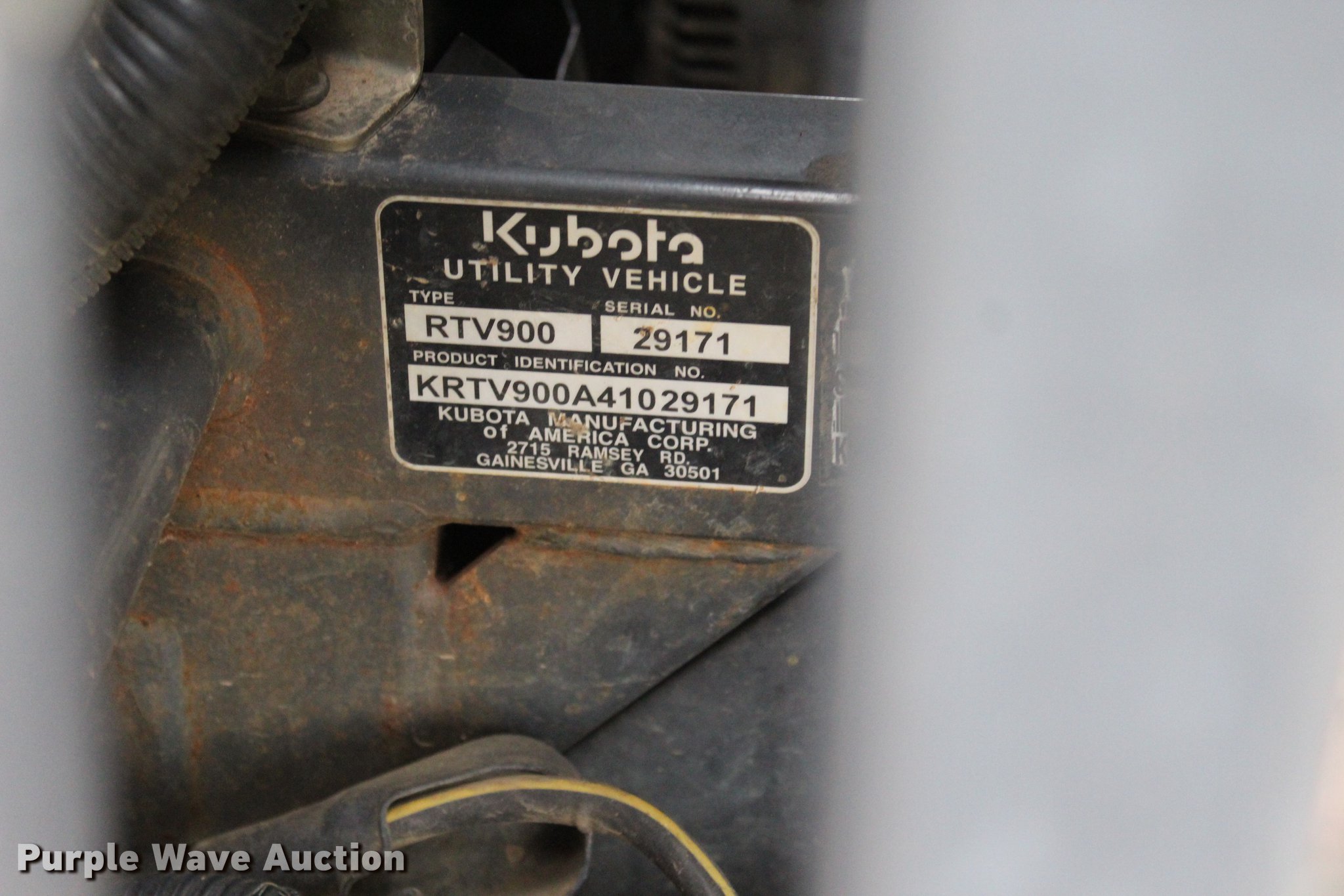 Purple Wave is selling a used Utility Vehicle in Oklahoma. This item is a 2004 Kubota RTV900 utility vehicle with the following: 2,270 hours on meter, Kubota D902-5 0.898L diesel engine, Automatic transmission, Four wheel drive, OROPS canopy, Grill guard, Manual dump bed, Receiver hitch, 25x10.00-12 tires, Unit# 29171