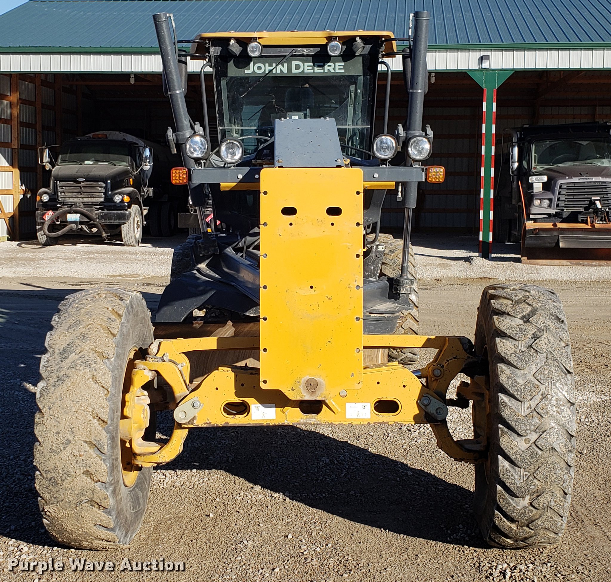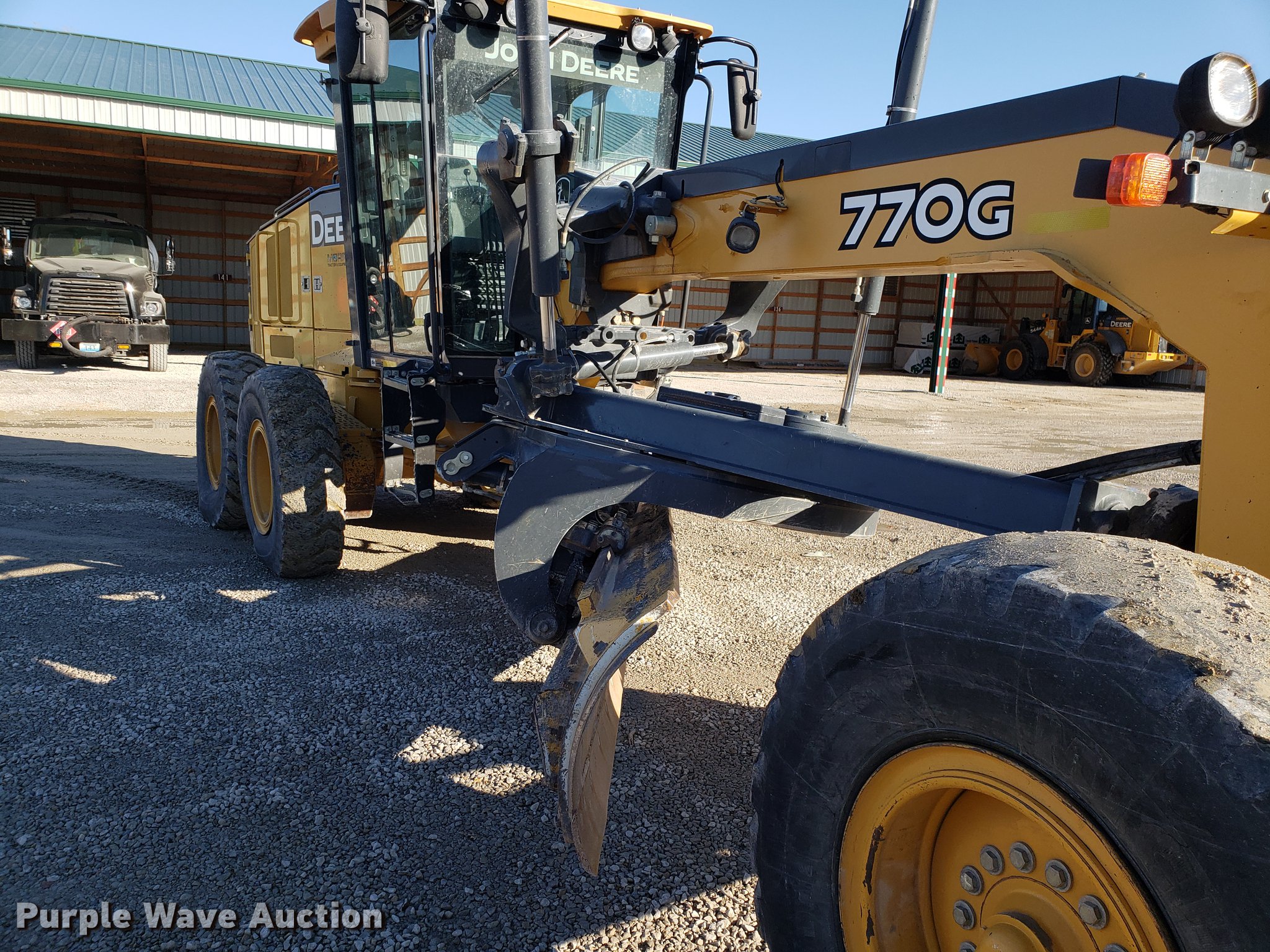 Purple Wave is selling a used Motor Grader in Missouri. This item is a 2011 John Deere 770G motor grader with the following: 7,837 hours on meter, John Deere 6090HDW16 six cylinder diesel engine, Serial RG6090R001294, Powershift transmission, 8F-8R gears, Differential lock, EROPS, AC and heat, AM/FM, Air suspension seat, Front and rear work lights, 12'W moldboard, Tip control, Side shift, 14R24 tires, Serial 1DW770GXCBE635085