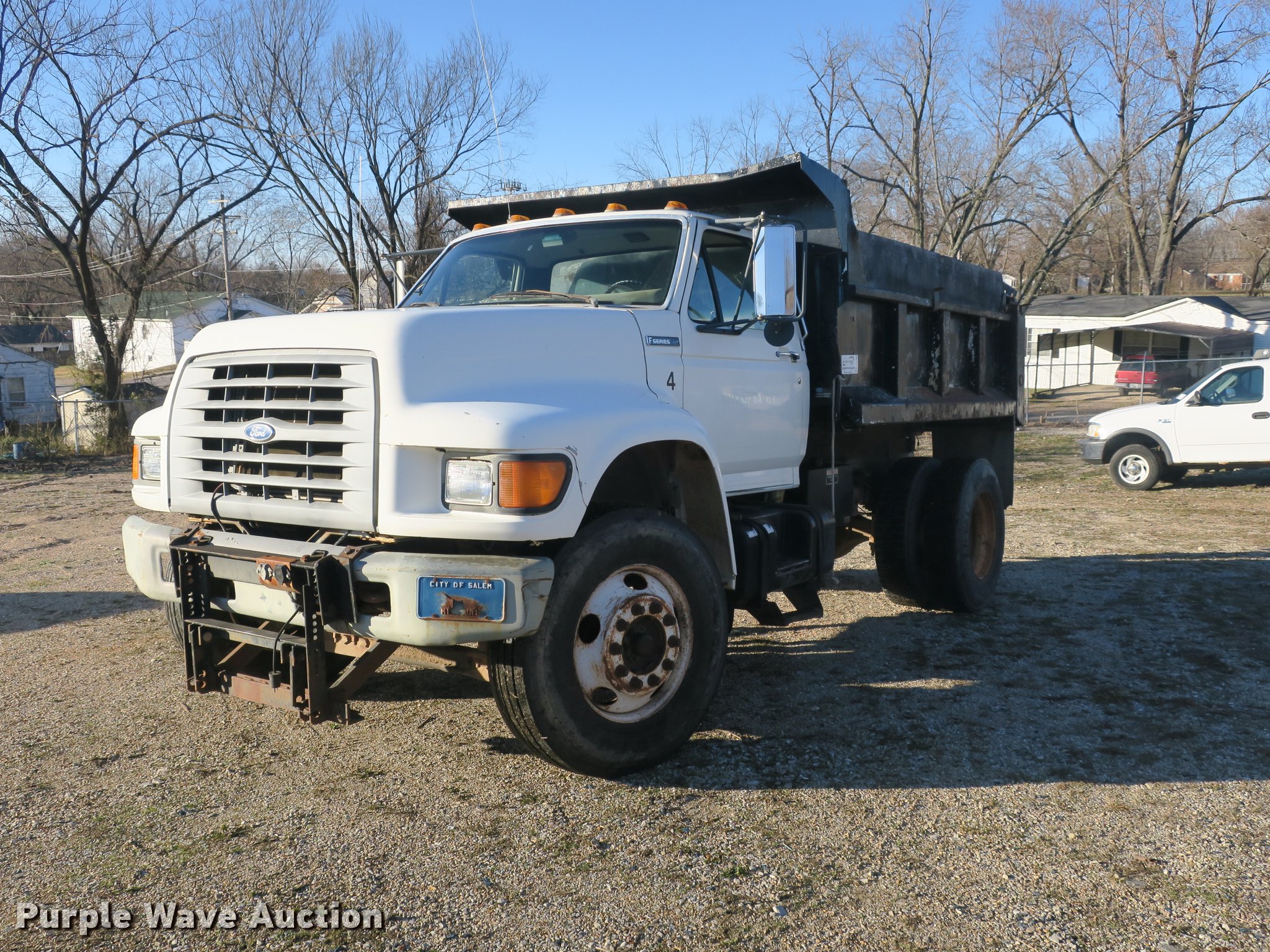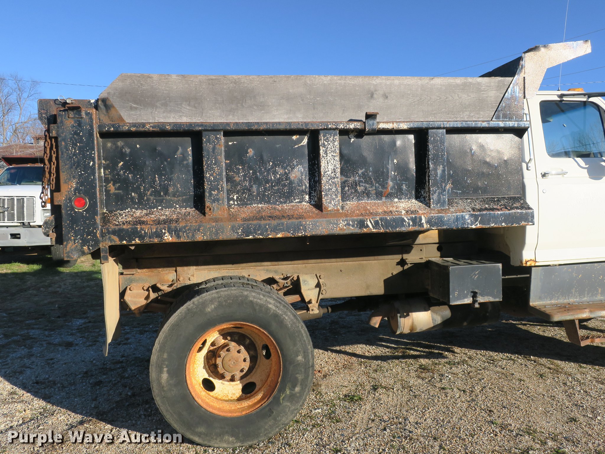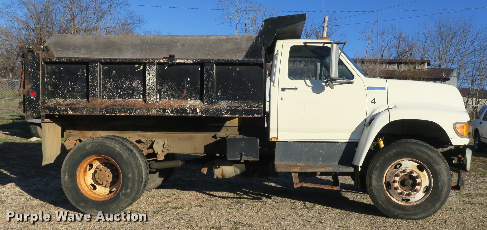 Purple Wave is selling a used Construction Dump Truck in Missouri. This item is a 1997 Ford F700 dump truck with the following: 81,189 miles on odometer, Cummins 5.9L L6 turbo diesel engine, Allison automatic transmission, Single axle, PTO, Heil SLT5YD10-0 dump bed, 10'L x 91"W, 28" side height, 12" side board height, Single ram hoist, Manual end gate, Spring suspension, Hydraulic brakes, 11R22.5 tires, GVWR 33,000 lbs