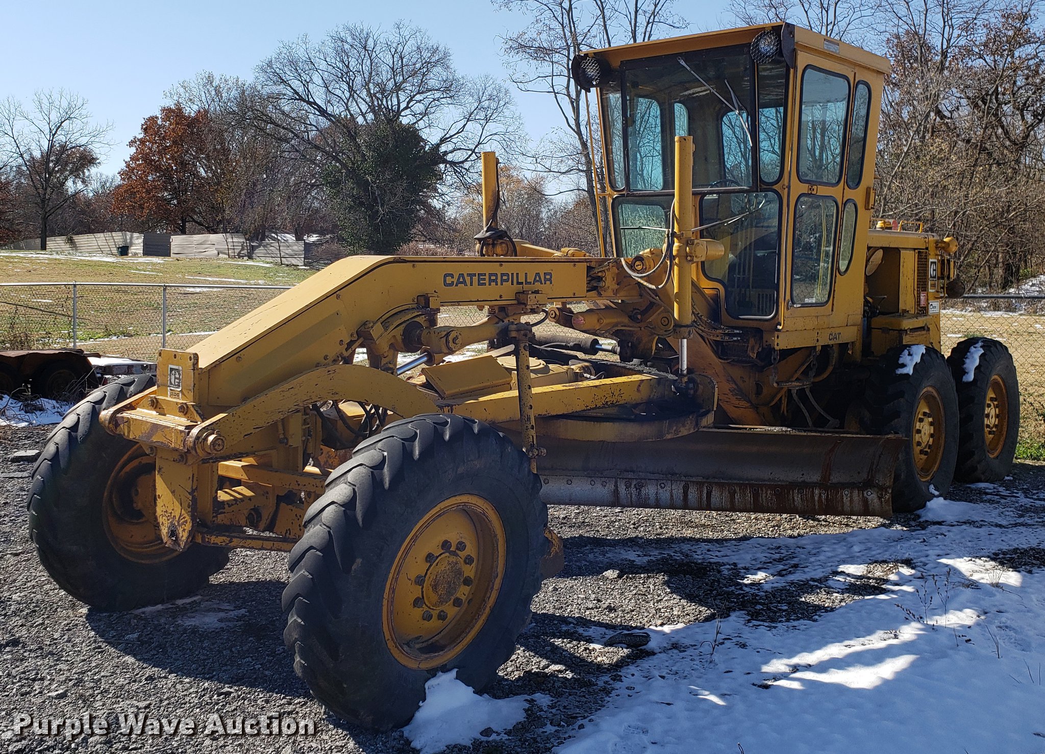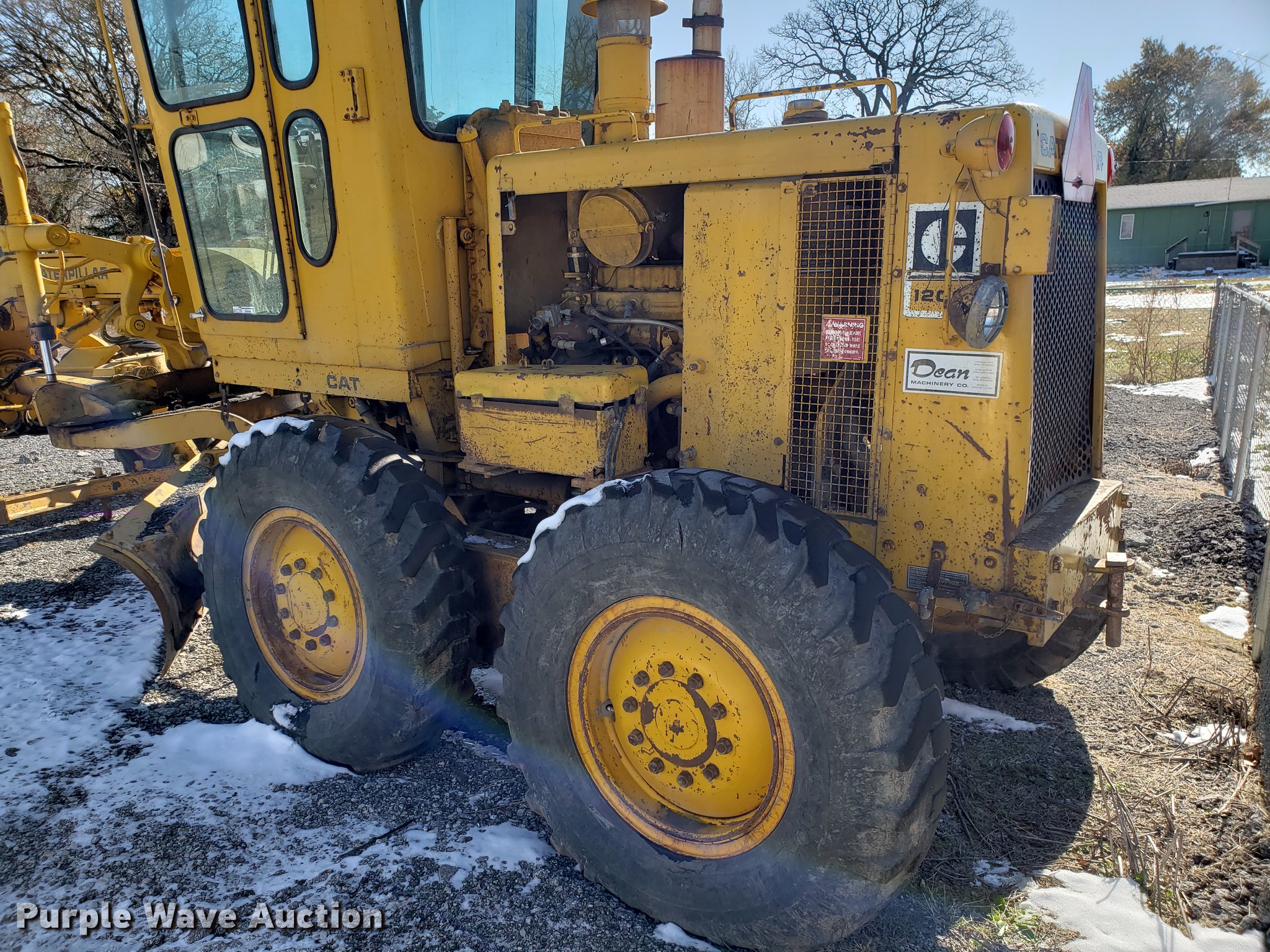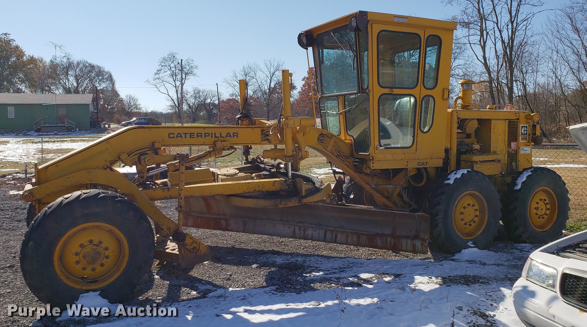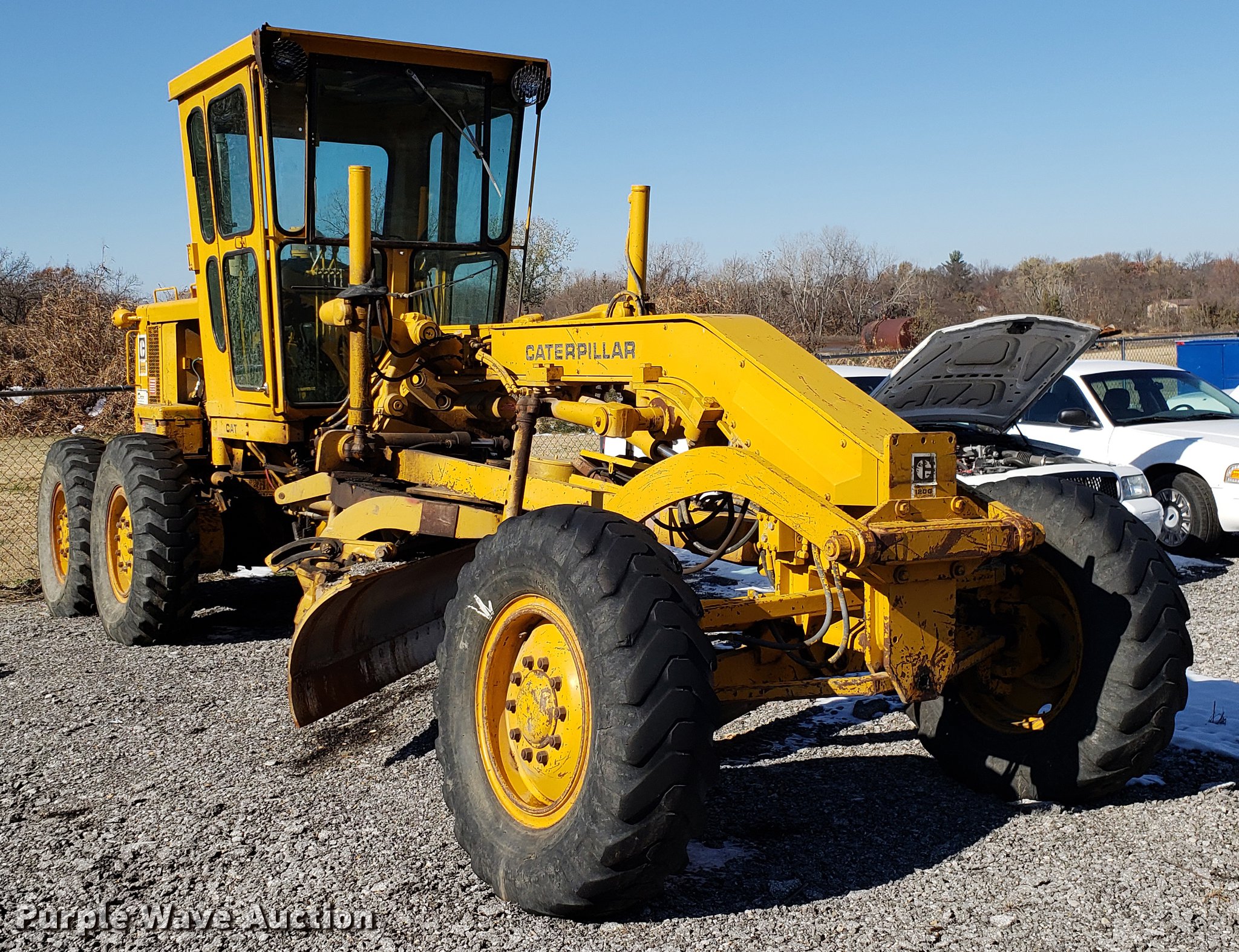 Purple Wave is selling a used Motor Grader in Missouri. This item is a Caterpillar 120G rigid frame motor grader with the following: 3,921 hours on meter, Caterpillar four cylinder turbo diesel engine, Powershift transmission, 6F-6R gears, EROPS enclosed cab, Heat, Air suspension seat, 12'W moldboard, Tip control, Side shift, 13-24 tires, Possible head gasket issue, Serial 87V3672