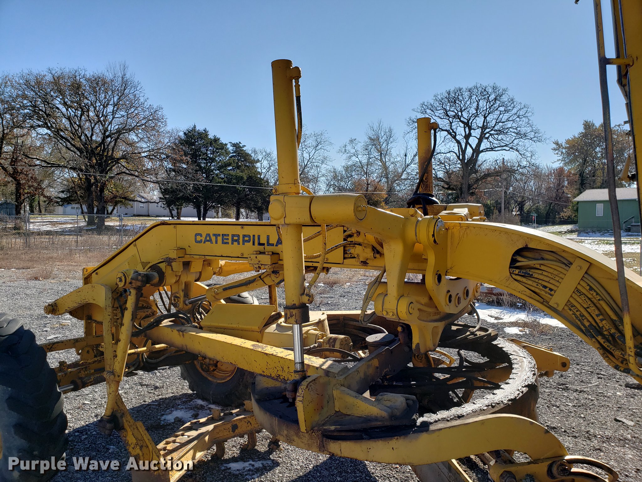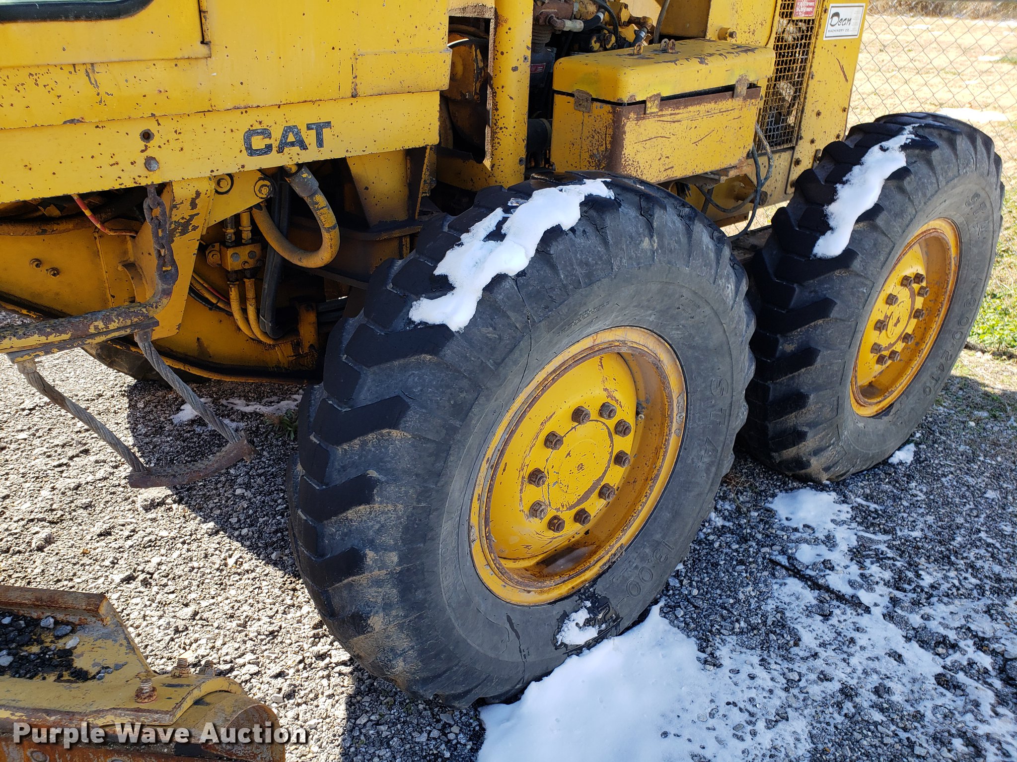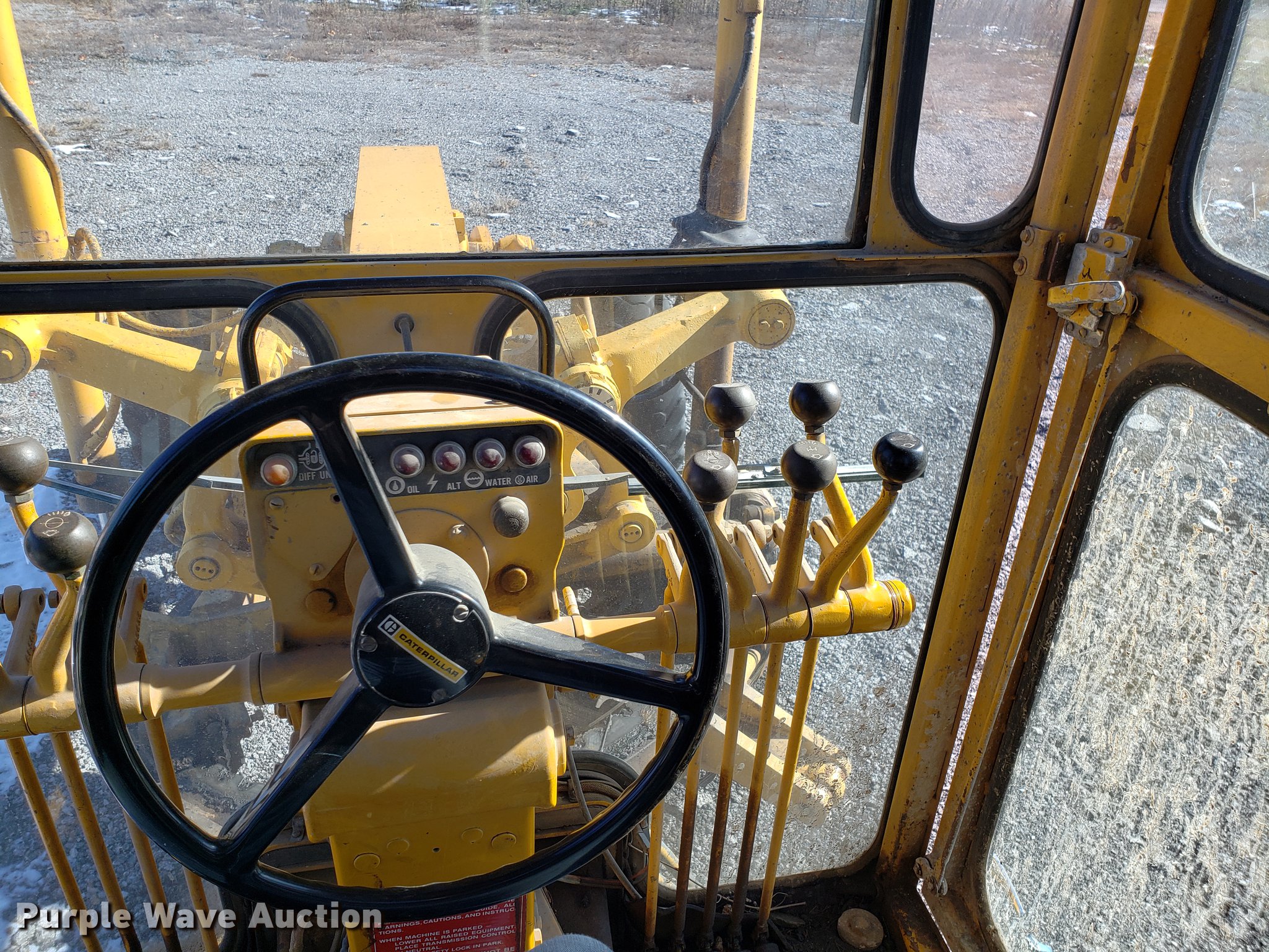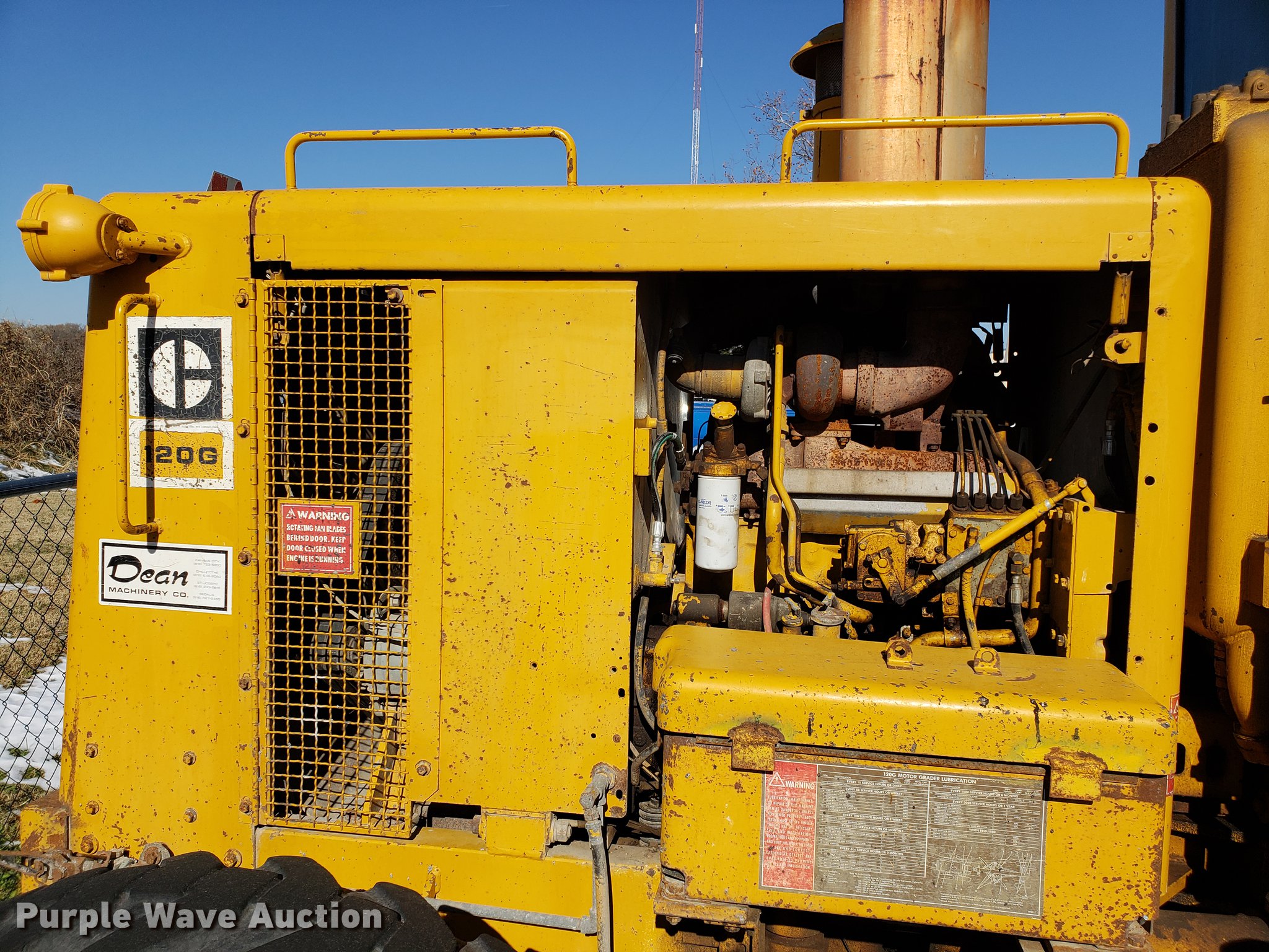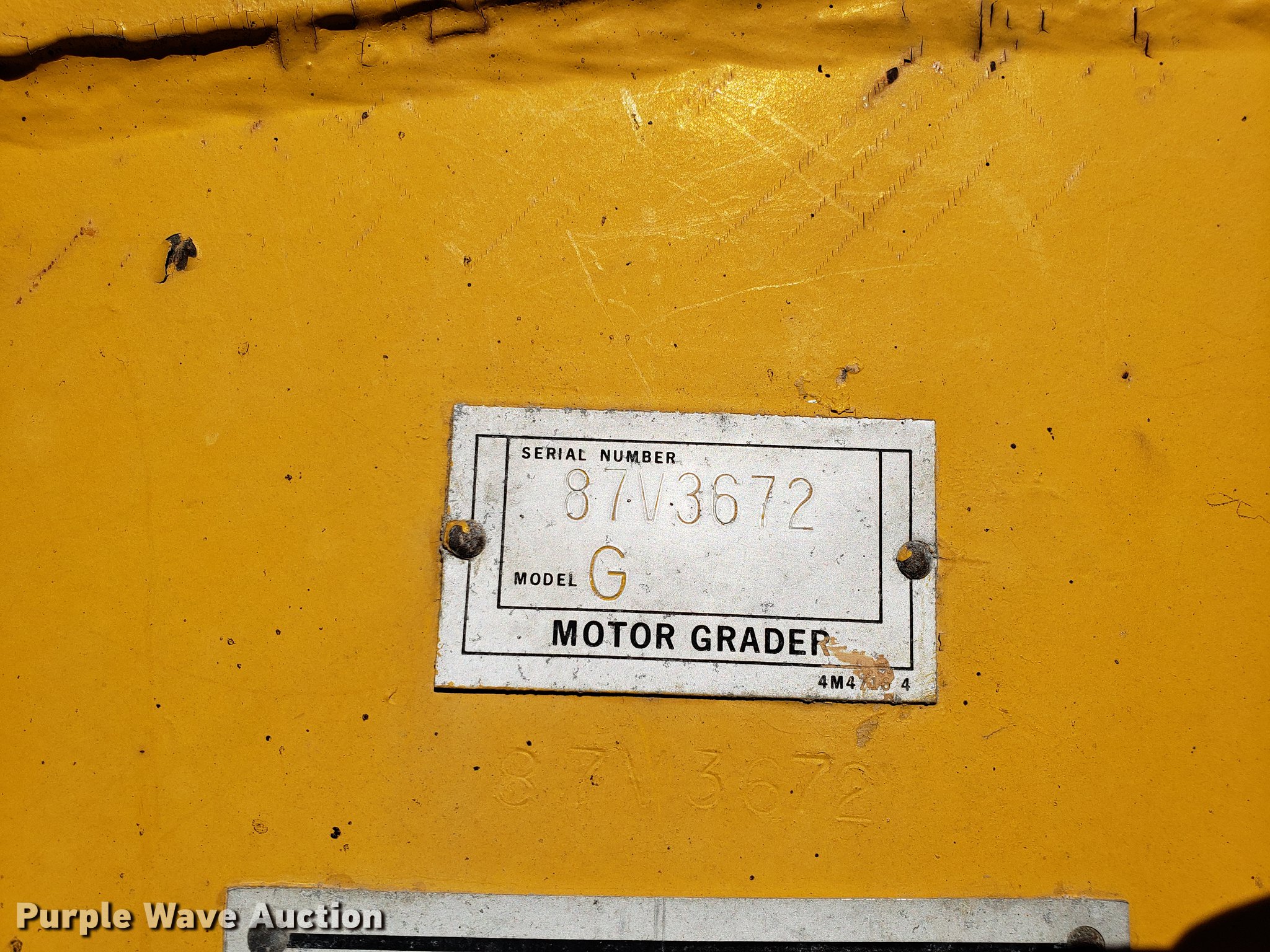 Purple Wave is selling a used Motor Grader in Missouri. This item is a Caterpillar 120G rigid frame motor grader with the following: 3,921 hours on meter, Caterpillar four cylinder turbo diesel engine, Powershift transmission, 6F-6R gears, EROPS enclosed cab, Heat, Air suspension seat, 12'W moldboard, Tip control, Side shift, 13-24 tires, Possible head gasket issue, Serial 87V3672