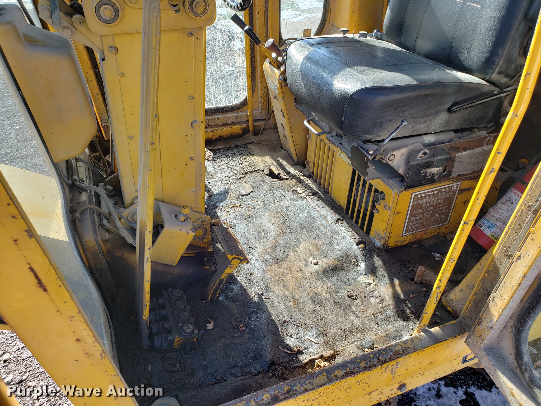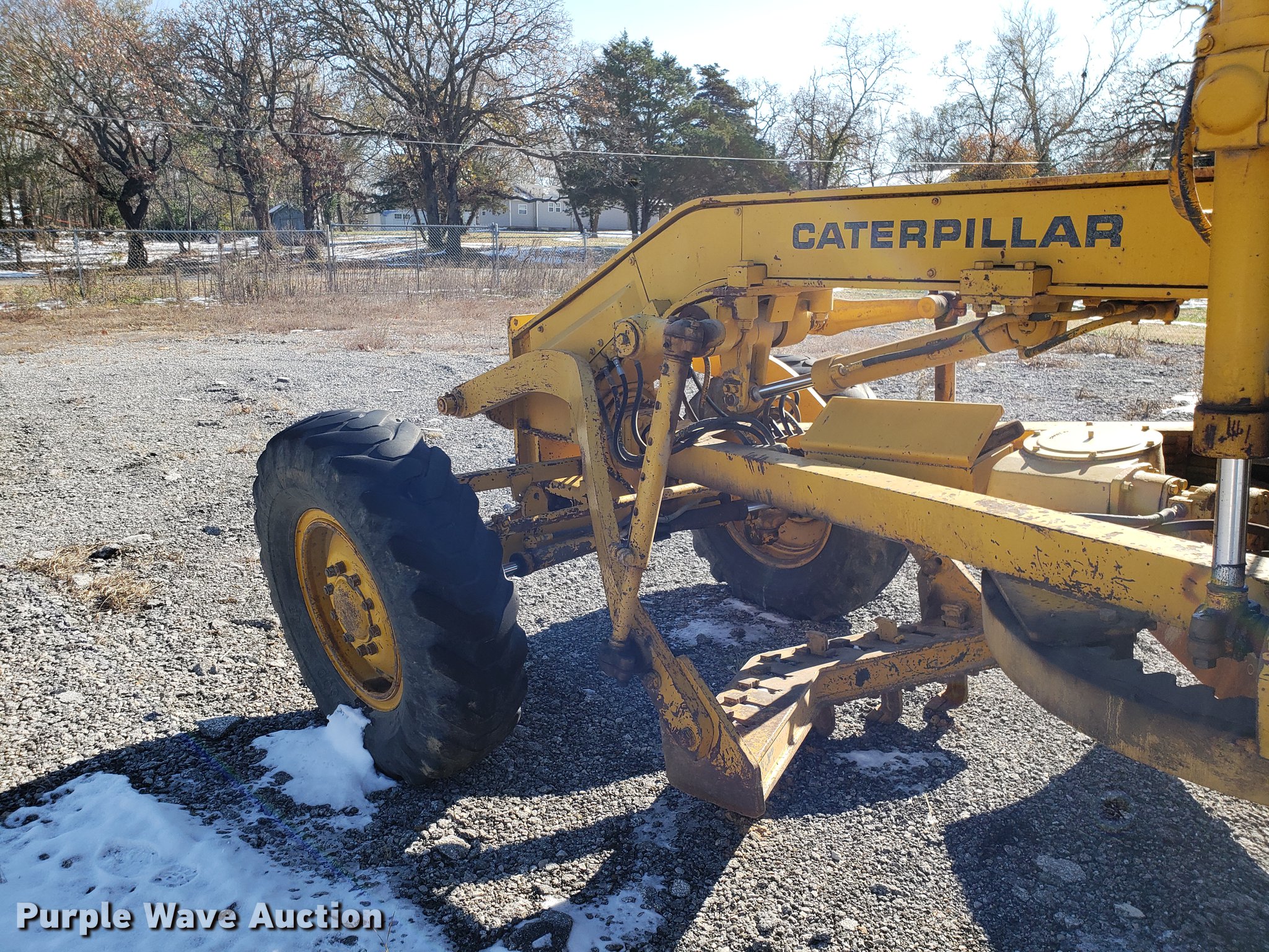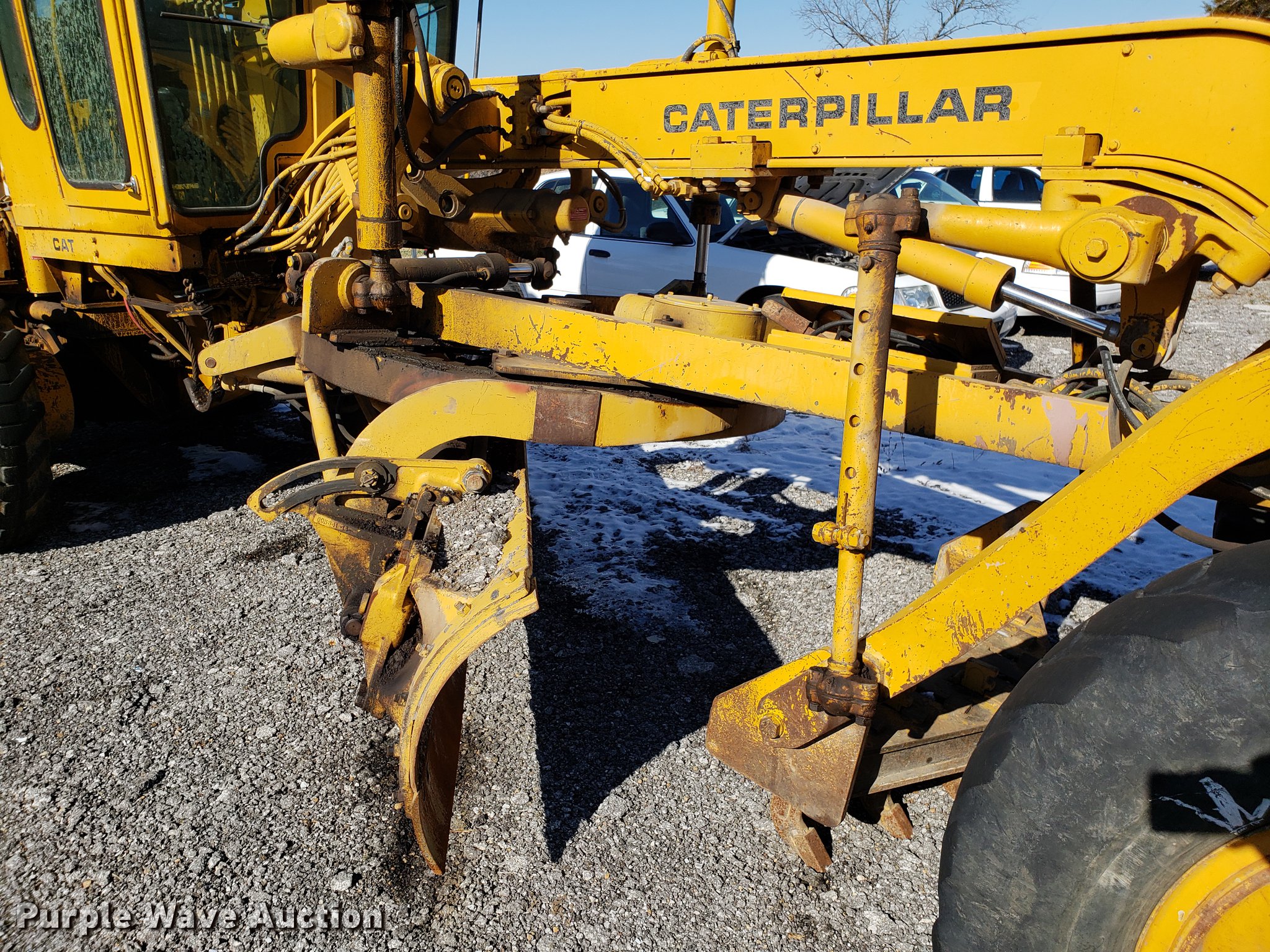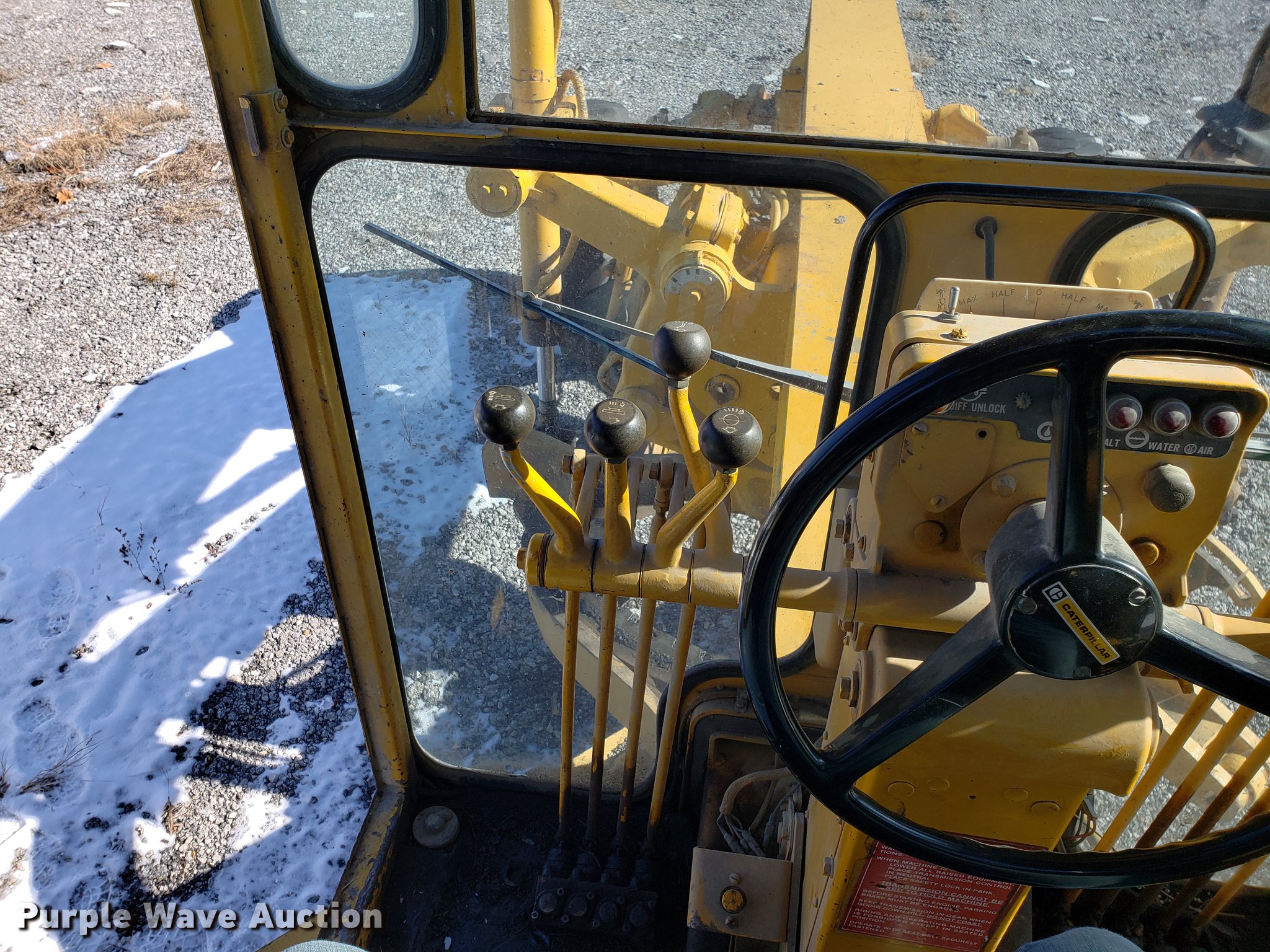 Purple Wave is selling a used Motor Grader in Missouri. This item is a Caterpillar 120G rigid frame motor grader with the following: 3,921 hours on meter, Caterpillar four cylinder turbo diesel engine, Powershift transmission, 6F-6R gears, EROPS enclosed cab, Heat, Air suspension seat, 12'W moldboard, Tip control, Side shift, 13-24 tires, Possible head gasket issue, Serial 87V3672