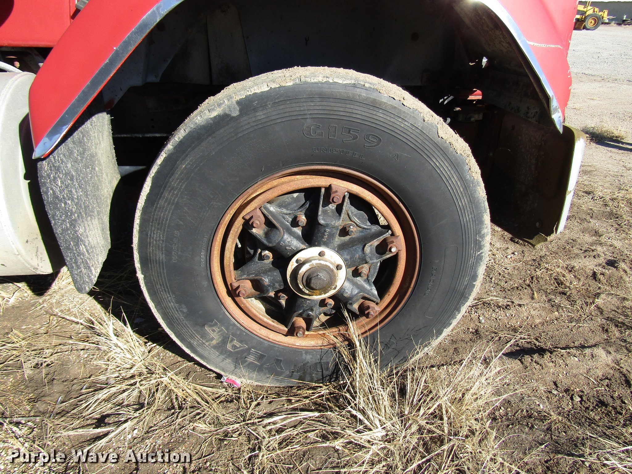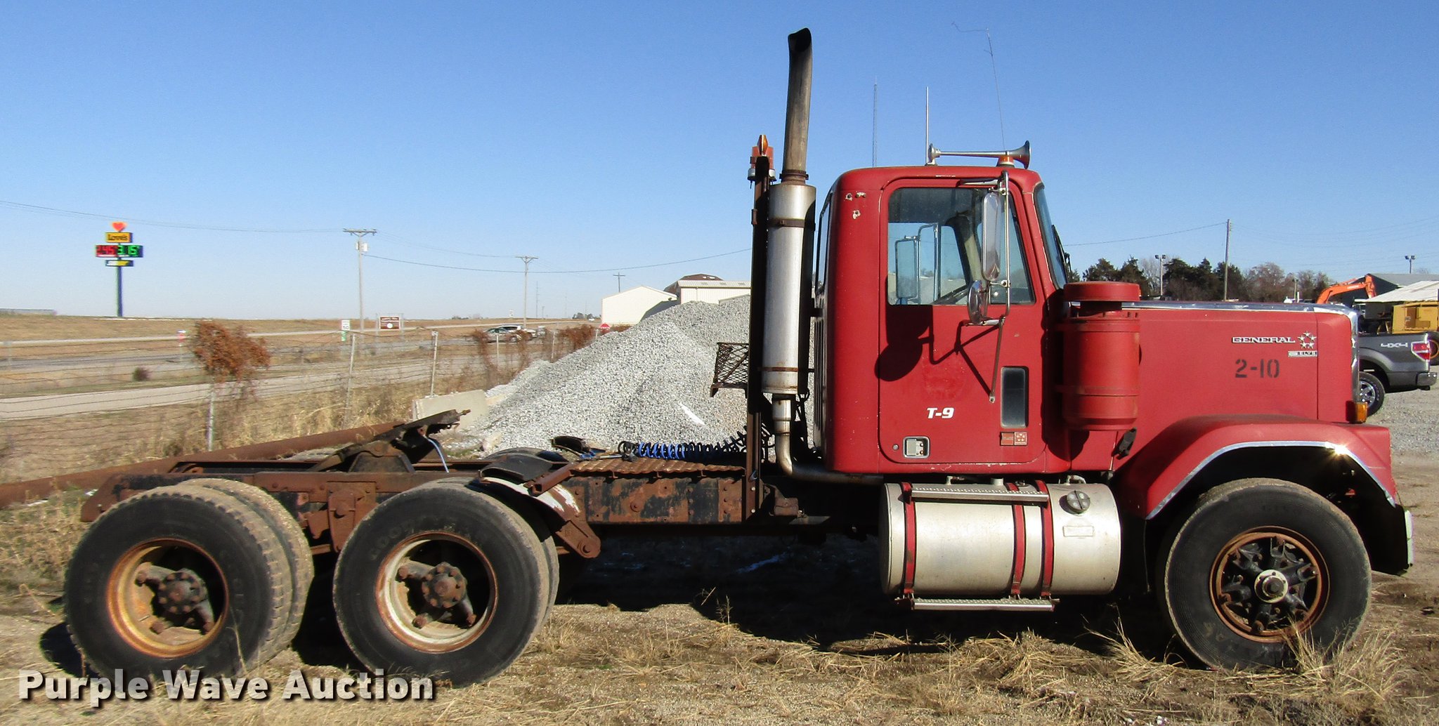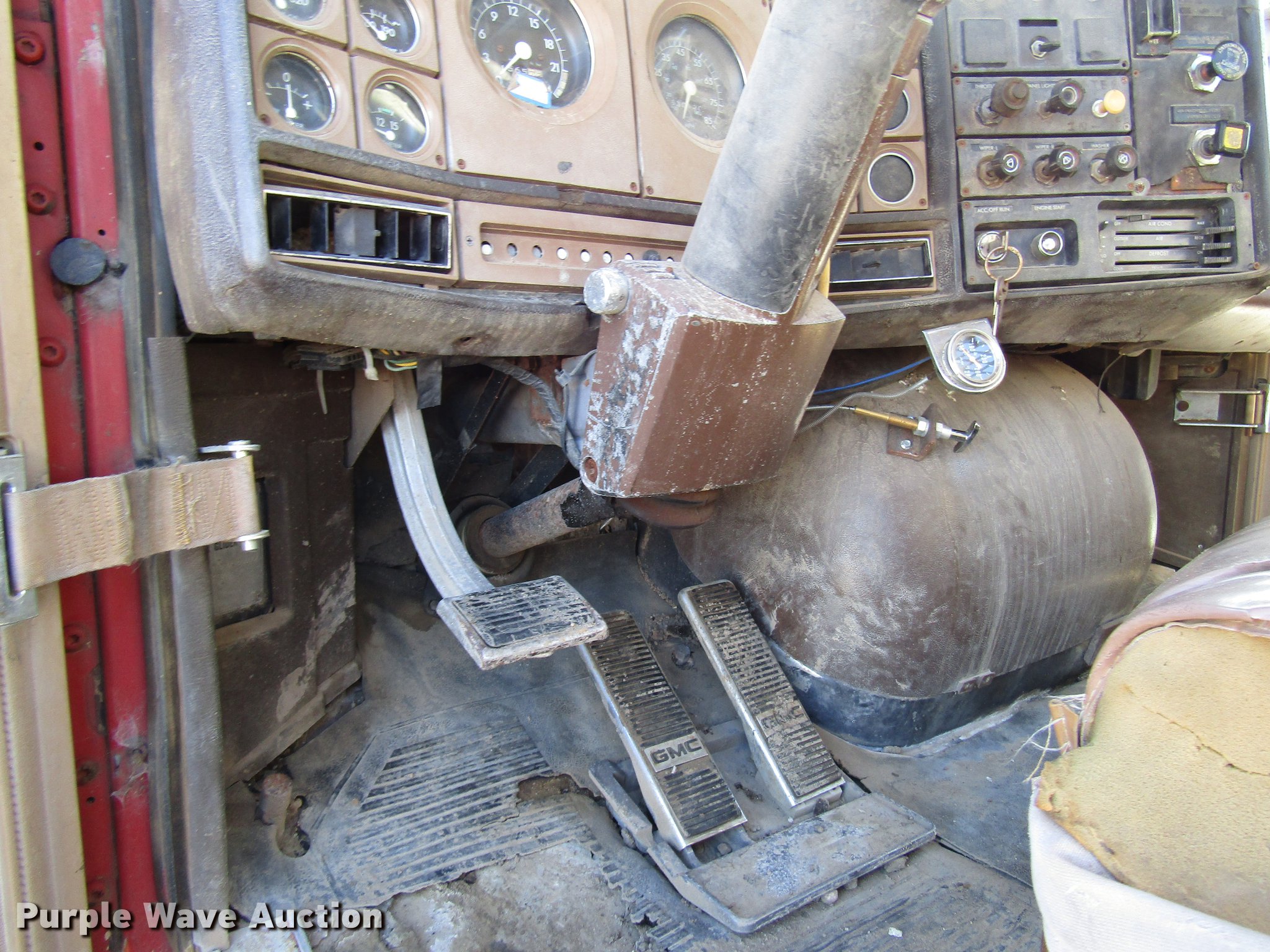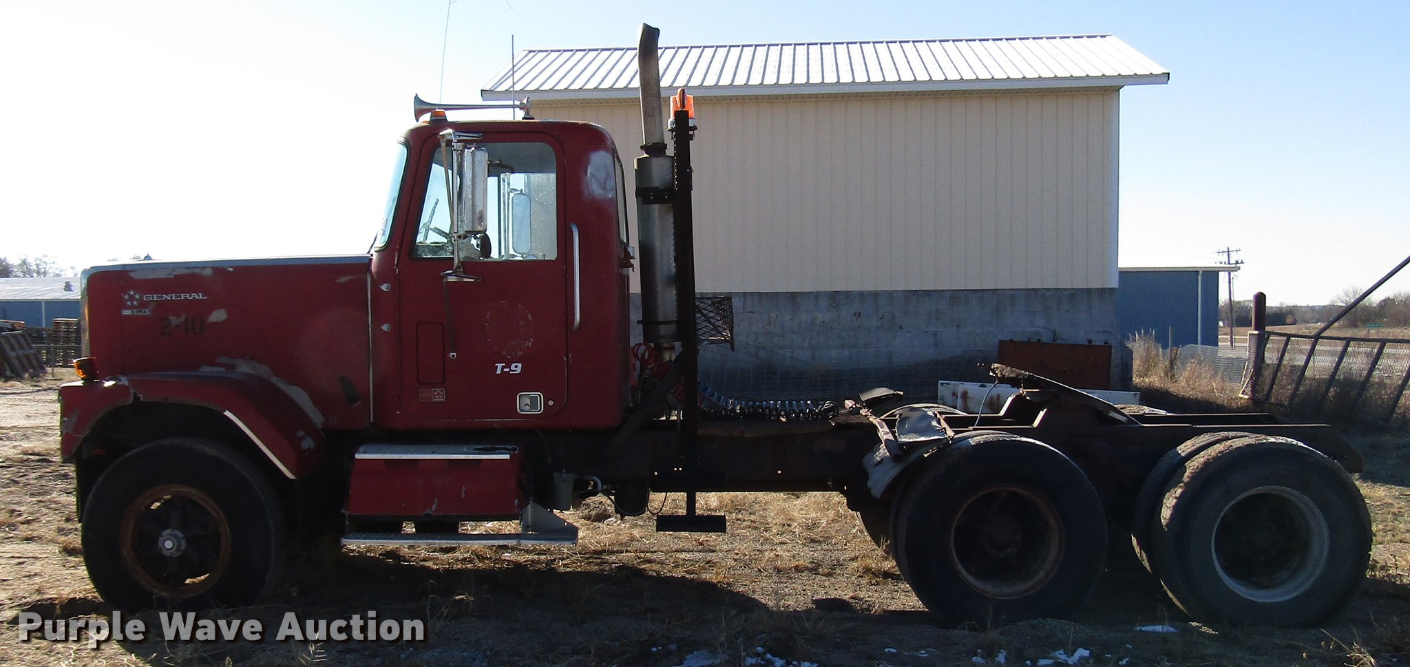 Purple Wave is selling a used Truck Tractor in Kansas. This item is a 1980 GMC General semi truck with the following: 530,120 miles on odometer, 1,565 hours on meter, Cummins NHC250 six cylinder diesel engine, Serial 11658445, Nine speed manual transmission, Tandem axle, Full differential lock, Heat, AM/FM, Air suspension seat, Block heater, Front tow hooks, Headache rack, Chain hanger, Single rear exhaust stack, Steel deck plate, Fixed fifth wheel plate, Single fuel tank, Quarter fenders, Spring suspension, Air brakes, 190" wheelbase, 11R22.5 tires, Rear end third member out