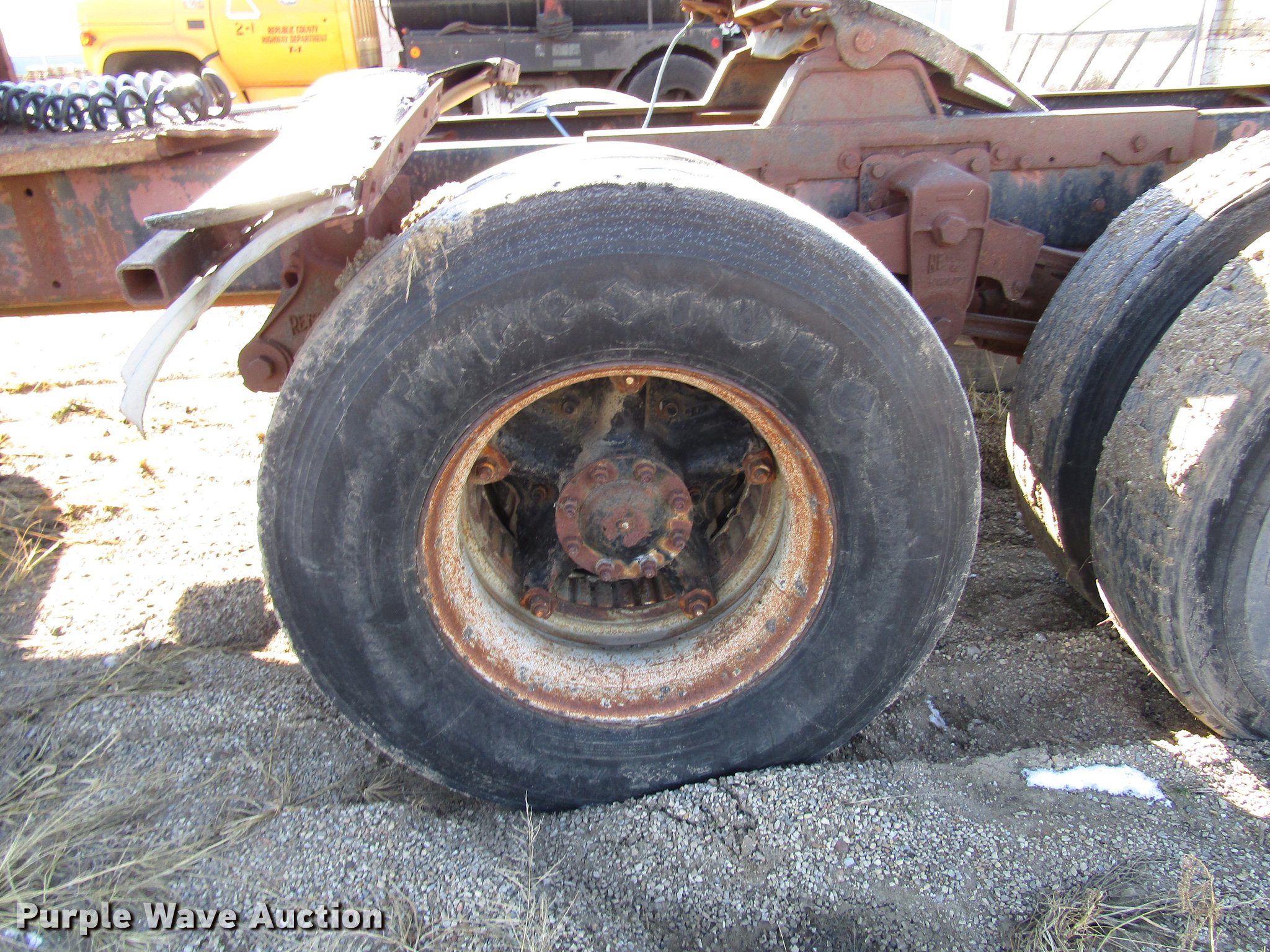 1980 GMC General semi truck. 530,120 miles on odometer, 1,565 hours on meter, Cummins NHC250 six cylinder diesel engine Serial 11658445, Nine speed manual transmission, Tandem axle, Full differential lock, Heat, AM/FM, Air suspension seat, Block heater, Front tow hooks, Headache rack Chain hanger, Single rear exhaust stack, Steel deck plate, Fixed fifth wheel plate, Single fuel tank, Quarter fenders, Spring suspension, Air brakes, 190" wheelbase, 11R22.5 tires, Rear end third member out. Kansas title. T09FCAV900064. Republic County Works Department. 702 K St. Belleville, KS 66935
