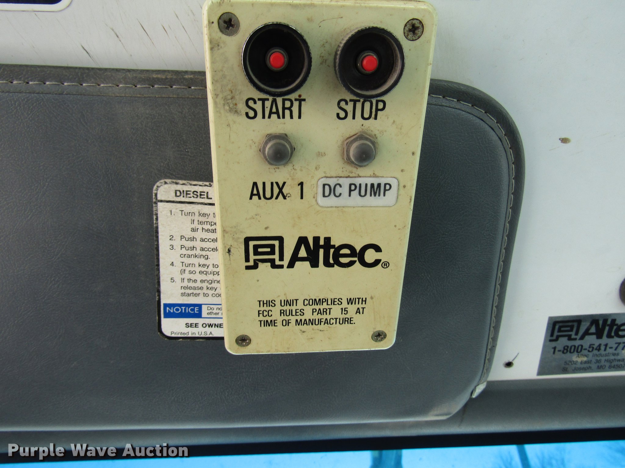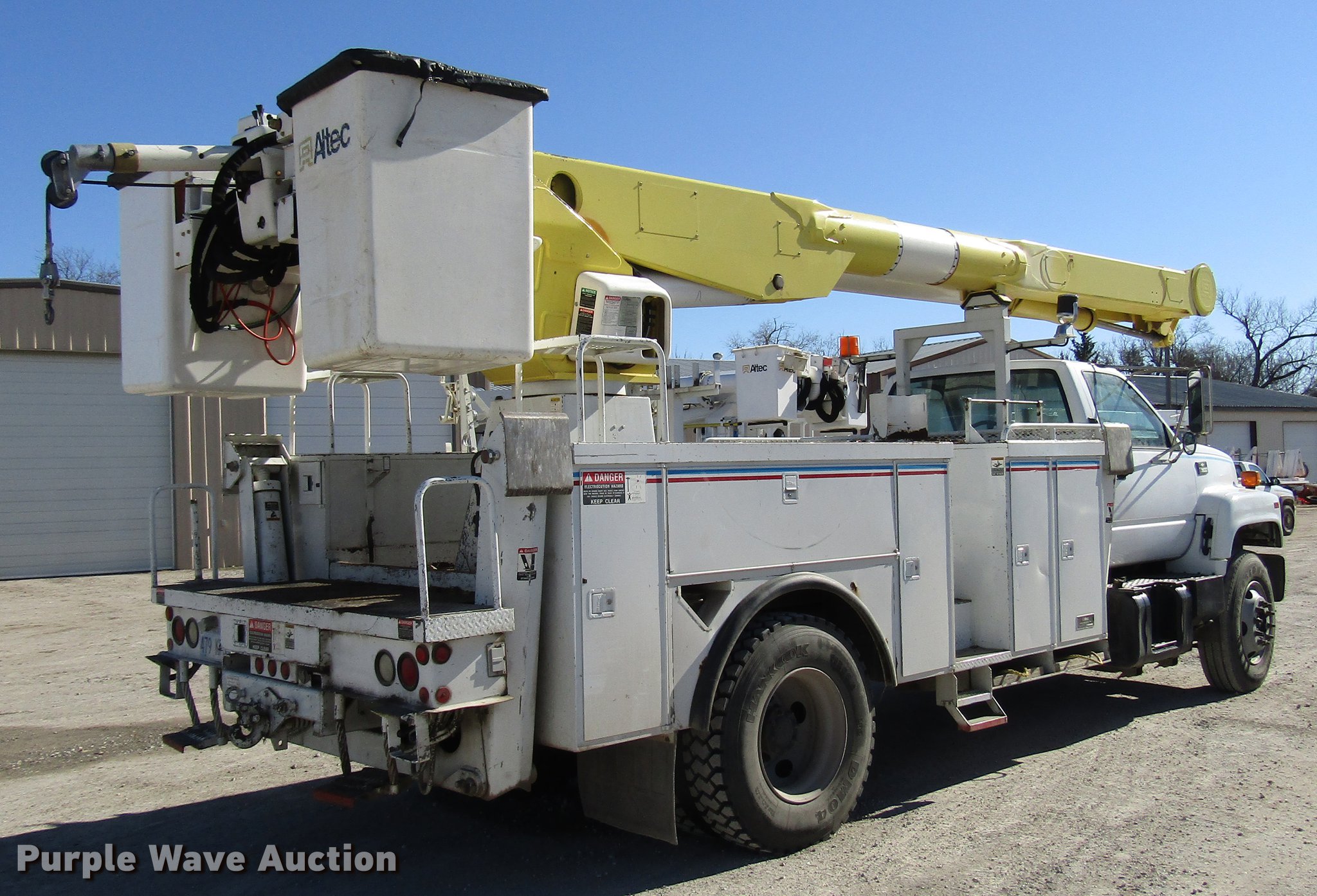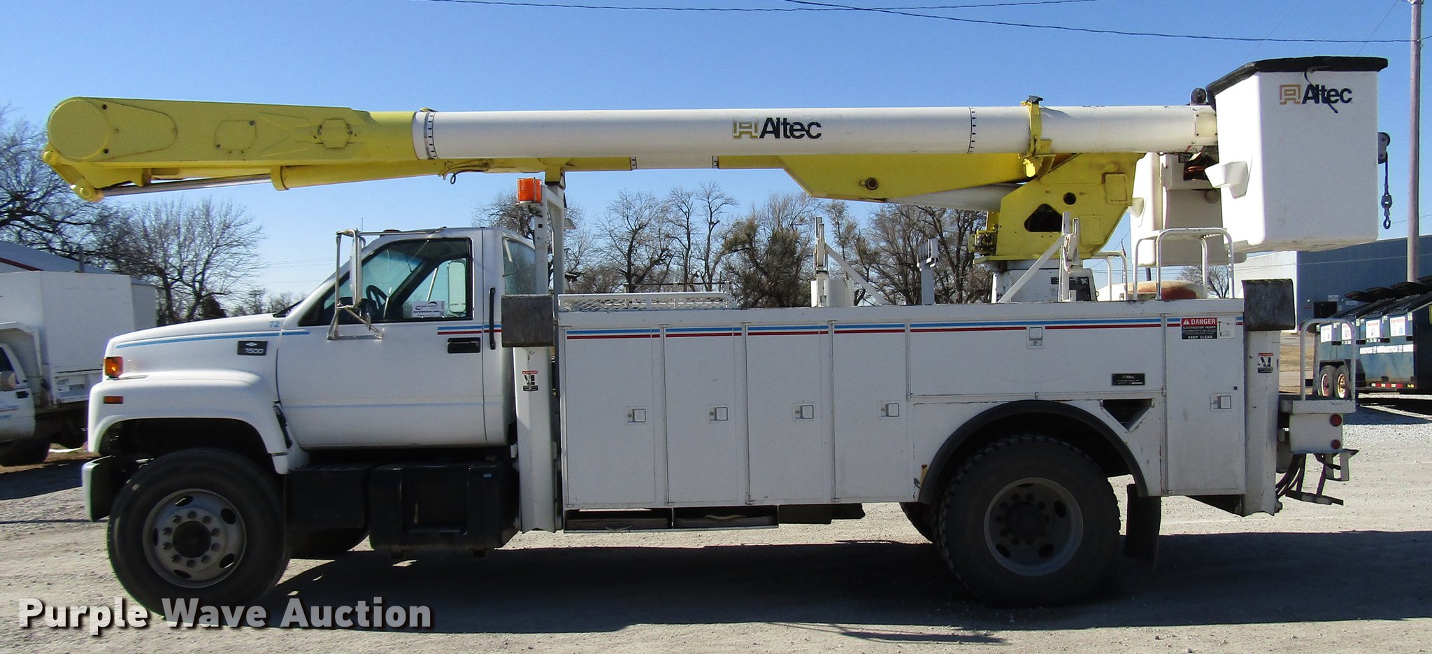 Purple Wave is selling a used Bucket Truck in Kansas. This item is a 1997 Chevrolet C7500 bucket truck with the following: 48,623 miles on odometer, 9,724 PTO hours on meter, Caterpillar 3116 6.6L L6 turbo diesel engine, Serial 9GK57506, Five speed manual transmission, Single axle, AC and heat, AM/FM, Auxiliary controls, Beacon light, Block heater, Front tow hooks, Quick-connect power outlet, PTO, Altec service bed, 15'L, Shelving, Slide-out drawers, Utility rack, Compartment lighs, Work lights, Brutus inverter, Serial 37-66021, 1997 Altec AM855 boom, 55' boom length, 350 lbs max lift capacity, Man basket, 55' max lift height, Hydraulic quick coupler on basket, Ground and platform controls, Boom rotation, Articulating boom, (4) outriggers, Serial 0297BB0750, Dual fuel tanks, Pintle hitch, Trailer wiring, Spring suspension, Air brakes, 197" wheelbase, 11R22.5 tires, GVWR 33,000 lbs, Possible air leak