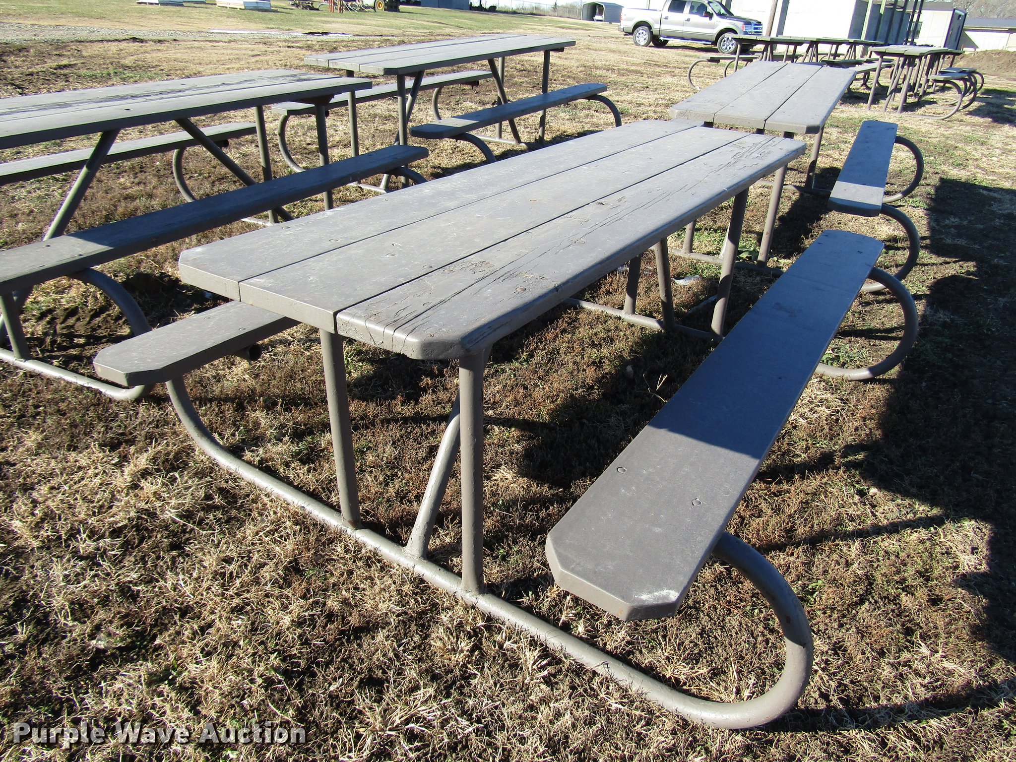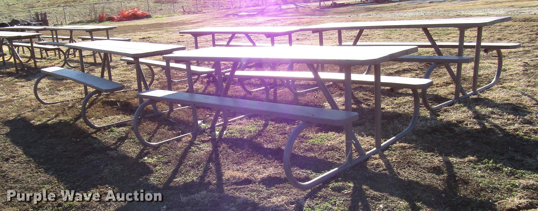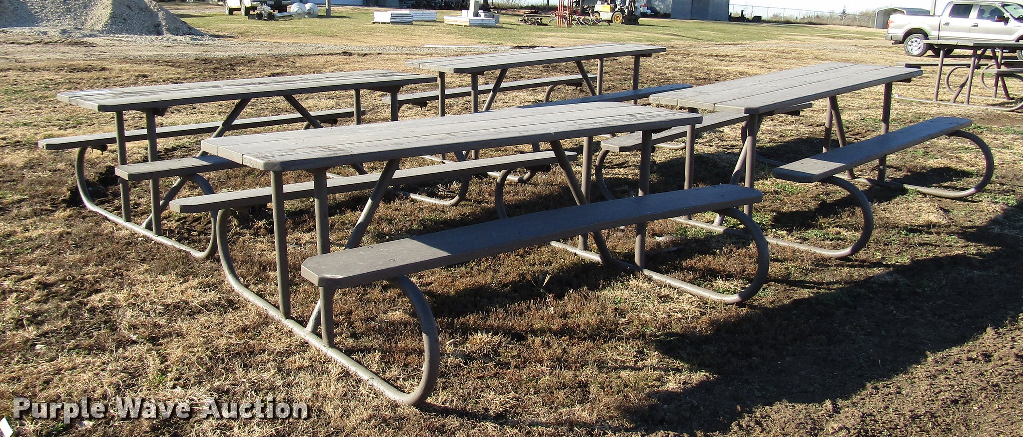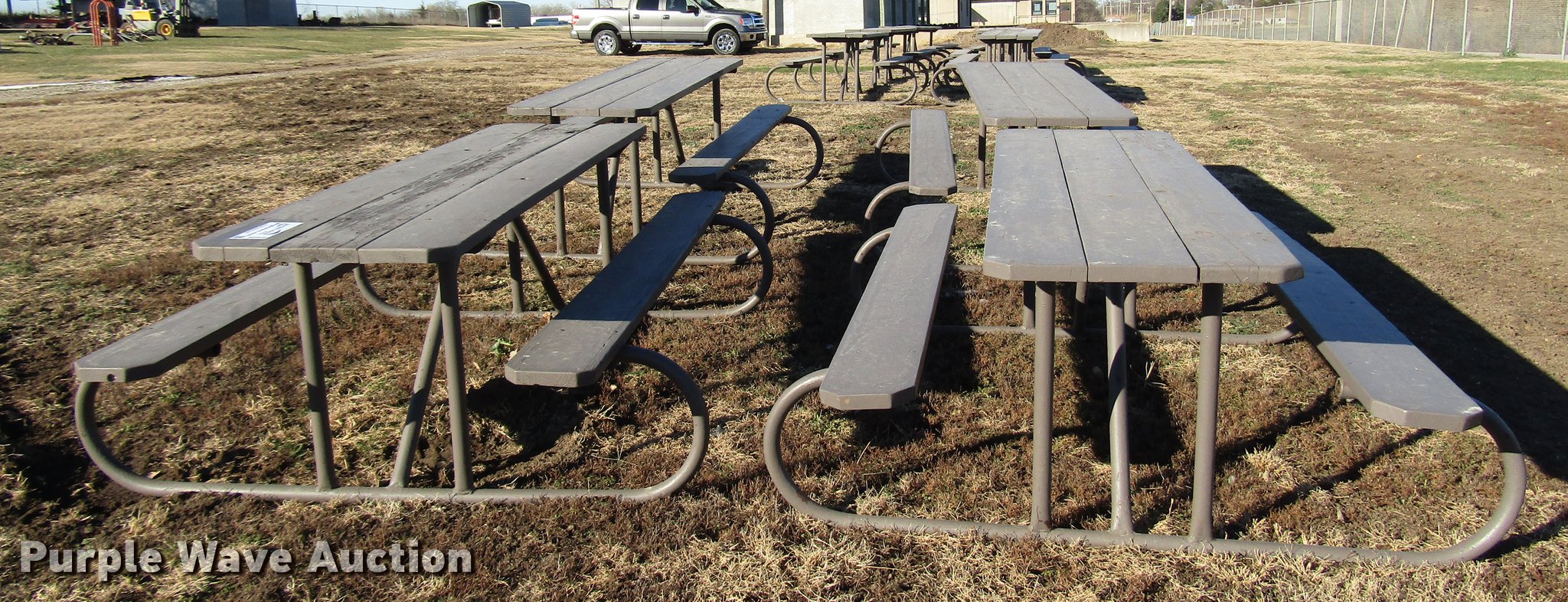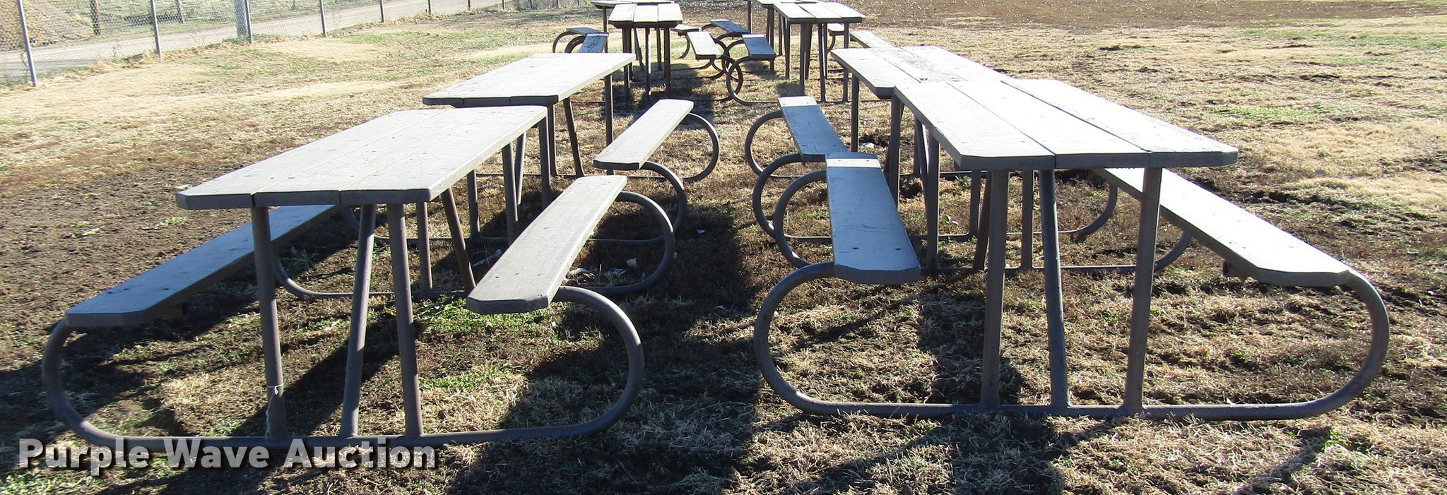 Purple Wave is selling a used Furniture in Kansas. This item is a (4) picnic tables with the following: 8'L x 28"W x 32.5"H table, 8'L x 9.5"W x 21"H seat
