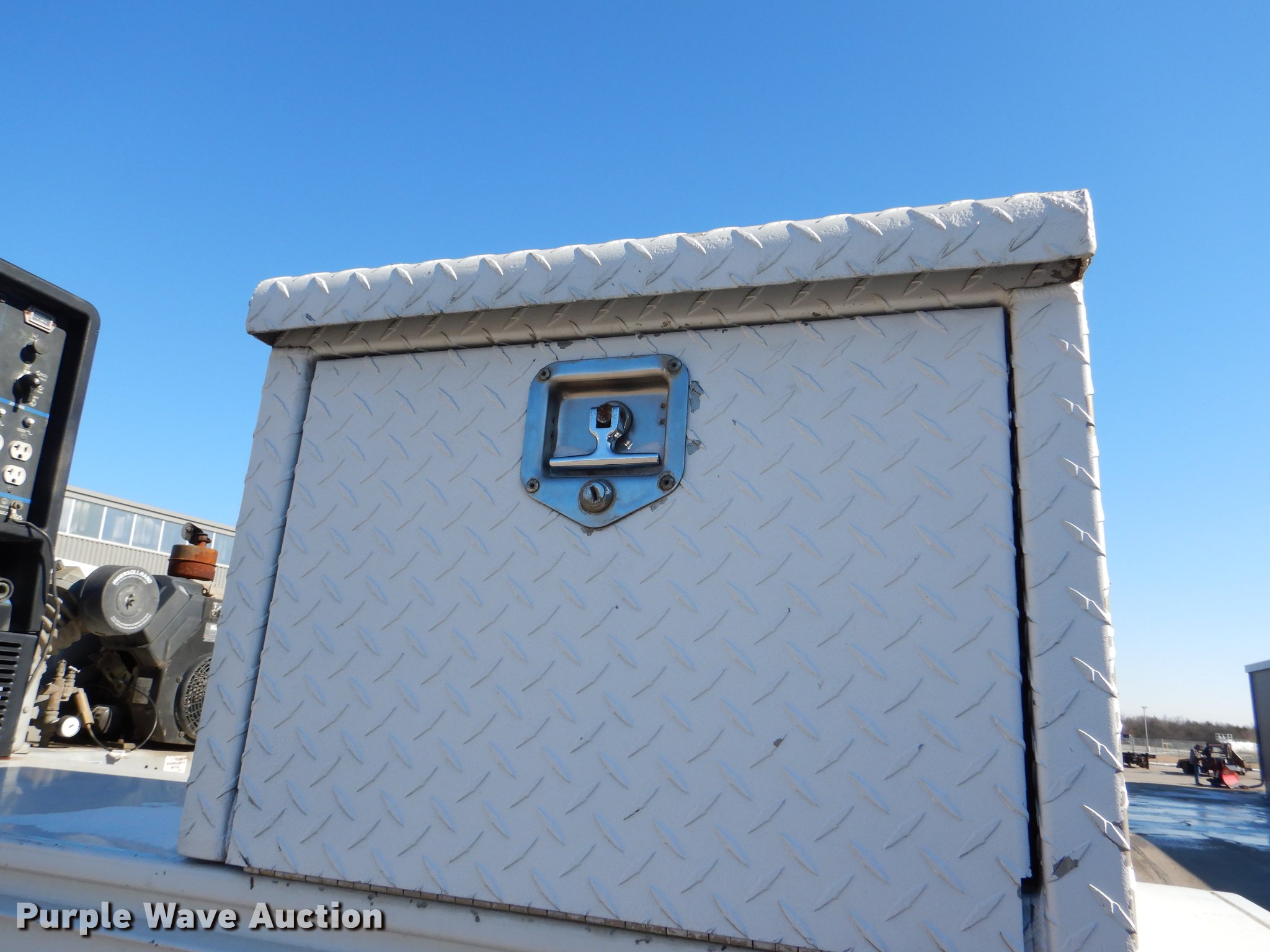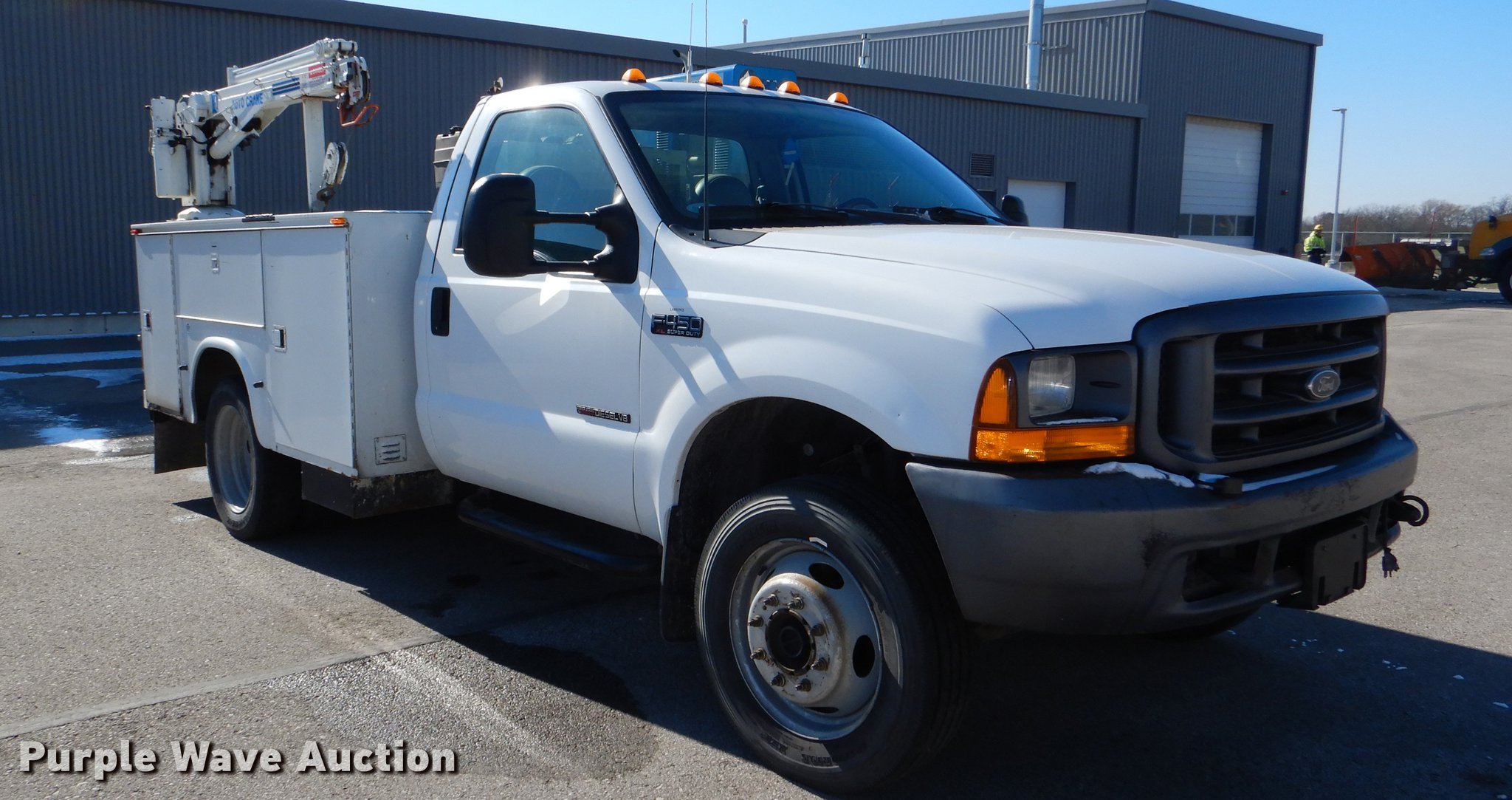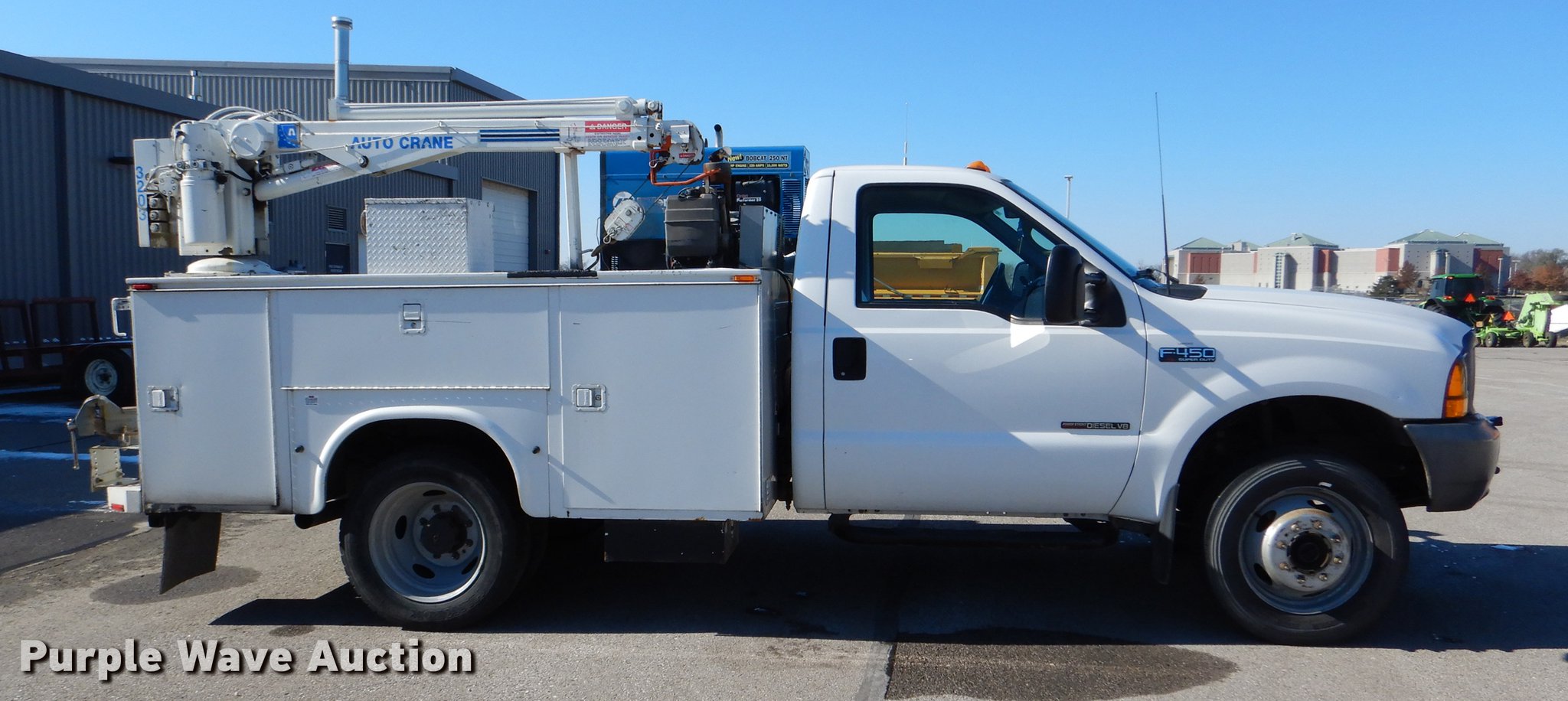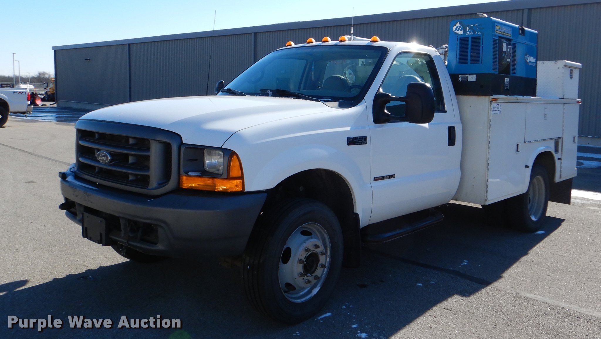Purple Wave is selling a used Service Truck in Kansas. This item is a 1999 Ford F450 Super Duty service truck with crane with the following: 100,262 miles on odometer, 7.3L V8 turbo diesel engine, Automatic transmission, Four wheel drive, Single axle, AC and heat, AM/FM/CD, Front tow hooks, Knapheide service bed, 9'L, Shelving, Mounted vise, Miller Bobcat 250NT welder/generator, 127 hours on meter, Onan 20 HP gas engine, 240V outlet, (4) 120V outlets, 10,000 watt, CC, CV, and stick capabilities, Ingersoll Rand air compressor, Kohler Command 11 HP gas engine,, Auto Crane 3203 crane, 15' boom length, 3,200 lbs max lift capacity, Remote control, Single fuel tank, Spring suspension, Hydraulic brakes, 225/70R19.5 tires, GVWR 15,000 lbs