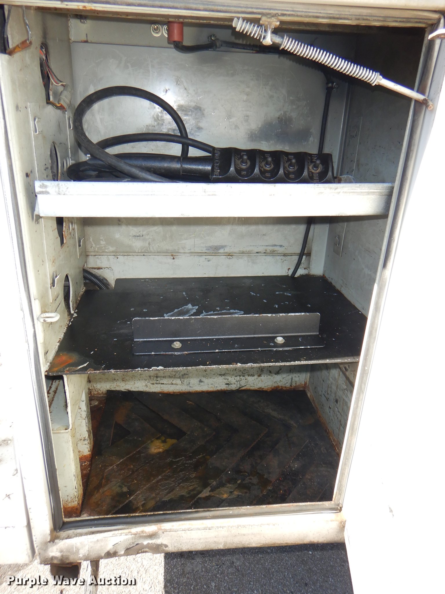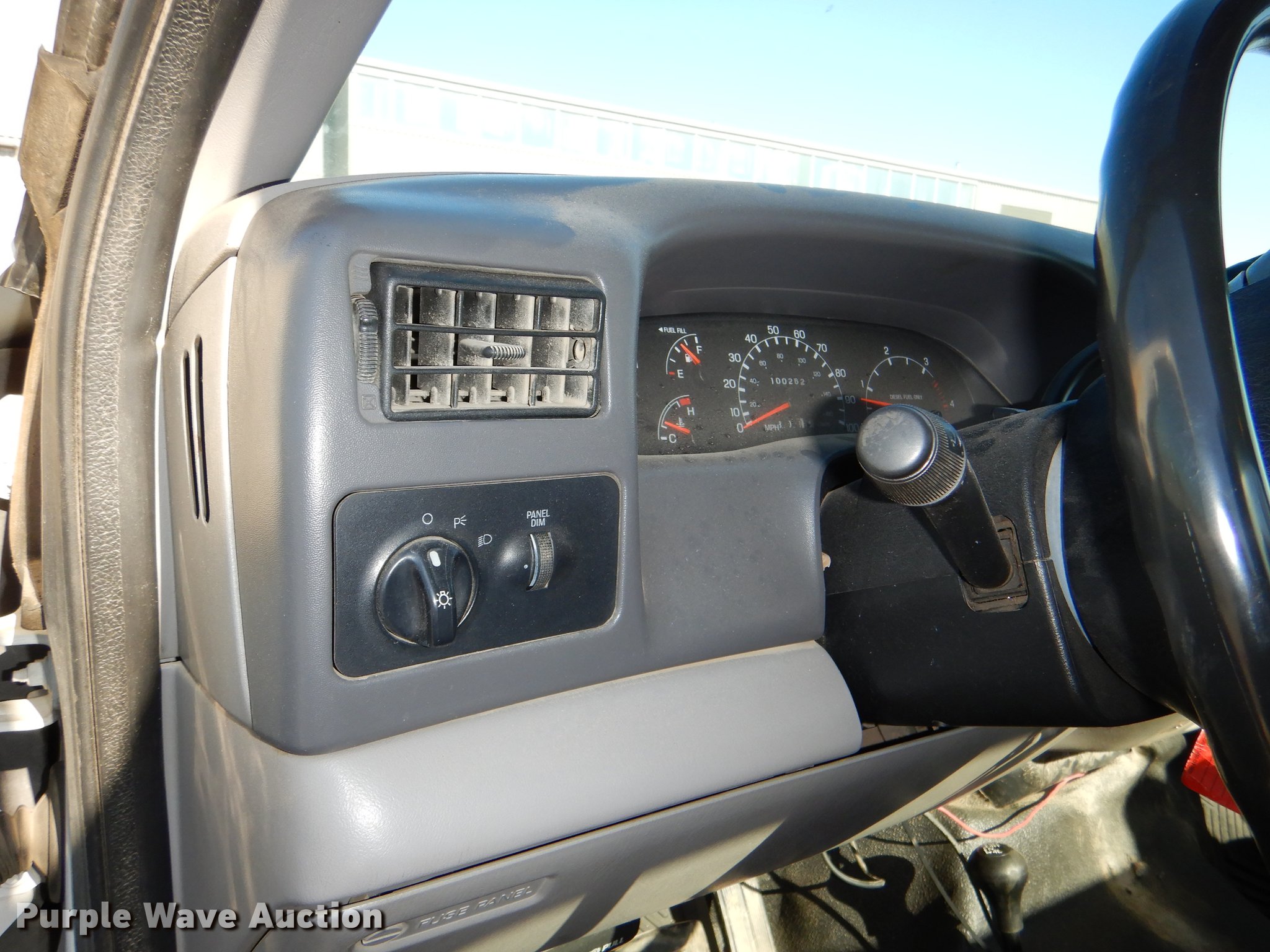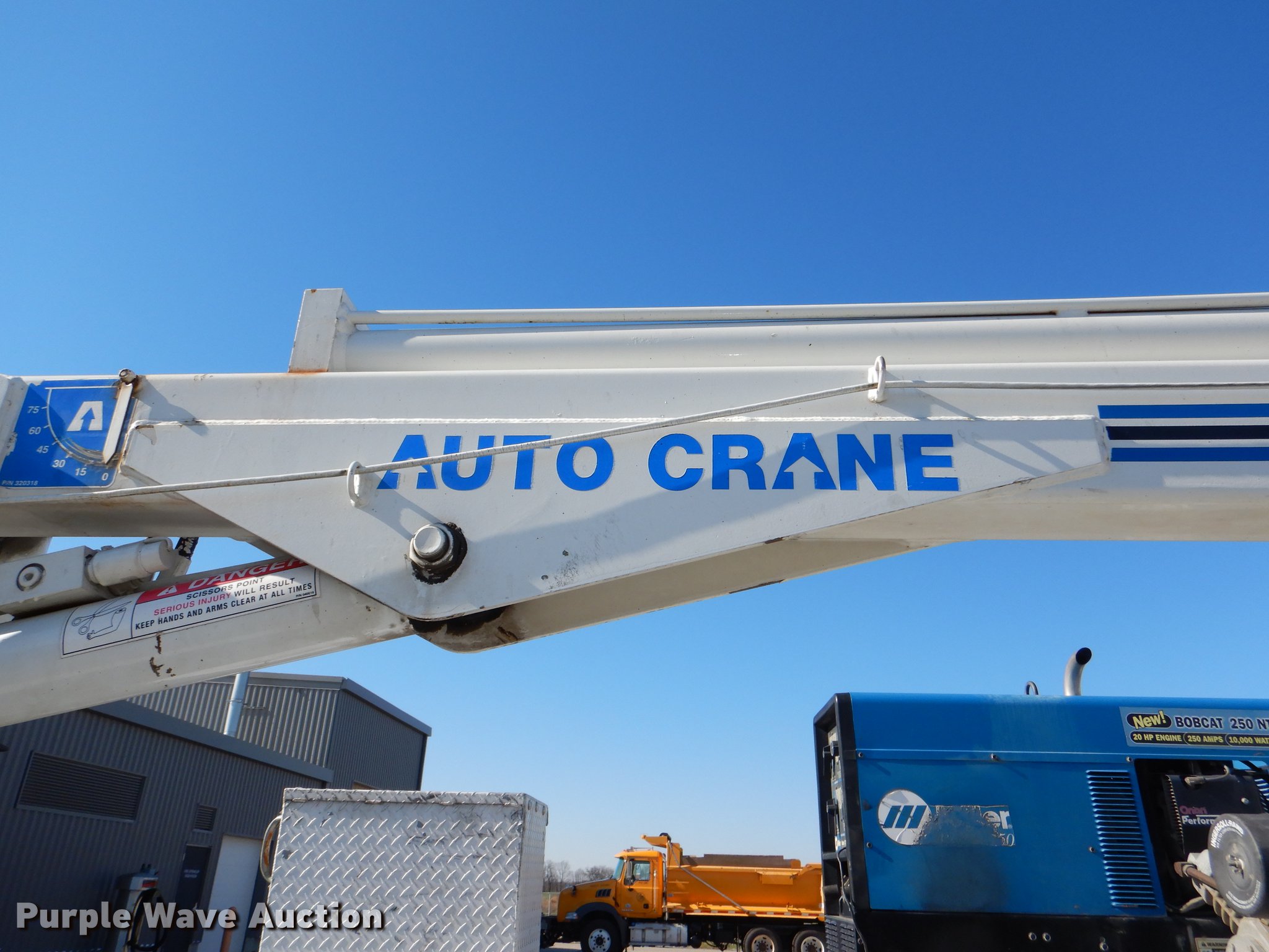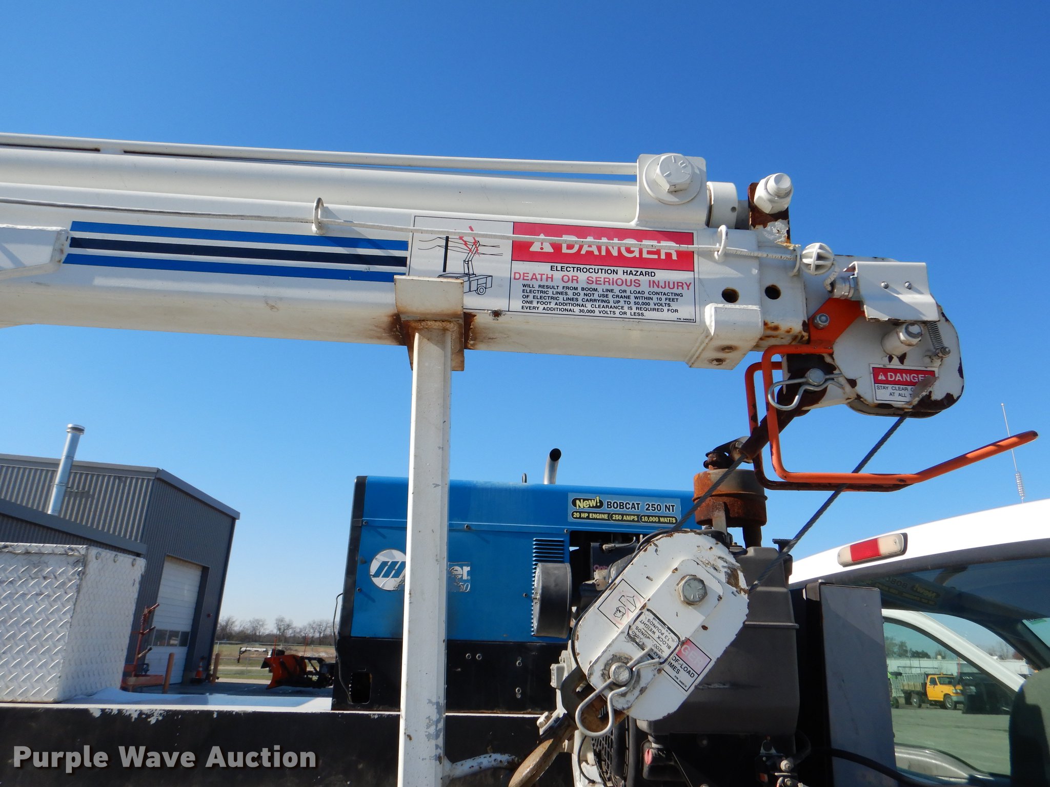 Purple Wave is selling a used Service Truck in Kansas. This item is a 1999 Ford F450 Super Duty service truck with crane with the following: 100,262 miles on odometer, 7.3L V8 turbo diesel engine, Automatic transmission, Four wheel drive, Single axle, AC and heat, AM/FM/CD, Front tow hooks, Knapheide service bed, 9'L, Shelving, Mounted vise, Miller Bobcat 250NT welder/generator, 127 hours on meter, Onan 20 HP gas engine, 240V outlet, (4) 120V outlets, 10,000 watt, CC, CV, and stick capabilities, Ingersoll Rand air compressor, Kohler Command 11 HP gas engine,, Auto Crane 3203 crane, 15' boom length, 3,200 lbs max lift capacity, Remote control, Single fuel tank, Spring suspension, Hydraulic brakes, 225/70R19.5 tires, GVWR 15,000 lbs