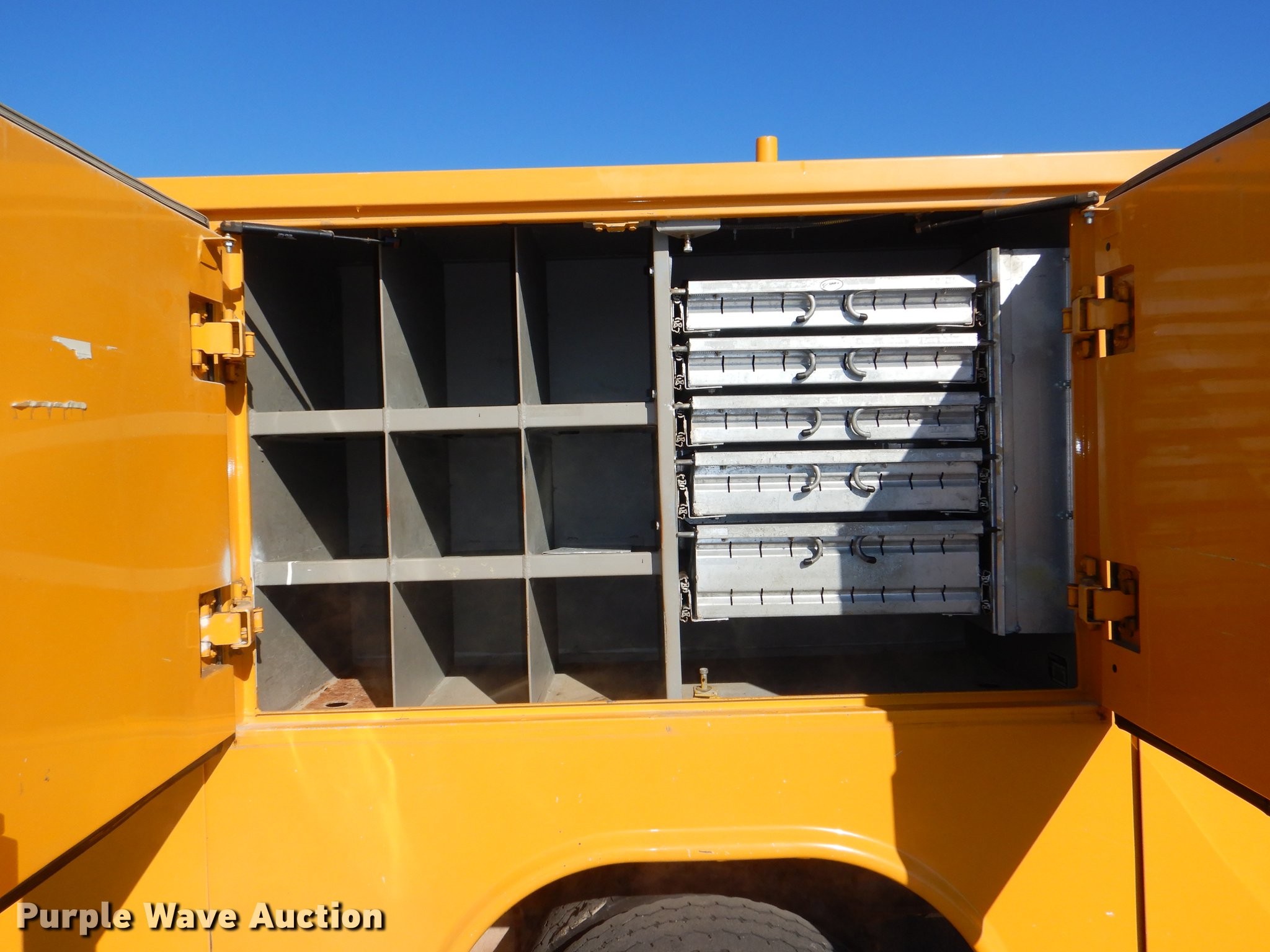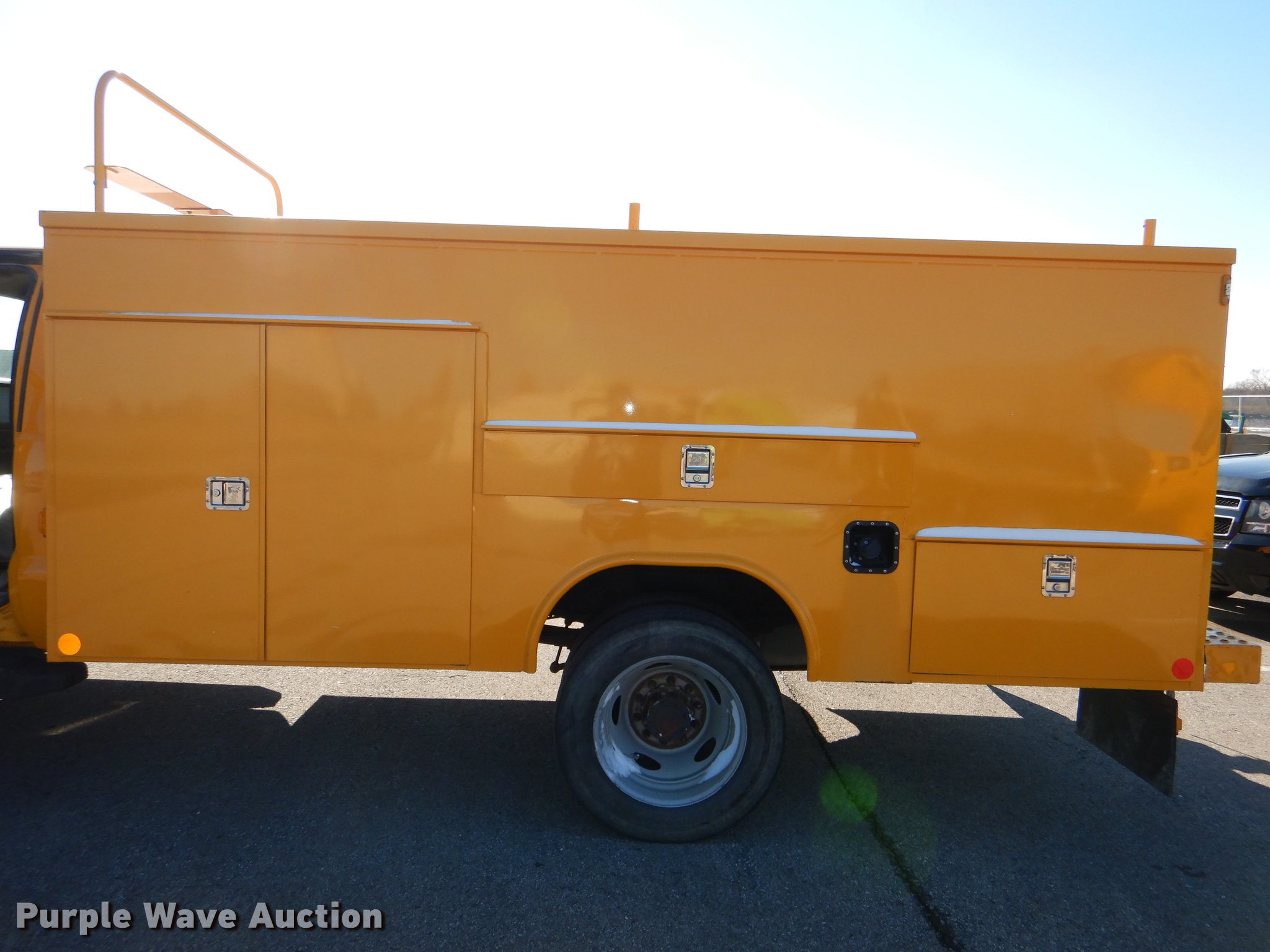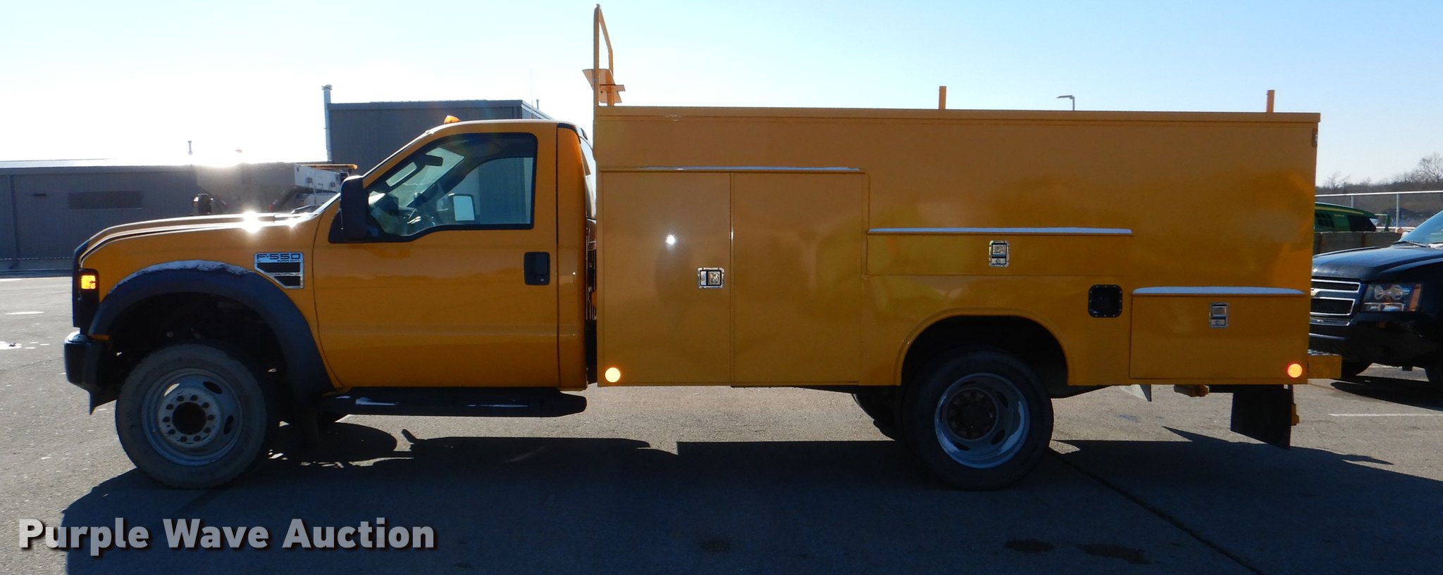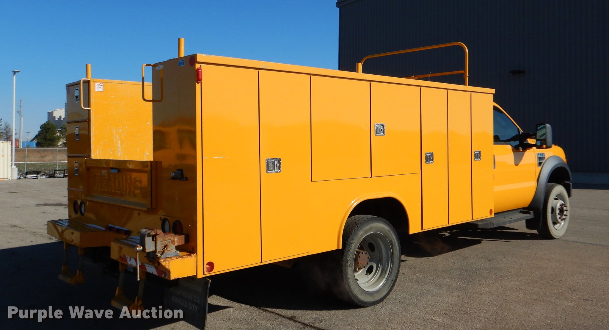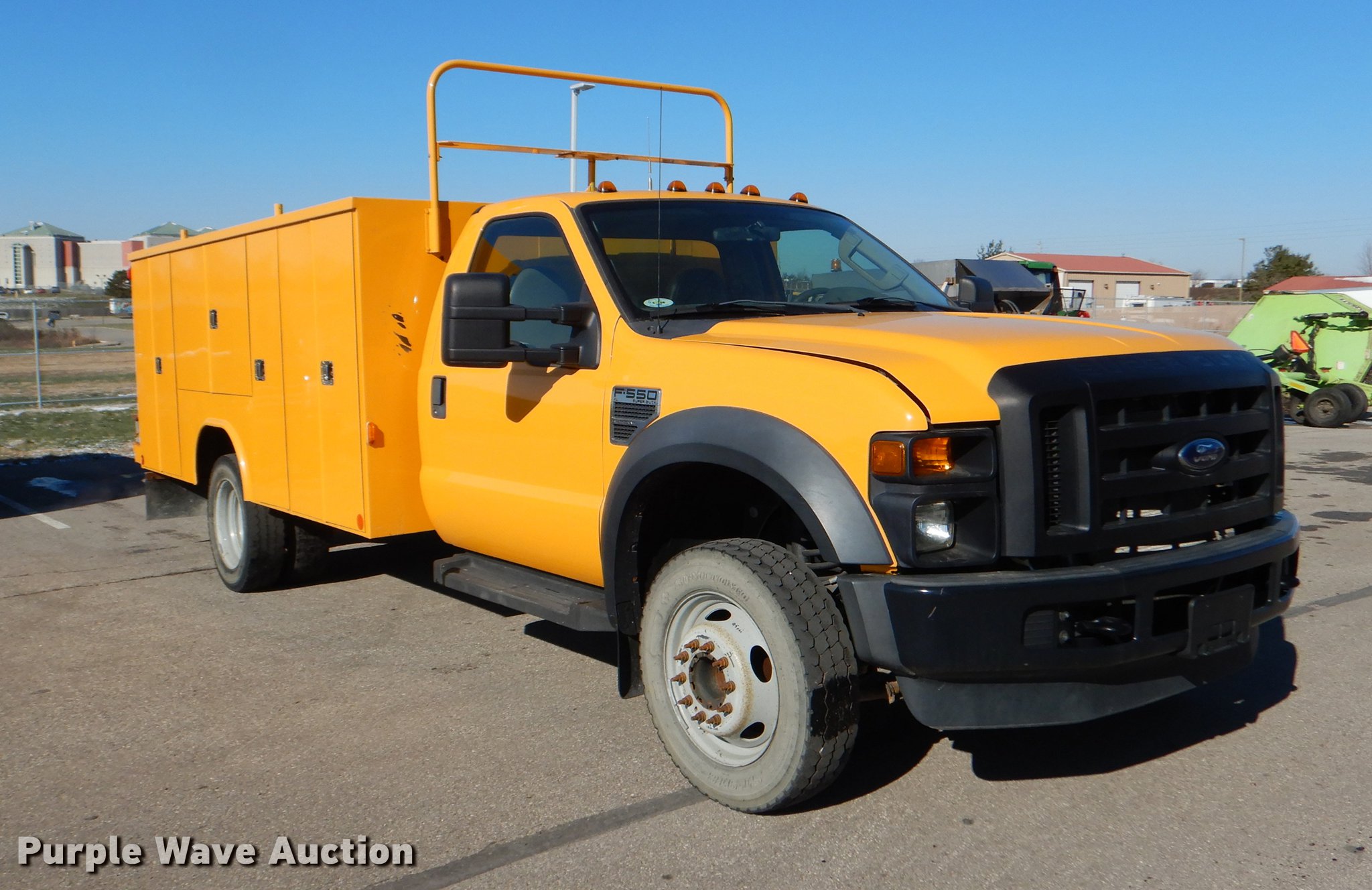 Purple Wave is selling a used Service Truck in Kansas. This item is a 2008 Ford F550 utility truck with the following: 103,542 miles on odometer, 6.8L V10 SOHC 30V gas engine, Automatic transmission, AC and heat, AM/FM, Vinyl interior, Front tow hooks, Running boards, Reading utility bed, 12.5'L x 94.5"W, Vise, Receiver hitch, 225/70R19.5 tires