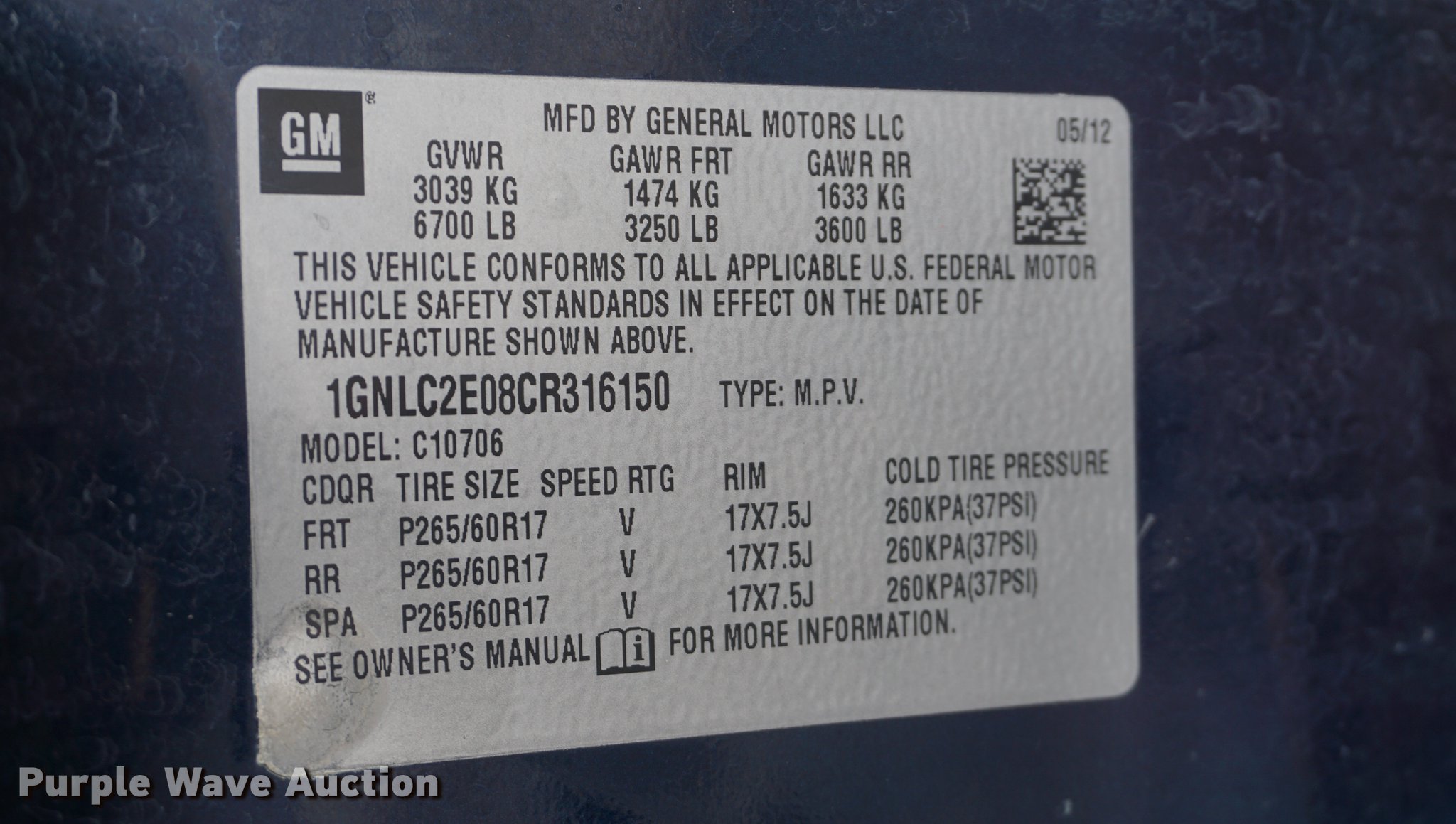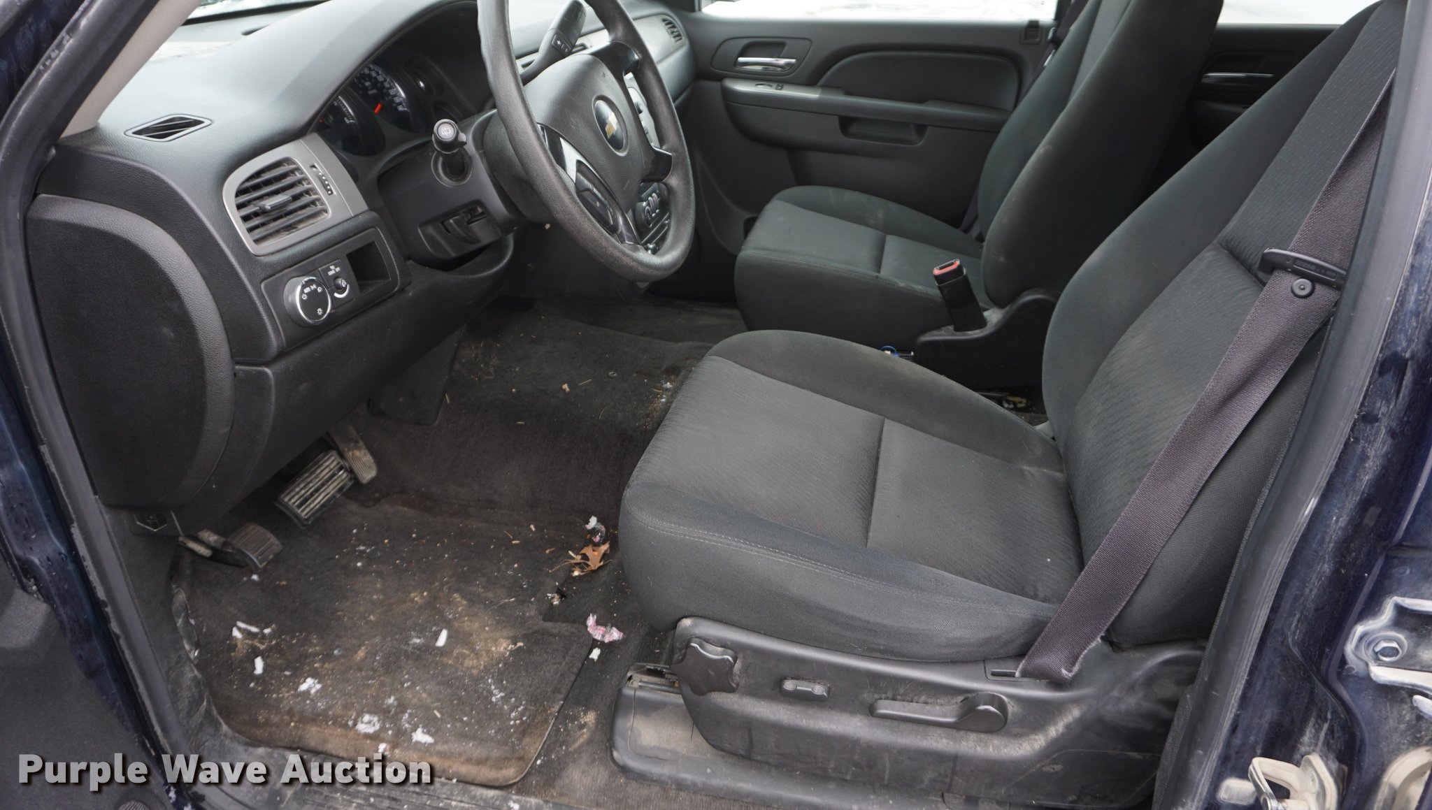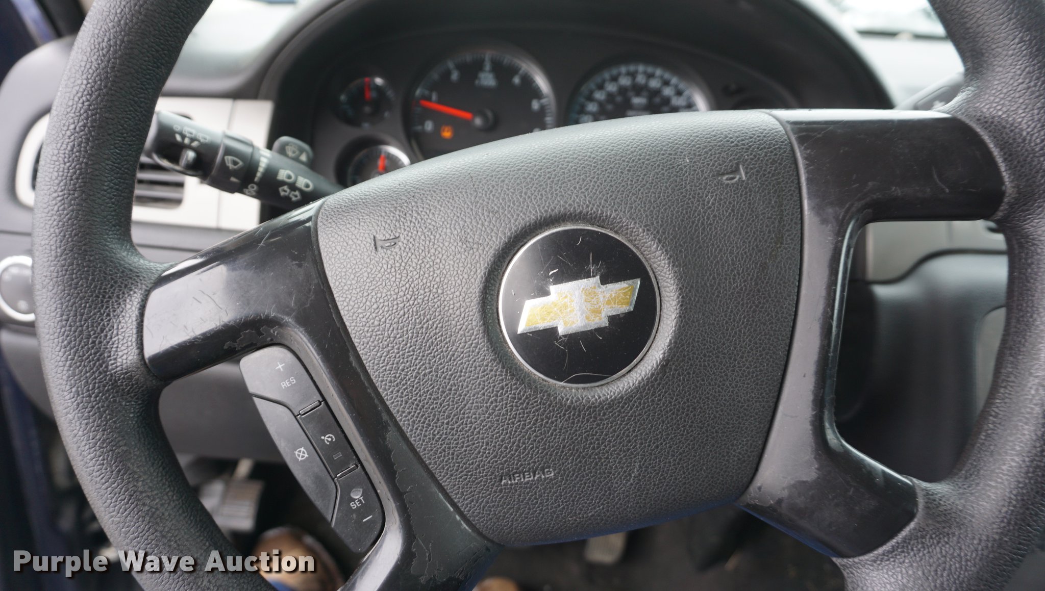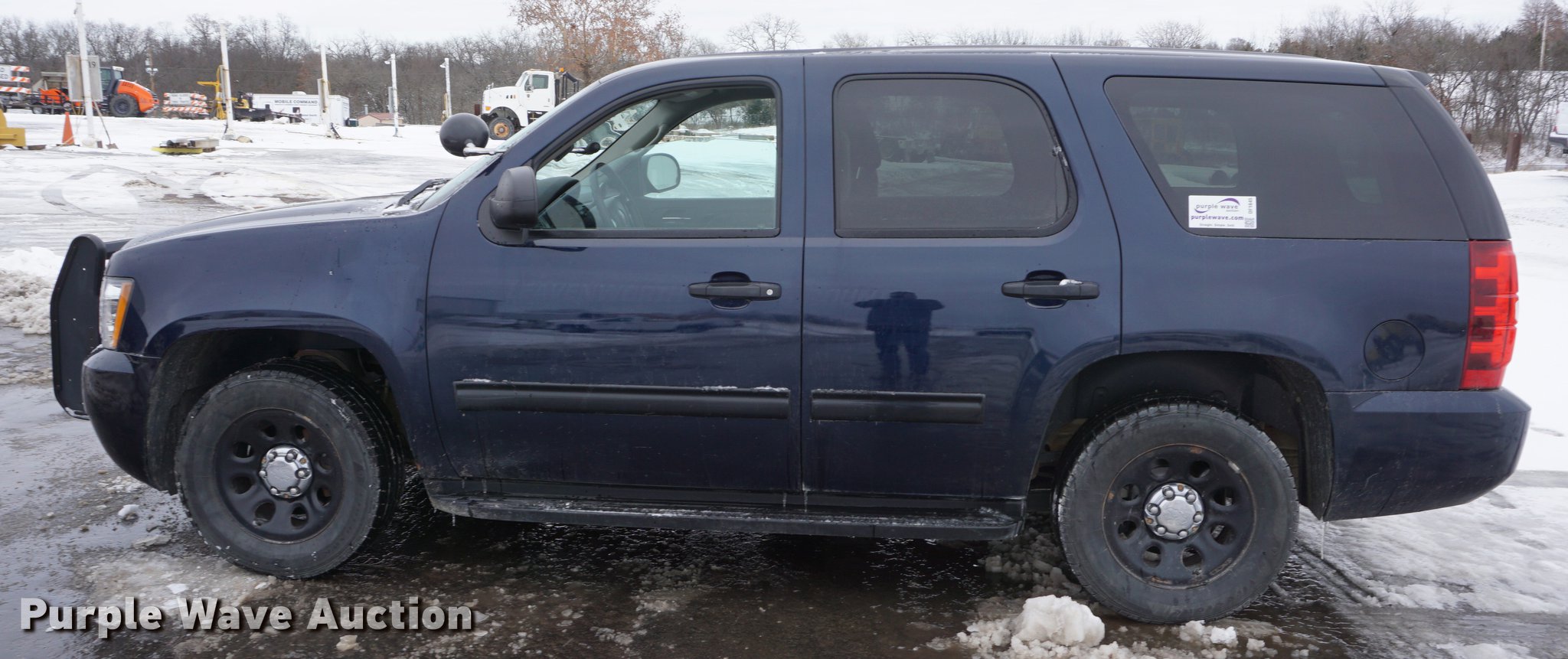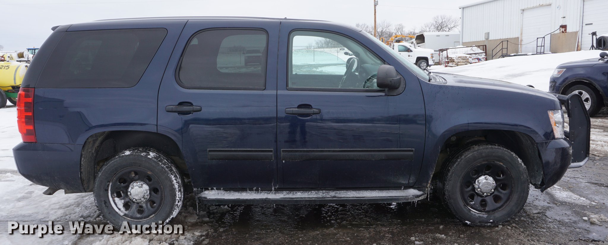 Purple Wave is selling a used Passenger Vehicle in Kansas. This item is a 2012 Chevrolet Tahoe Police SUV with the following: 149,491 miles on odometer, 5.3L V8 OHV 16V FFV gas engine, Automatic transmission, AC and heat, Tilt, Cruise, AM/FM/CD, Power windows, locks, mirrors, and seat, Cloth front interior, Vinyl rear interior, Spotlight, Running boards, Grill guard, 265/60R17 tires