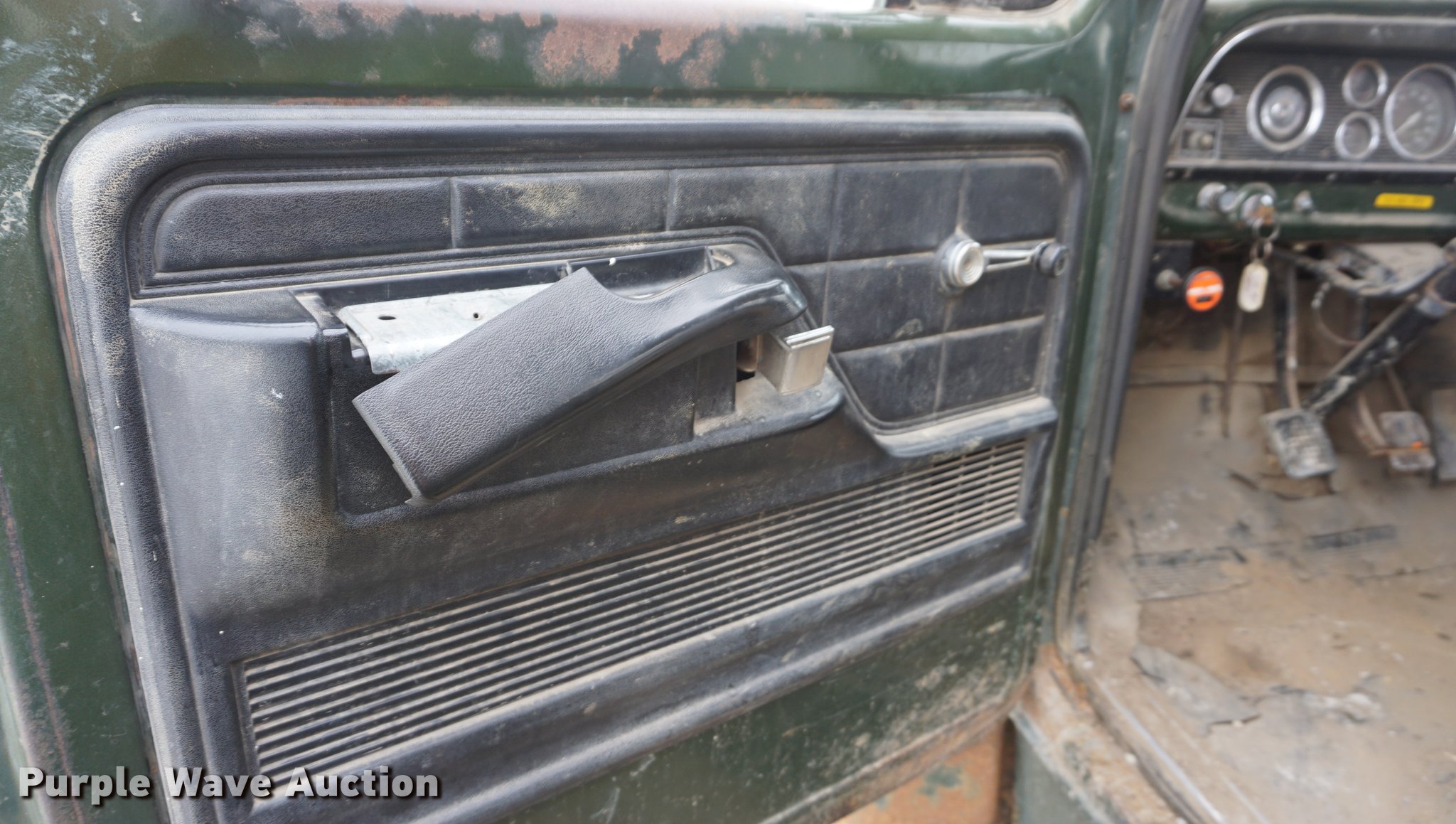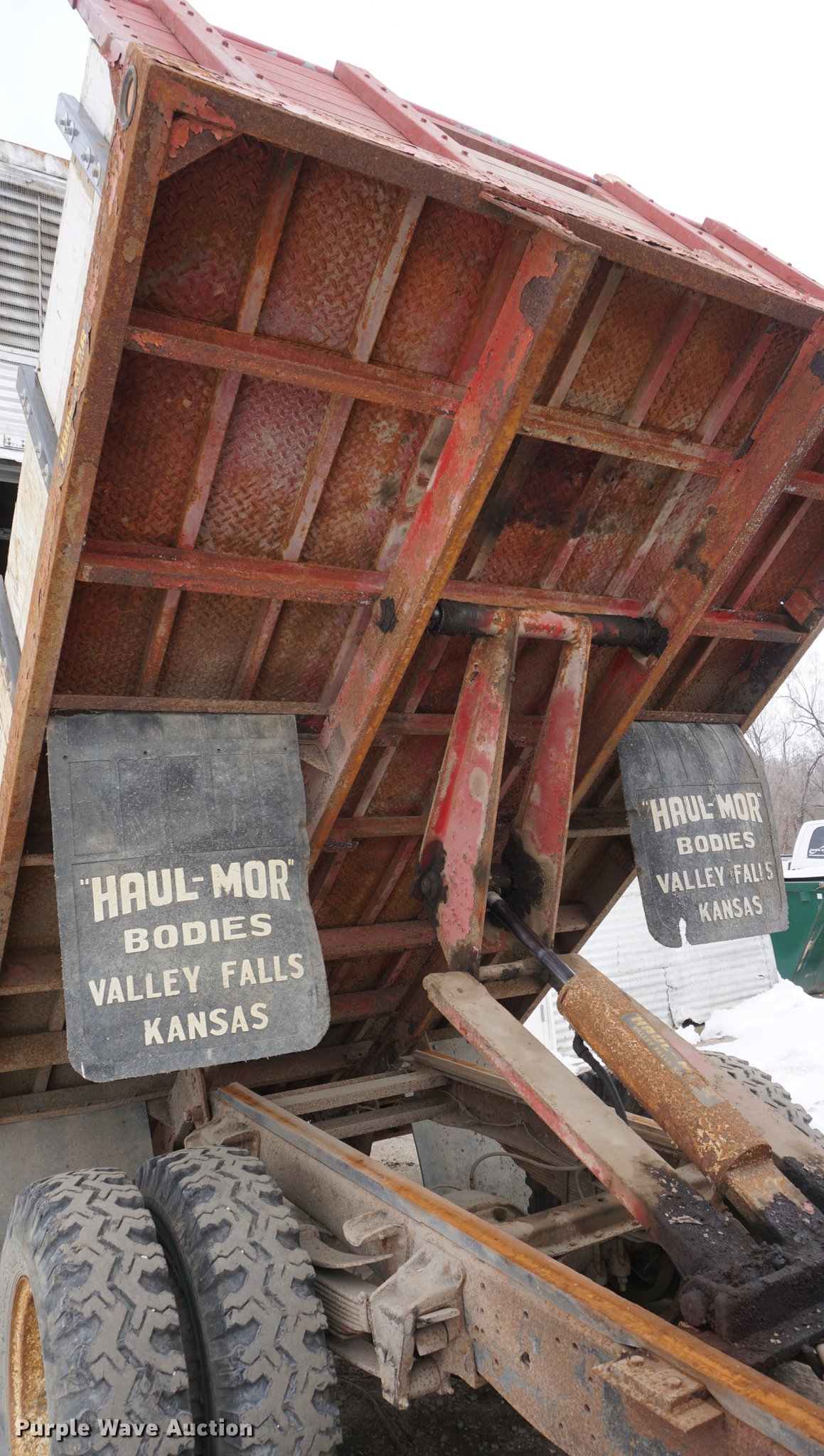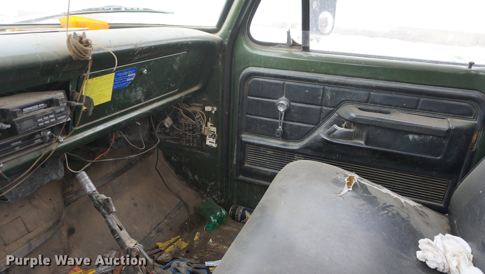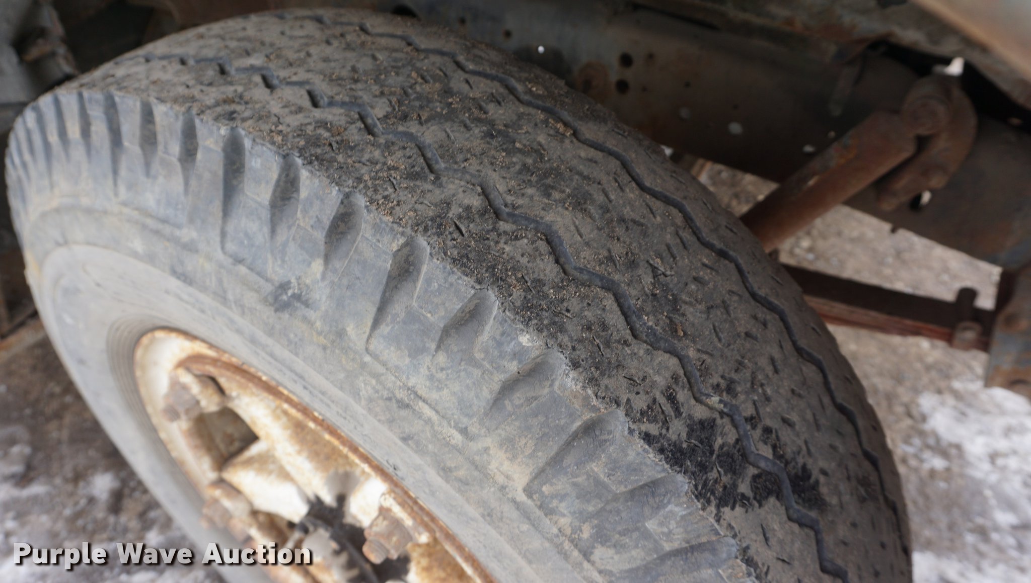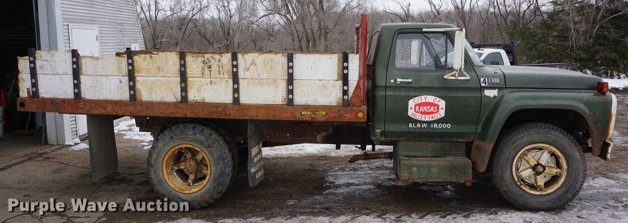 Purple Wave is selling a used Construction Dump Truck in Kansas. This item is a 1976 Ford F600 dump truck with the following: 83,051 miles on odometer, Ford 358 C.I.D. V8 gas engine, Five speed manual transmission, Two speed rear end, Single axle, Heat, AM/FM, PTO, 13.5'L x 93"W steel dump bed, 22" side board height, Single ram hoist, Single fuel tank, Pin hitch, Spring suspension, Hydraulic brakes, 9.00-20 tires, Brake issues, King pins worn