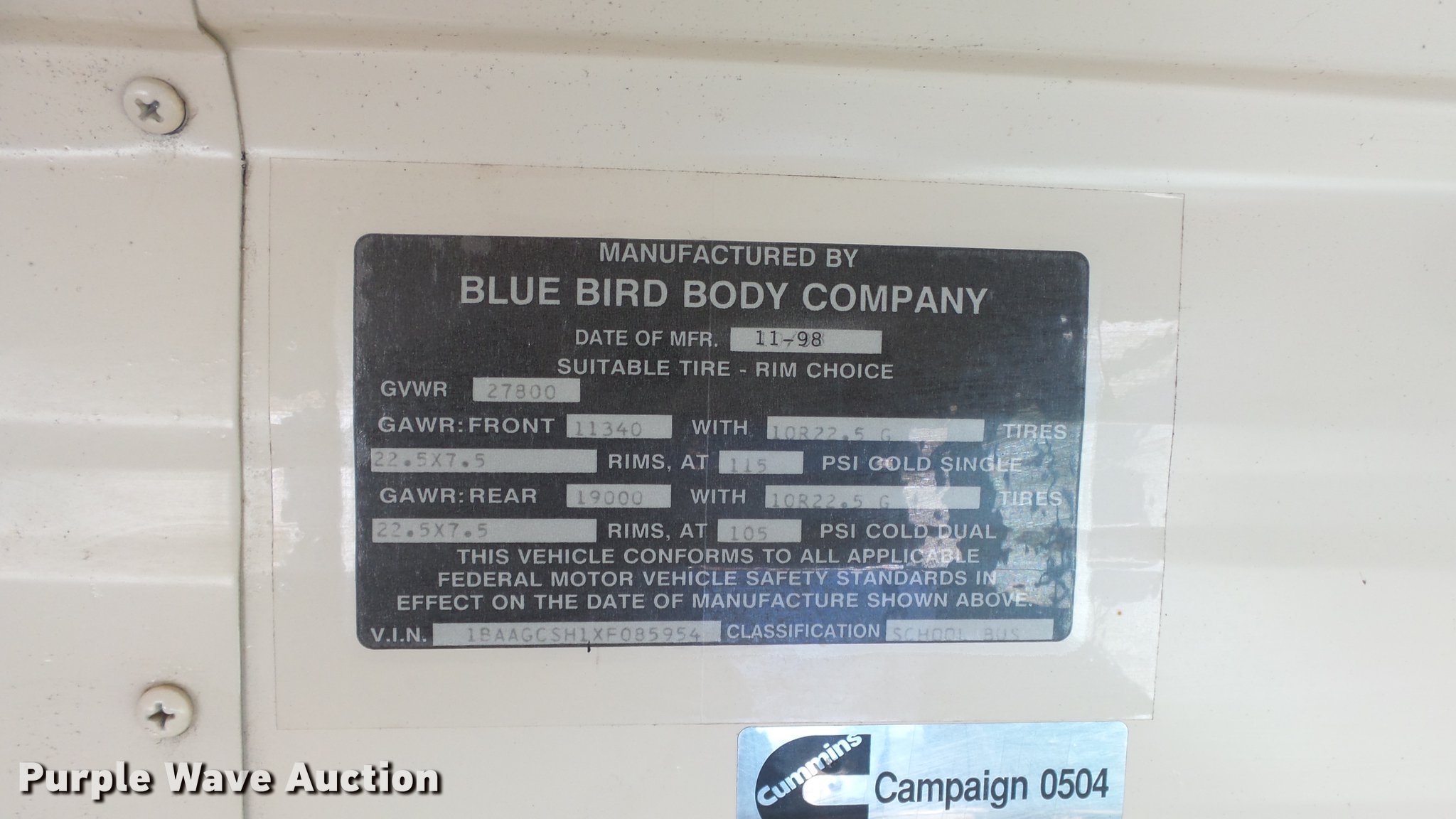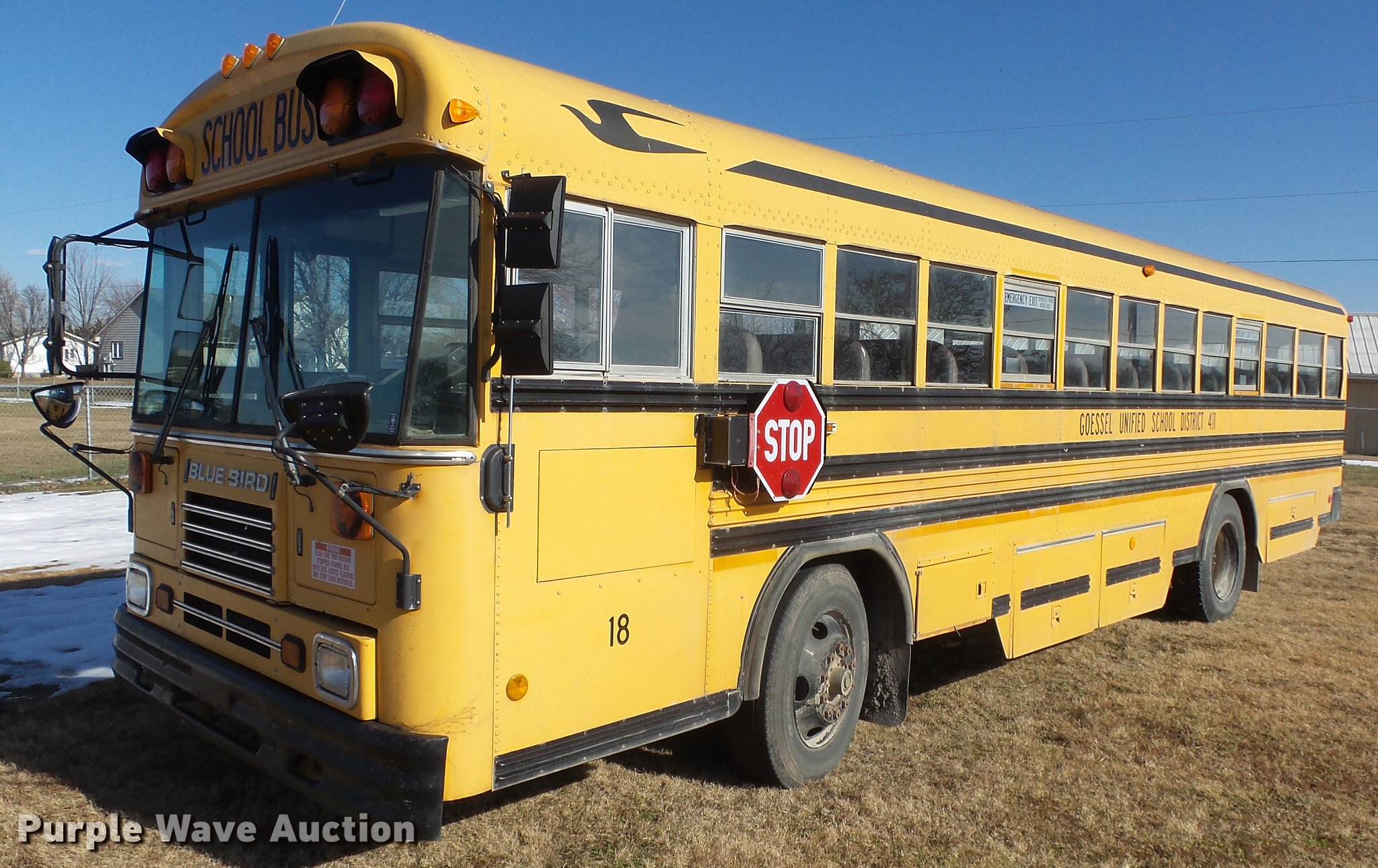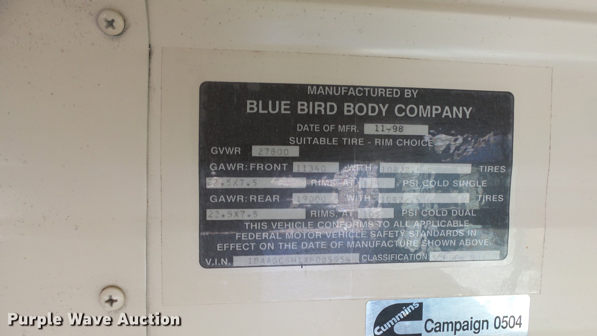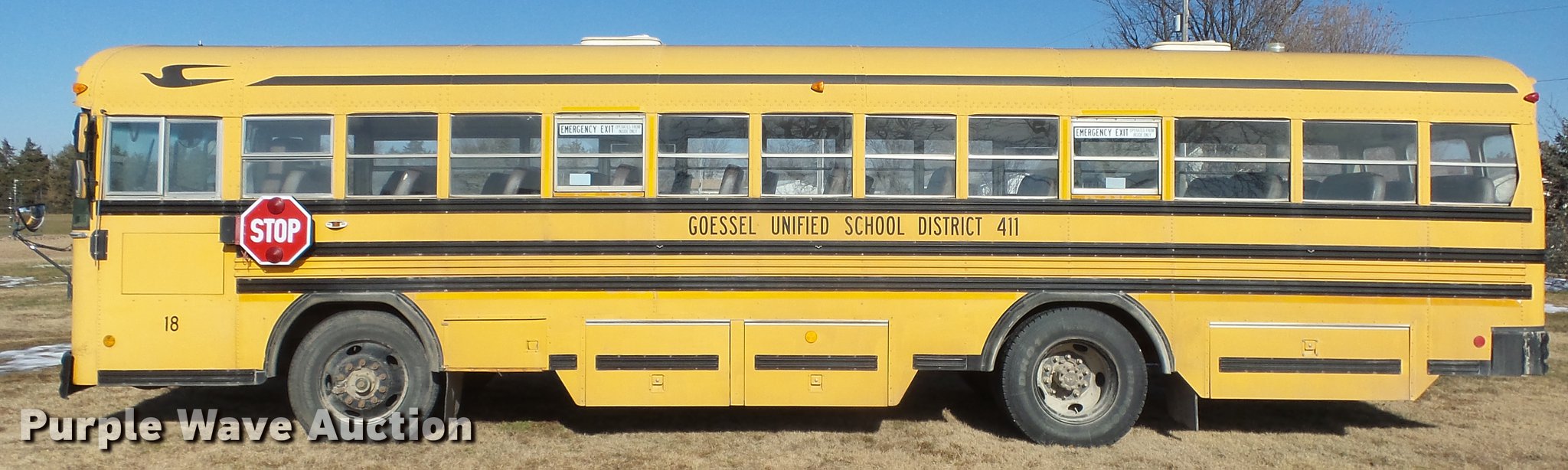 Purple Wave is selling a used Bus in Kansas. This item is a 1999 Blue Bird TC2000 school bus with the following: 169,965 miles on odometer, Cummins ISB 5.9L L6 diesel engine, Automatic transmission, Heat, AM/FM, Vinyl interior, 66 passenger capacity, Rear, side, and roof emergency exits, Spring suspension, Hydraulic brakes, 10R22.5 tires