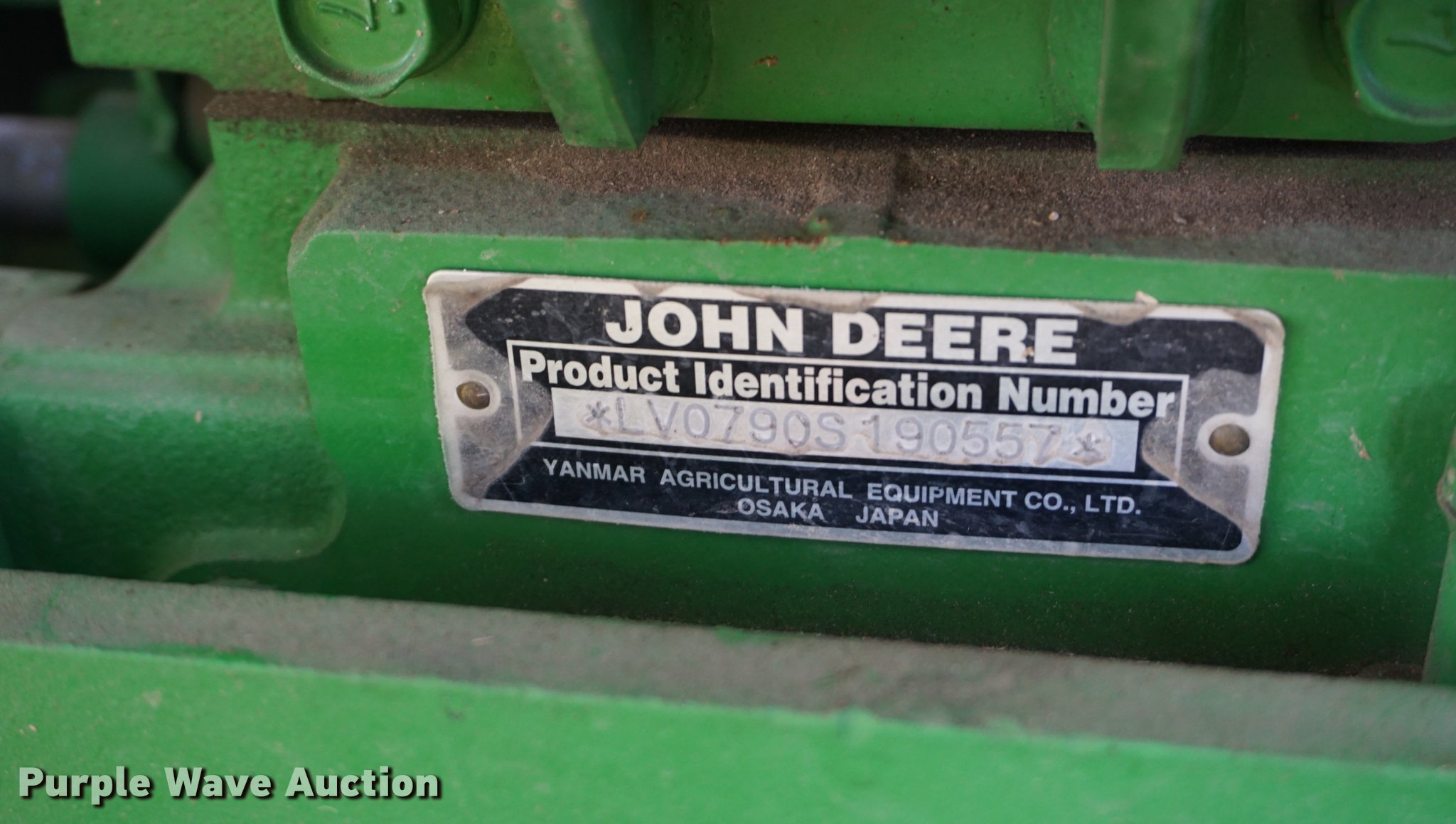Purple Wave is selling a used Tractor in Kansas. This item is a 2007 John Deere 790 tractor and finish mower with the following: 431 hours on meter, Yanmar 3TNV82A-L 1.331L three cylinder diesel engine, 20 HP, Manual transmission, 8F-2R gears, John Deere 300 loader, 62"W bucket, Joystick controls, Three point, Top link, 540 PTO, Rear hydraulic remote set, John Deere 272 finish mower, 72"W, 540 PTO, Three point, 25x8.50-14 front tires, 13.6-16 rear tires, Serial LV790S190557