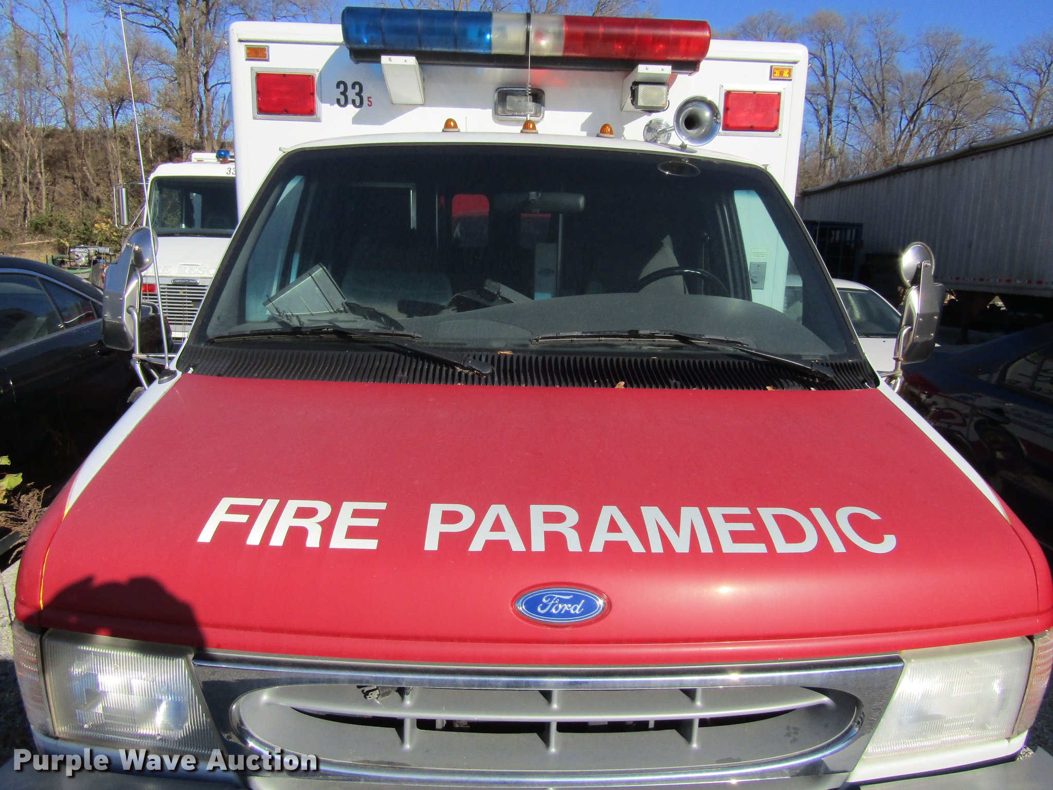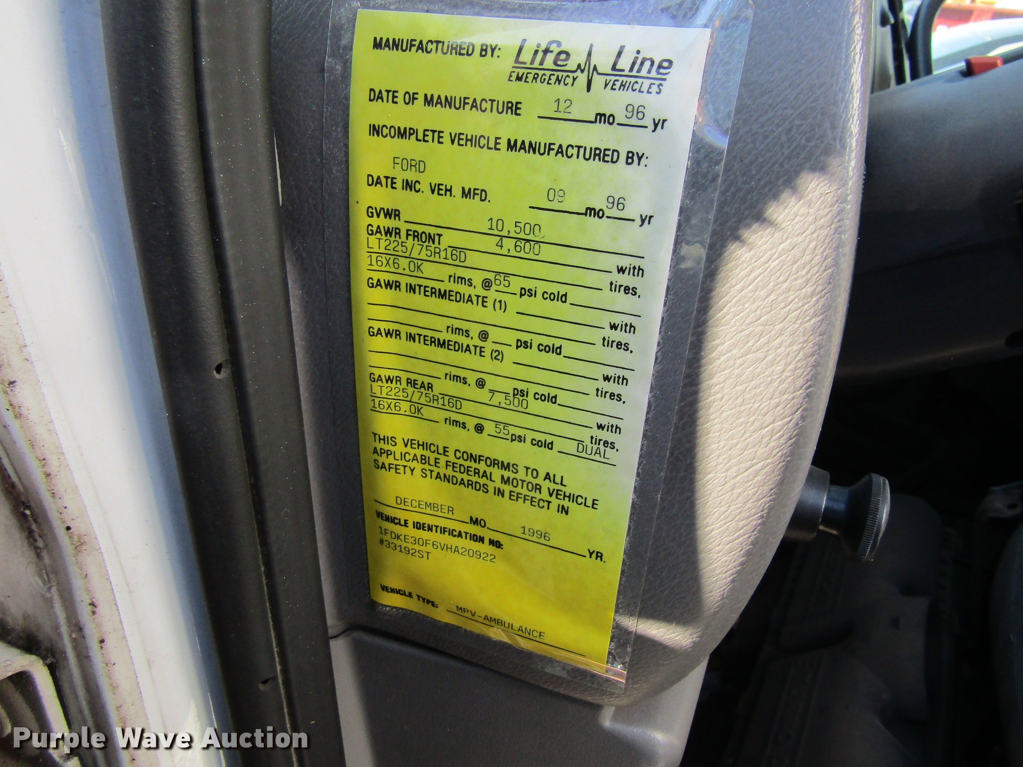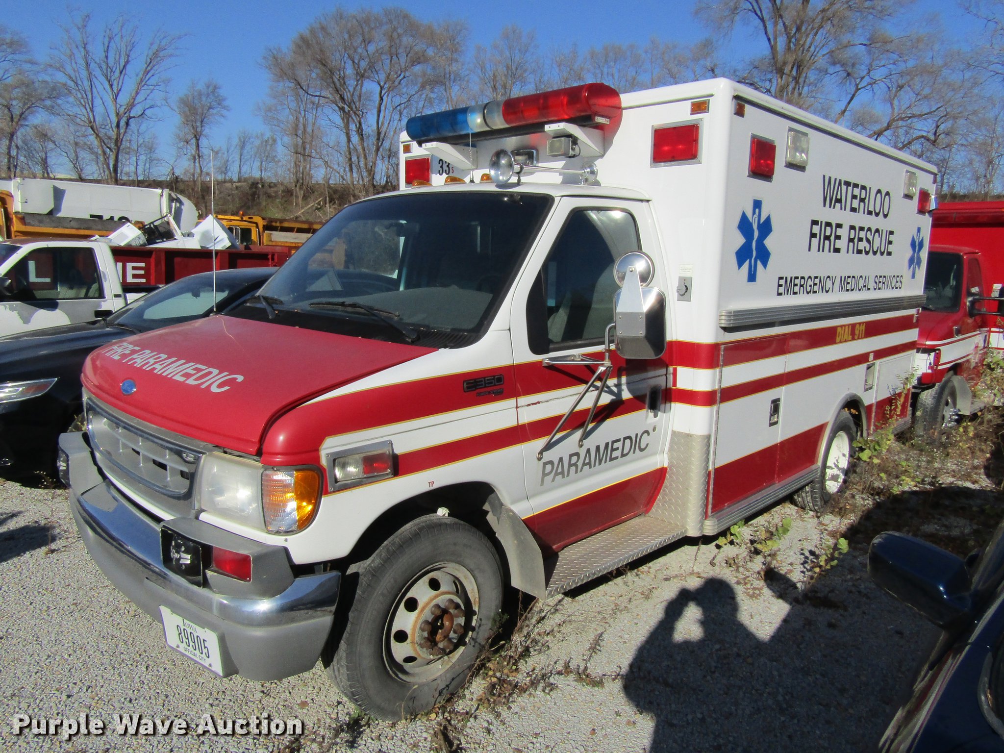 Purple Wave is selling a used Fire Truck or Emergency Vehicle in Iowa. This item is a 1997 Ford Econoline E350 ambulance with the following: 141,878 miles on odometer, 8,561 hours on meter, 7.3L V8 OHV 16V diesel engine, Automatic transmission, Single axle, AC and heat, AM/FM, Power windows and locks, Suspension seat, Emergency lights and sirens, Life Line body, 225/75R16 tires, GVWR 10,500 lbs, Non-operational unit