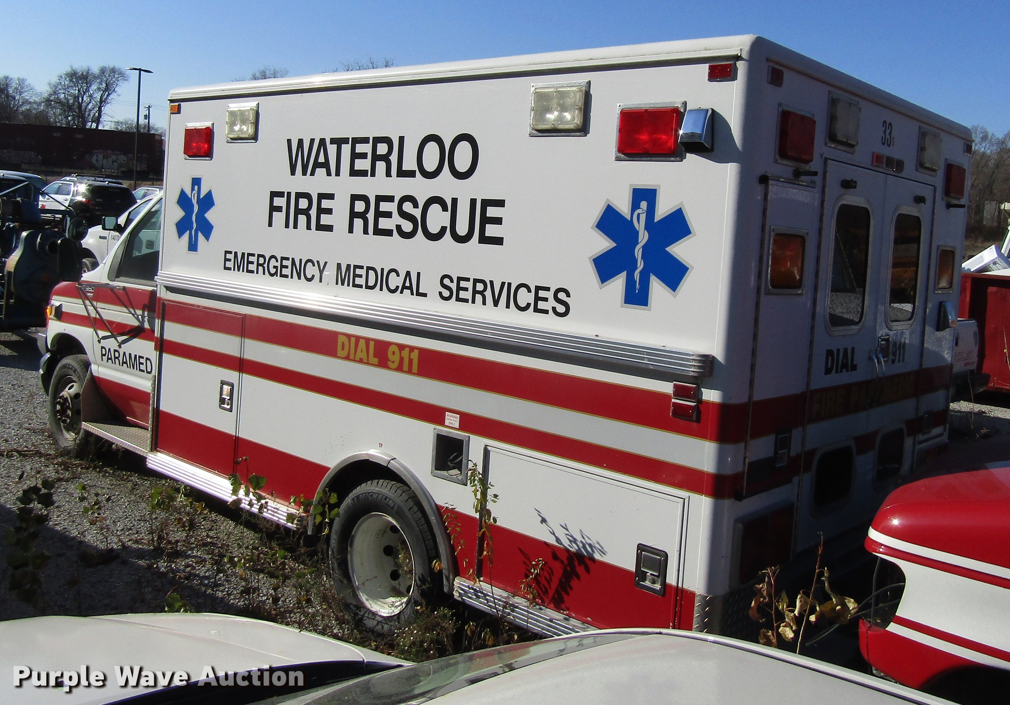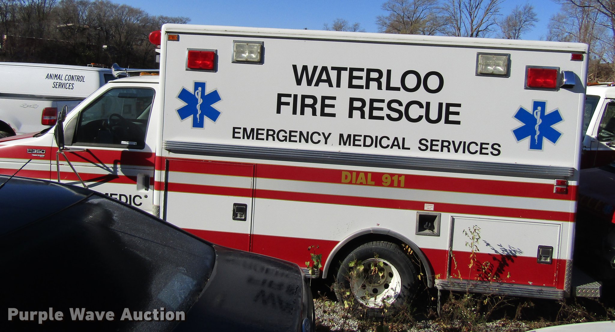 1997 Ford Econoline E350 ambulance. 141,878 miles on odometer, 8,561 hours on meter, 7.3L V8 OHV 16V diesel engine, Automatic transmission, Single axle, AC and heat, AM/FM, Power windows and locks, Suspension seat, Emergency lights and sirens, Life Line body, 225/75R16 tires, GVWR 10,500 lbs, Non-operational unit. Iowa title. 1FDKE30F6VHA20922. City of Waterloo. 625 Glenwood St. Waterloo, IA 50703