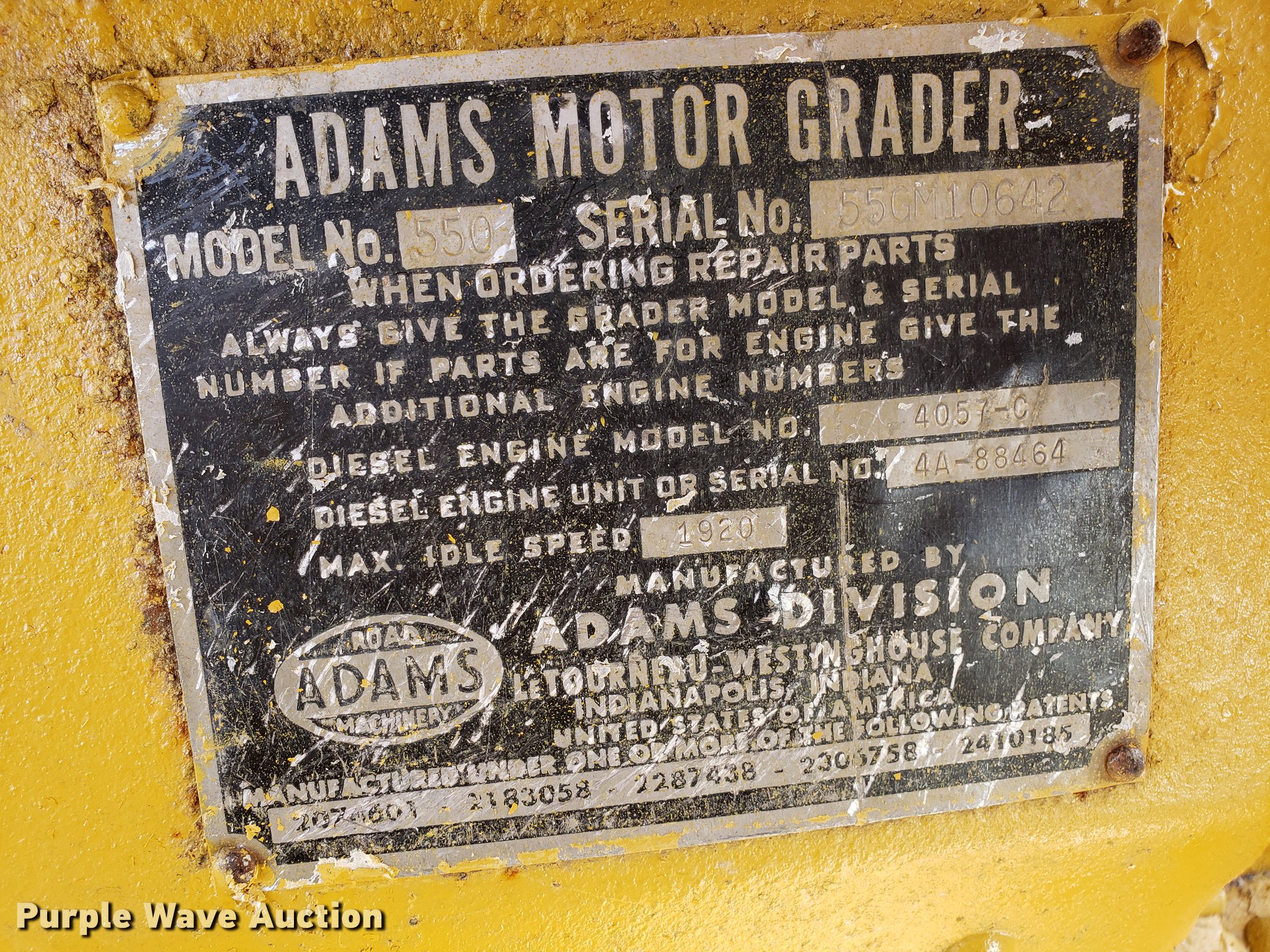 Purple Wave is selling a used Motor Grader in Missouri. This item is a Adams 550 rigid frame motor grader with the following: Detroit Diesel 4057-C four cylinder diesel engine, Serial 4A88464, Direct-drive transmission, 8F-4R gears, 12'W moldboard, Mid-mounted scarifier, (7) teeth, 13R24 tires, Scarifier inoperable, Serial 55GM10642
