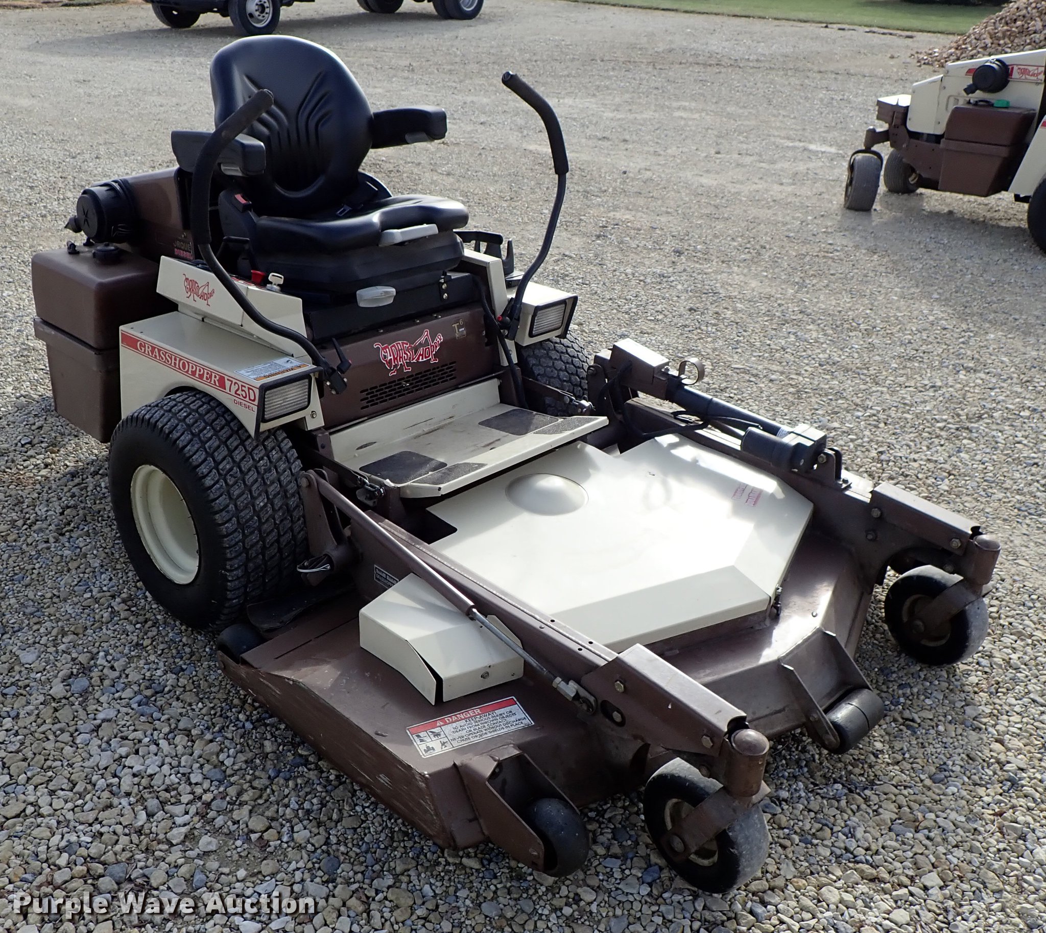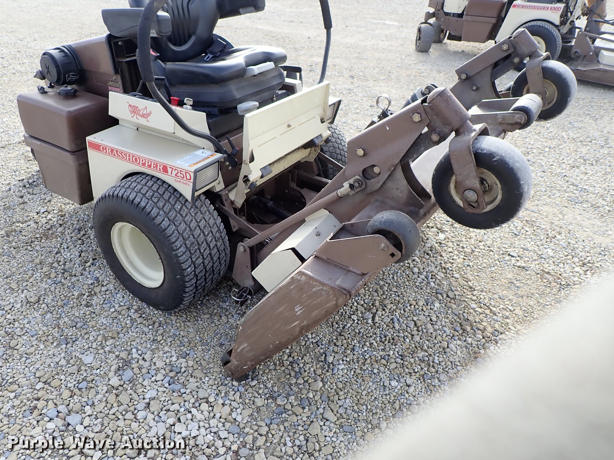 Purple Wave is selling a used Commercial Turf Mower in Kansas. This item is a Grasshopper 725D ZTR lawn mower with the following: 2,556 hours on meter, 61" cut, Kubota D902 three cylinder diesel engine, Hydrostatic transmission, Work lights, Electric folding deck, 22x10.00-10 tires, Serial 6043834