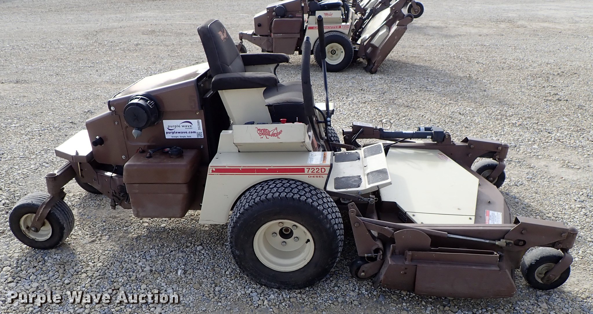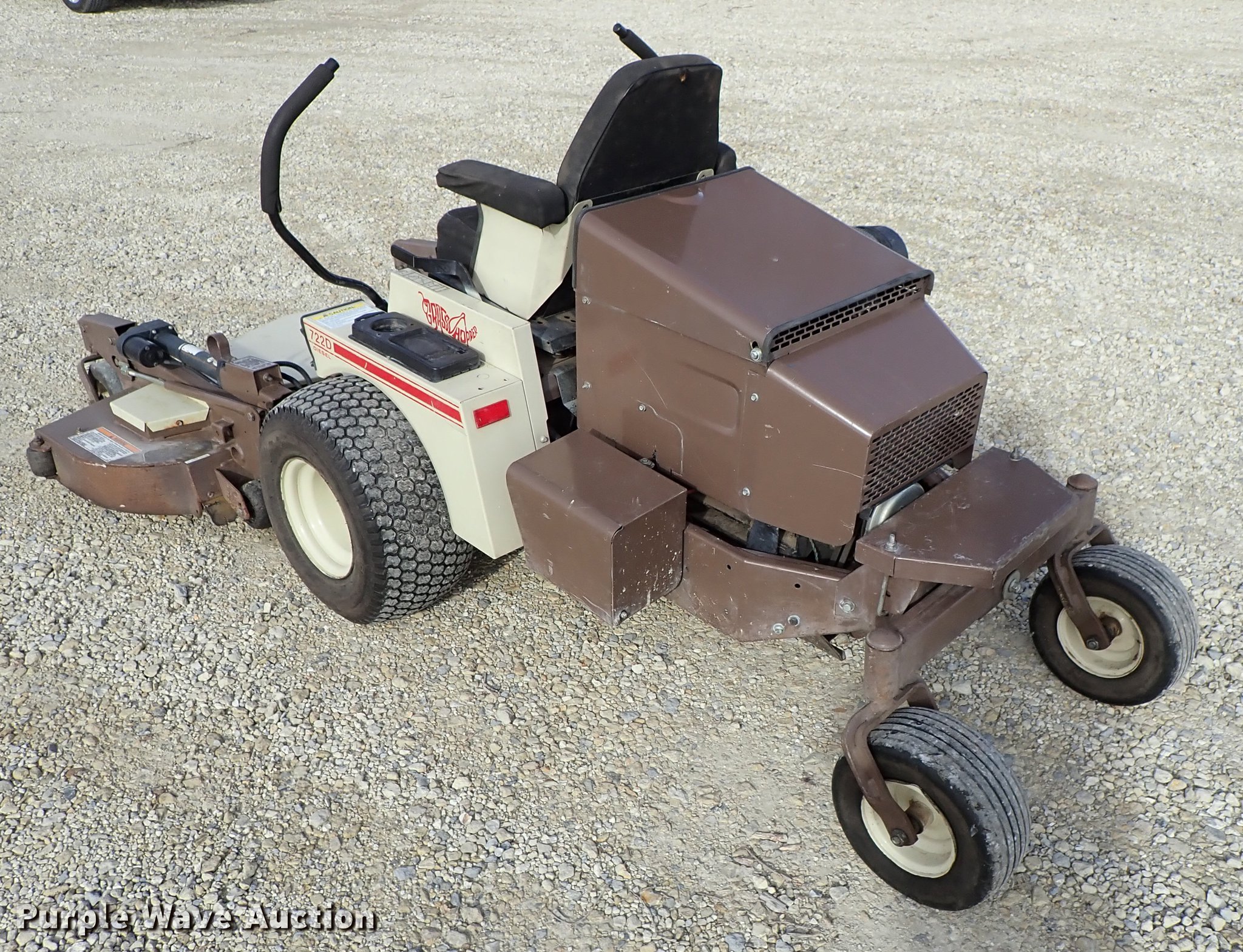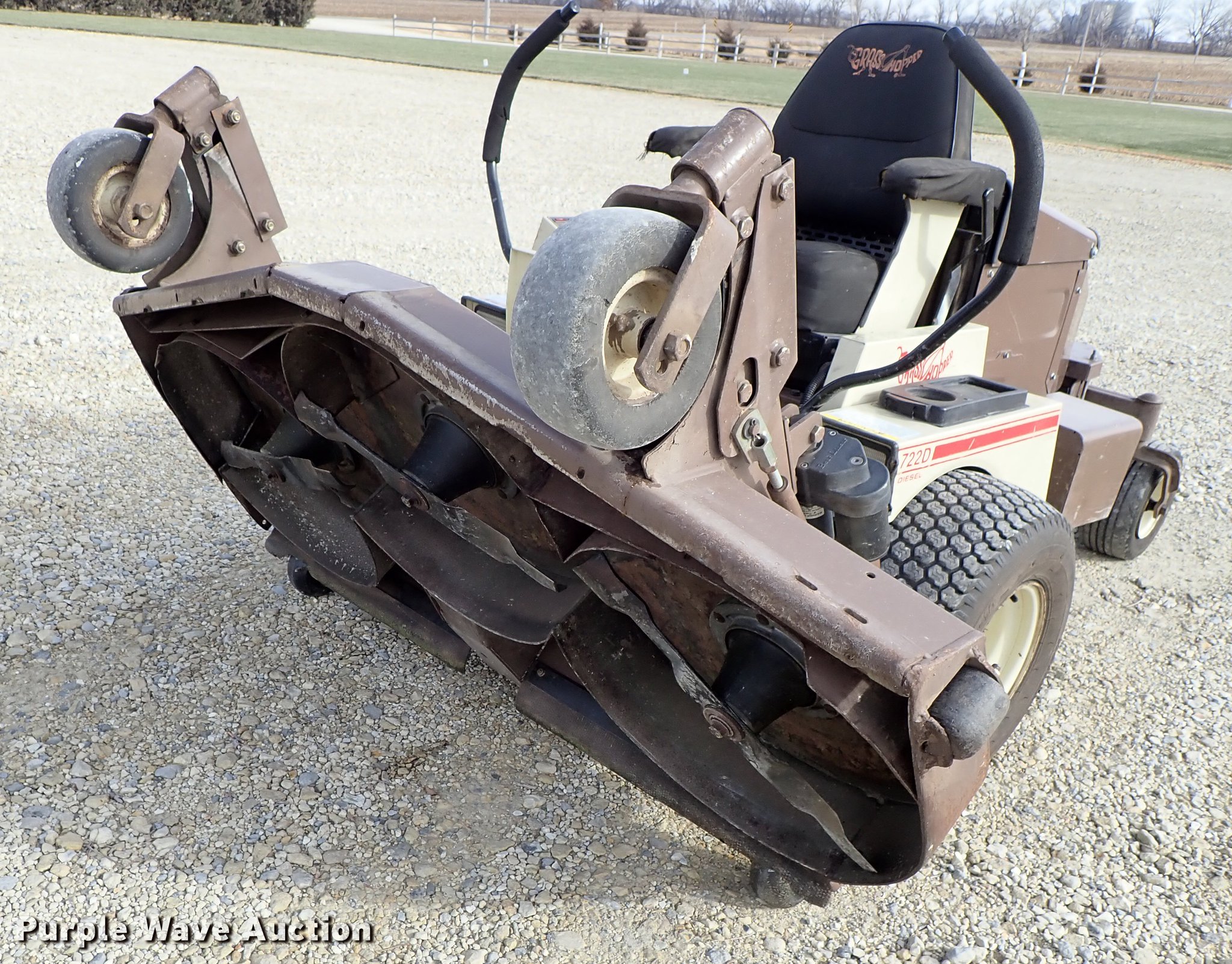 Purple Wave is selling a used Commercial Turf Mower in Kansas. This item is a Grasshopper 722D ZTR lawn mower with the following: 1,850 hours on meter, 61" cut, Kubota D902-E three cylinder diesel engine, Hydrostatic transmission, Work lights, Electric folding deck, 22x10.00-10 tires, Serial 6042427