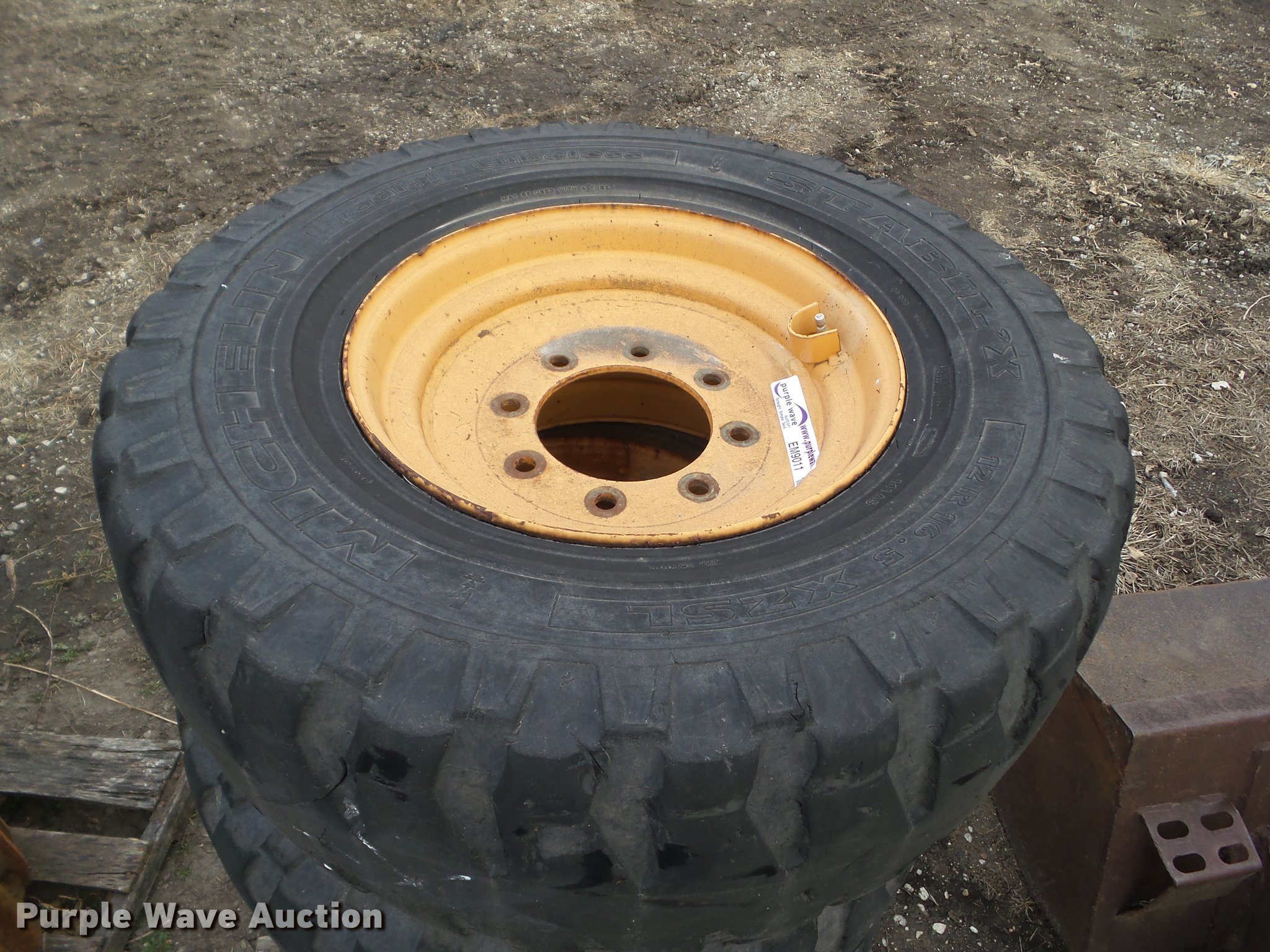 Purple Wave is selling a used Industrial Tires or Tracks in Iowa. This item is a (4) Michelin 12R16.5 skid steer tires and wheels with the following: Removed from Case 90XT skid steer