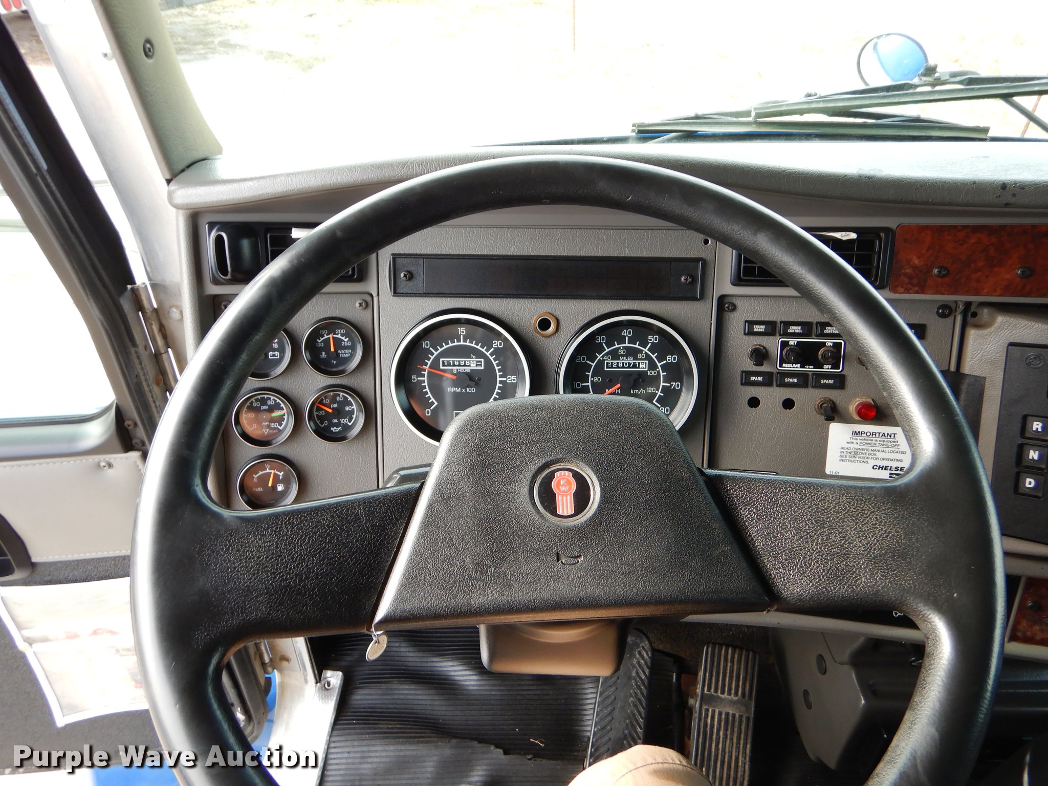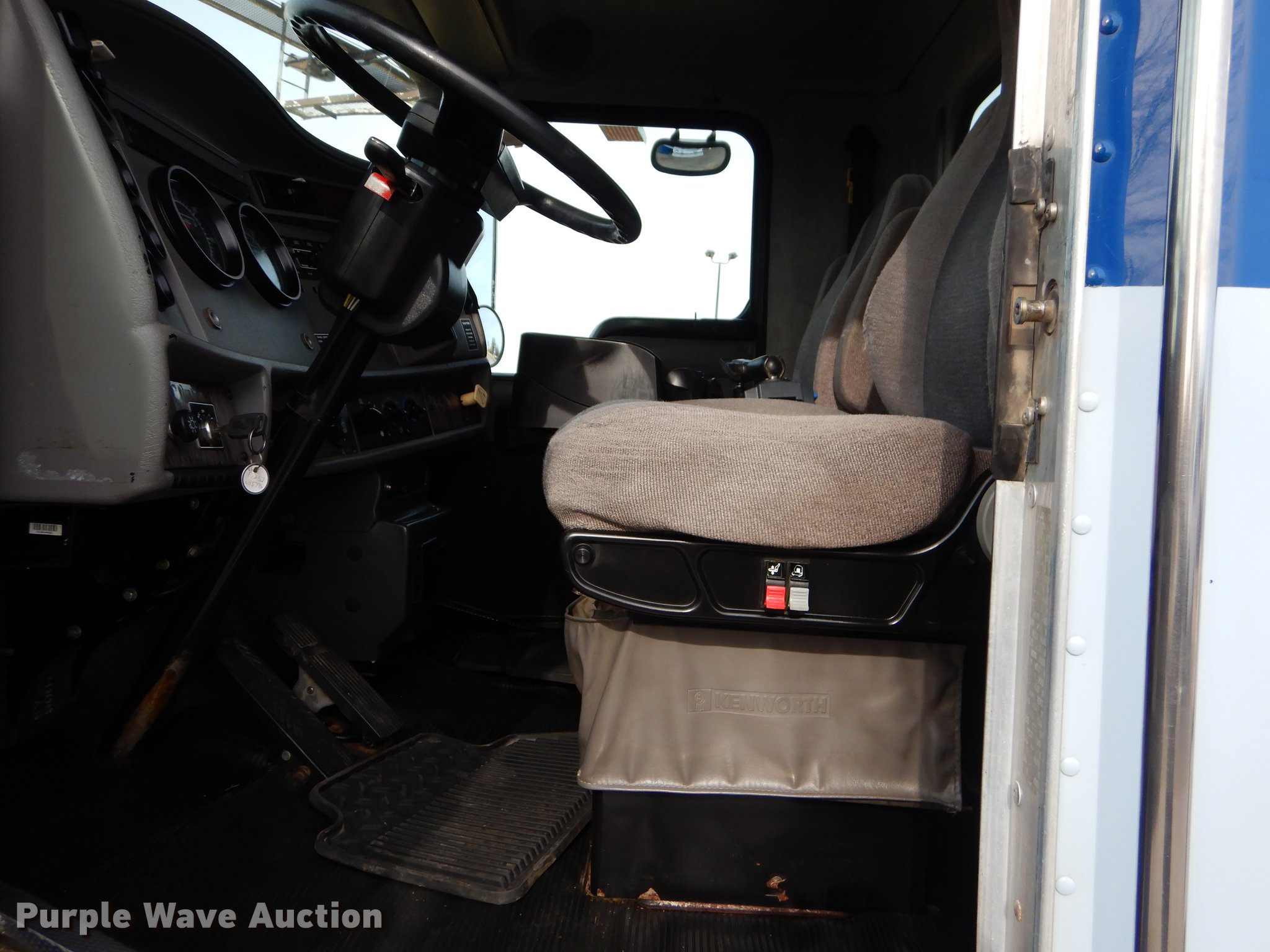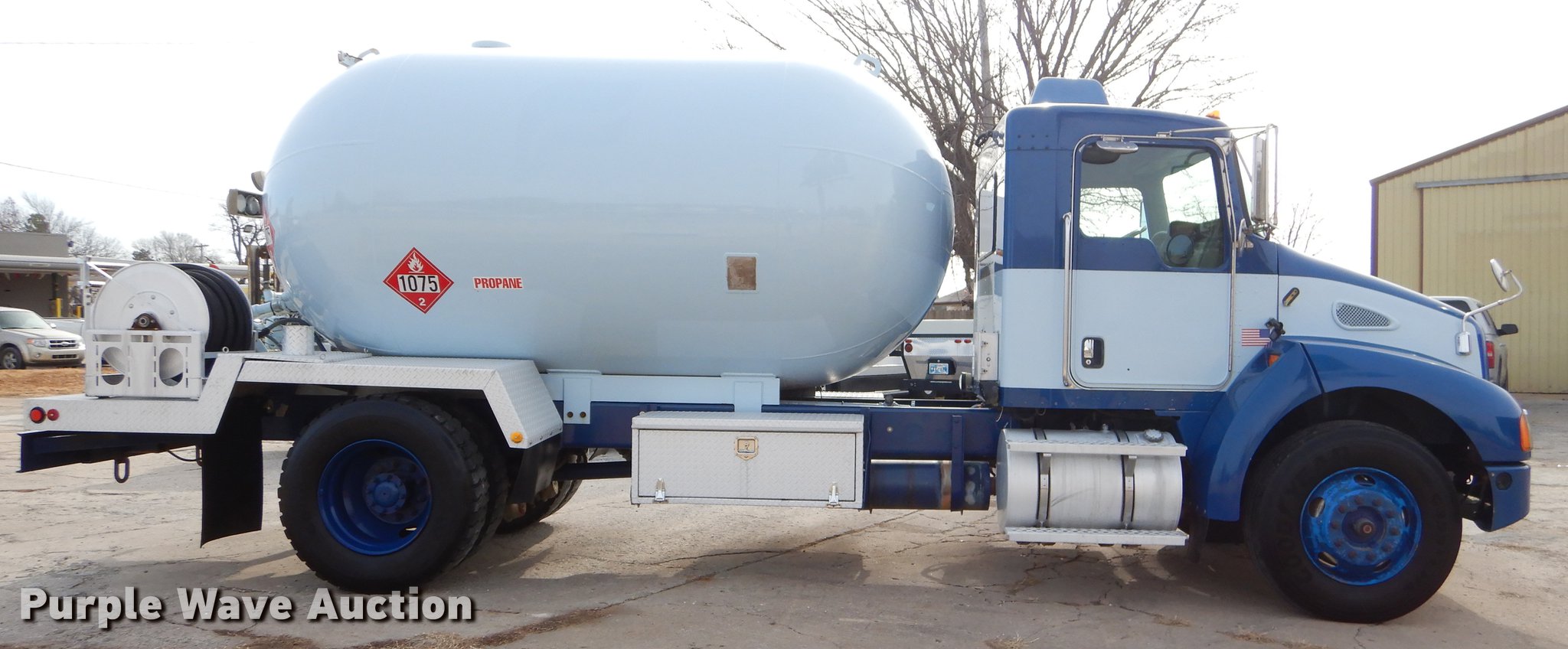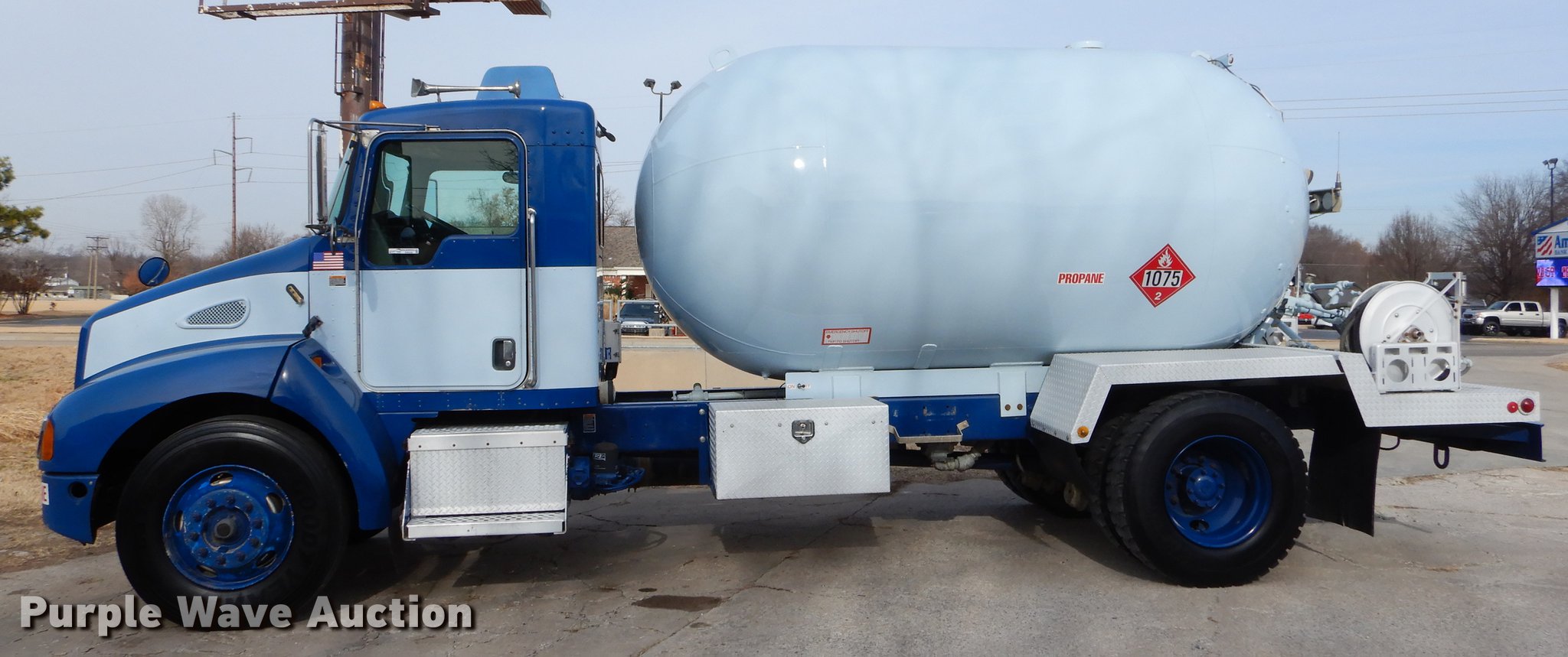 Purple Wave is selling a used Fuel Truck in Oklahoma. This item is a 2005 Kenworth T300 propane fuel truck with the following: 228,071 miles on odometer, 11,698 hours on meter, Caterpillar C7 7.2L L6 turbo diesel engine, Allison automatic transmission, Cruise, AM/FM/CD, Manual windows, Heated mirrors, Backup alarm, Front and rear tow hooks, Rear work lights, Propane delivery bed, 2,400 gallon, Hose reel, Pump, Air brakes, Engine brake, Spring suspension, 11R22.5 tires, Unit may not be used as a commercial delivery truck